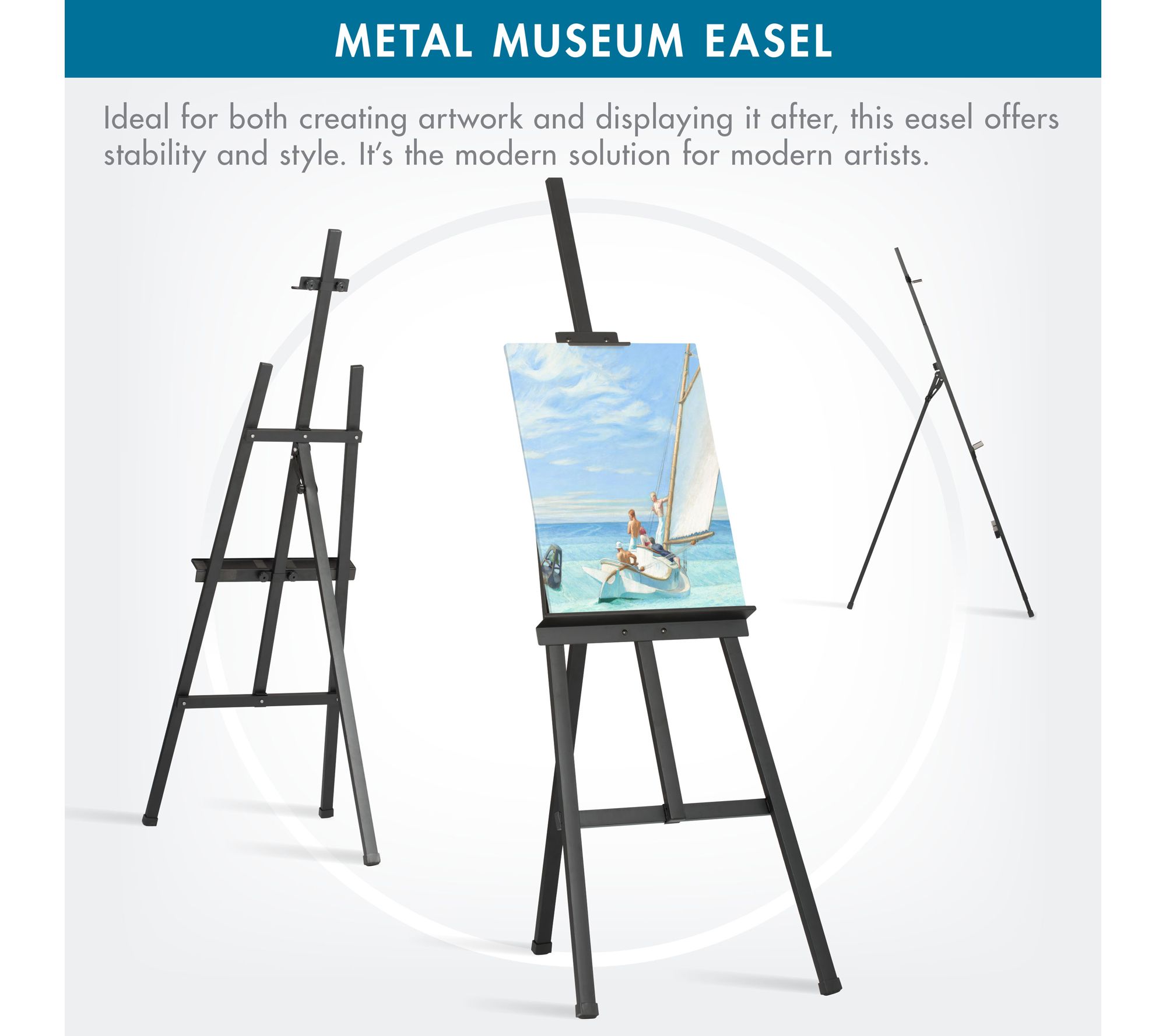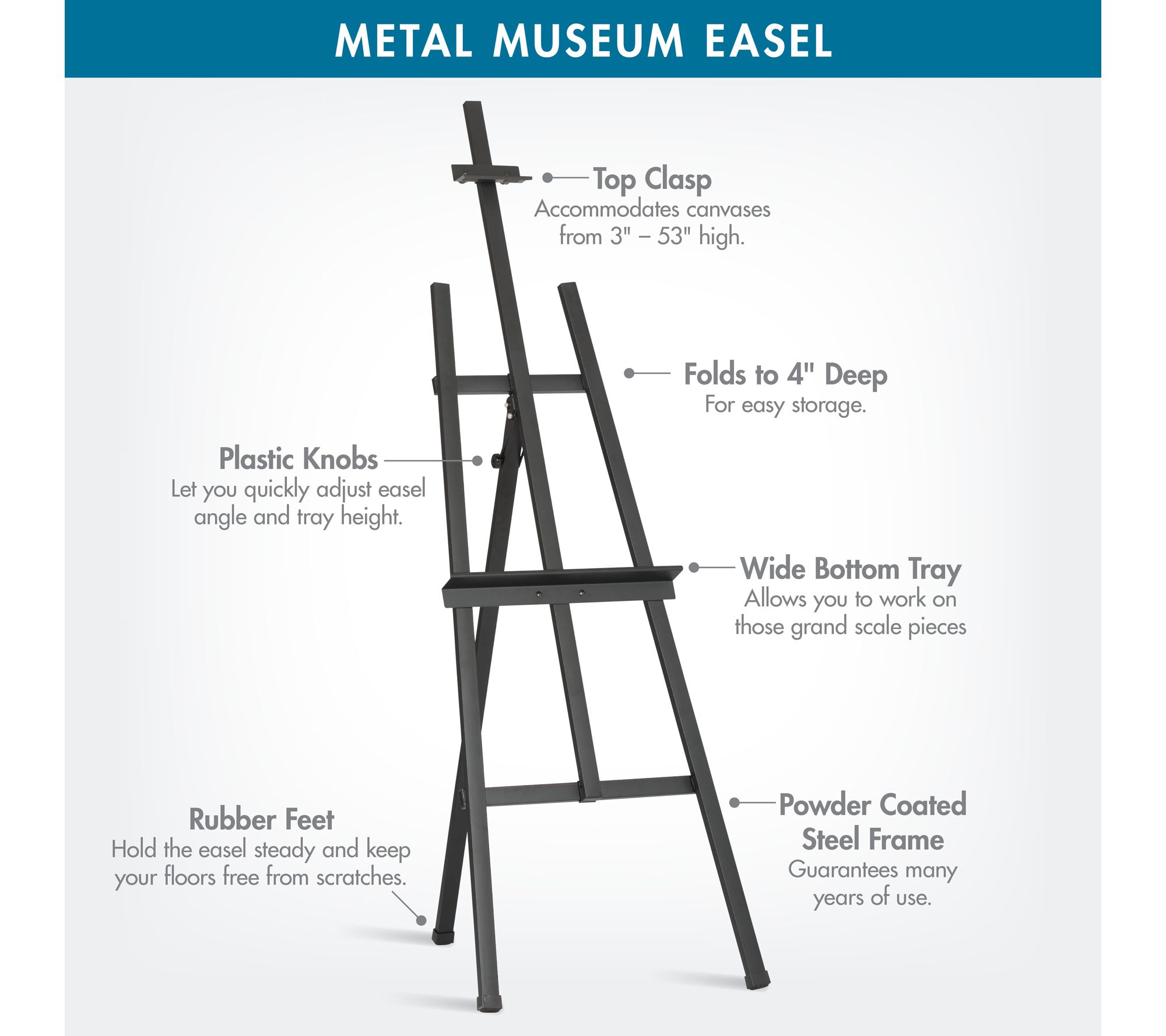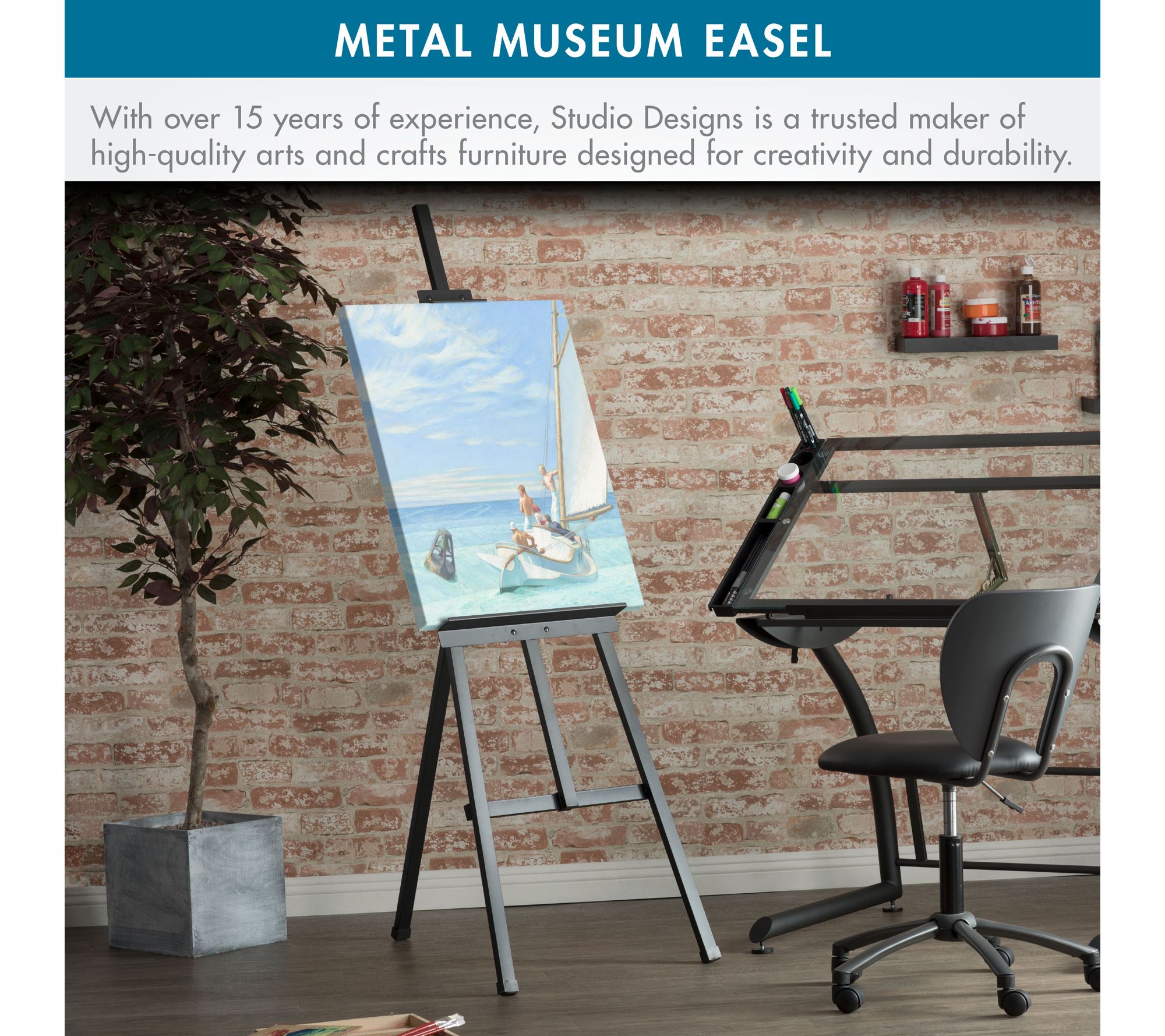 Give your artwork the spotlight it deserves, whether you're hosting a gallery night, preparing for a classroom showcase, or working in your studio. This metal easel offers versatile display options, accommodating canvases up to 53" tall while its sturdy steel frame stands up to everyday use. When it's time to pack up, simply fold it down for easy storage or transport. From Studio Designs.