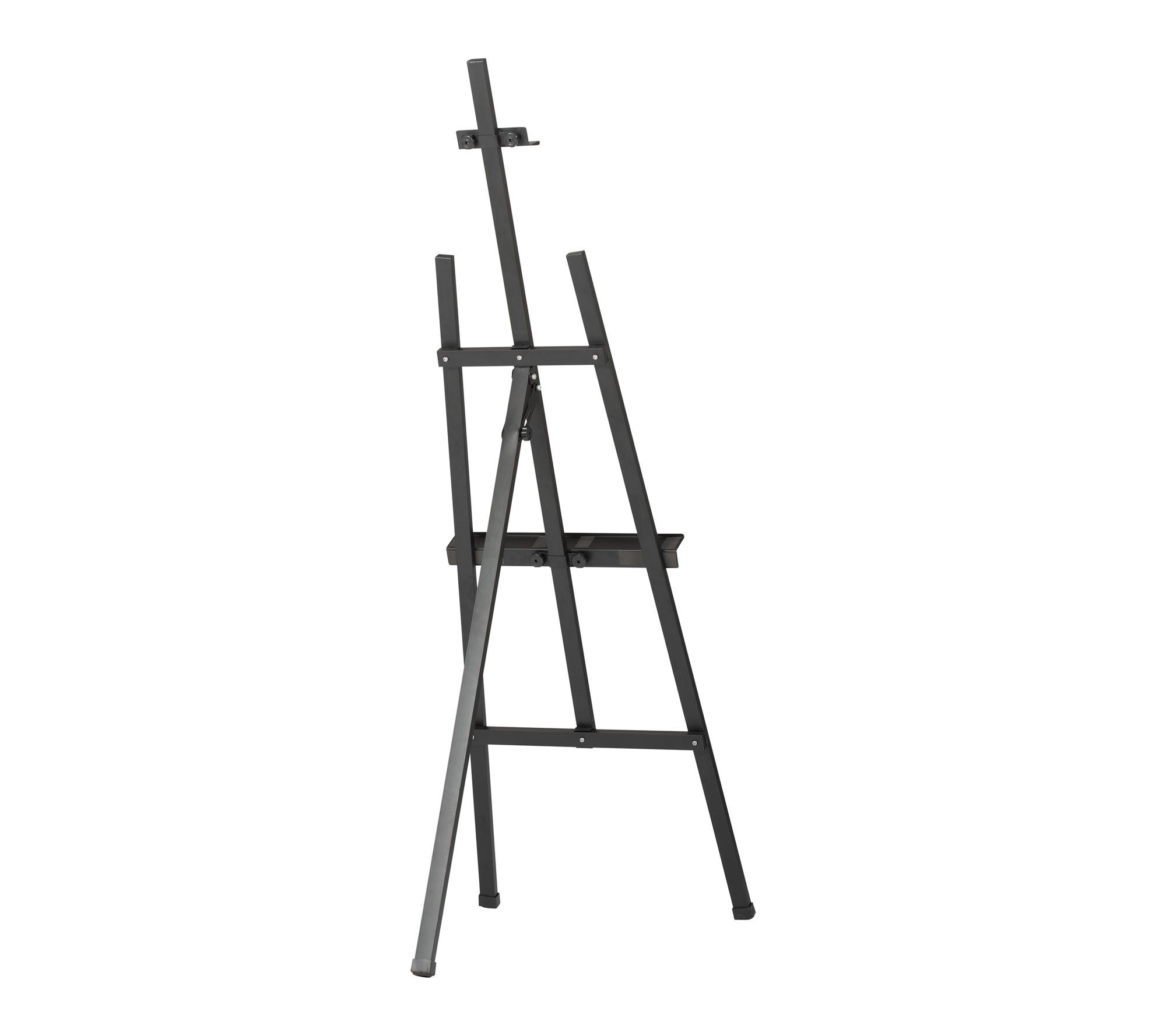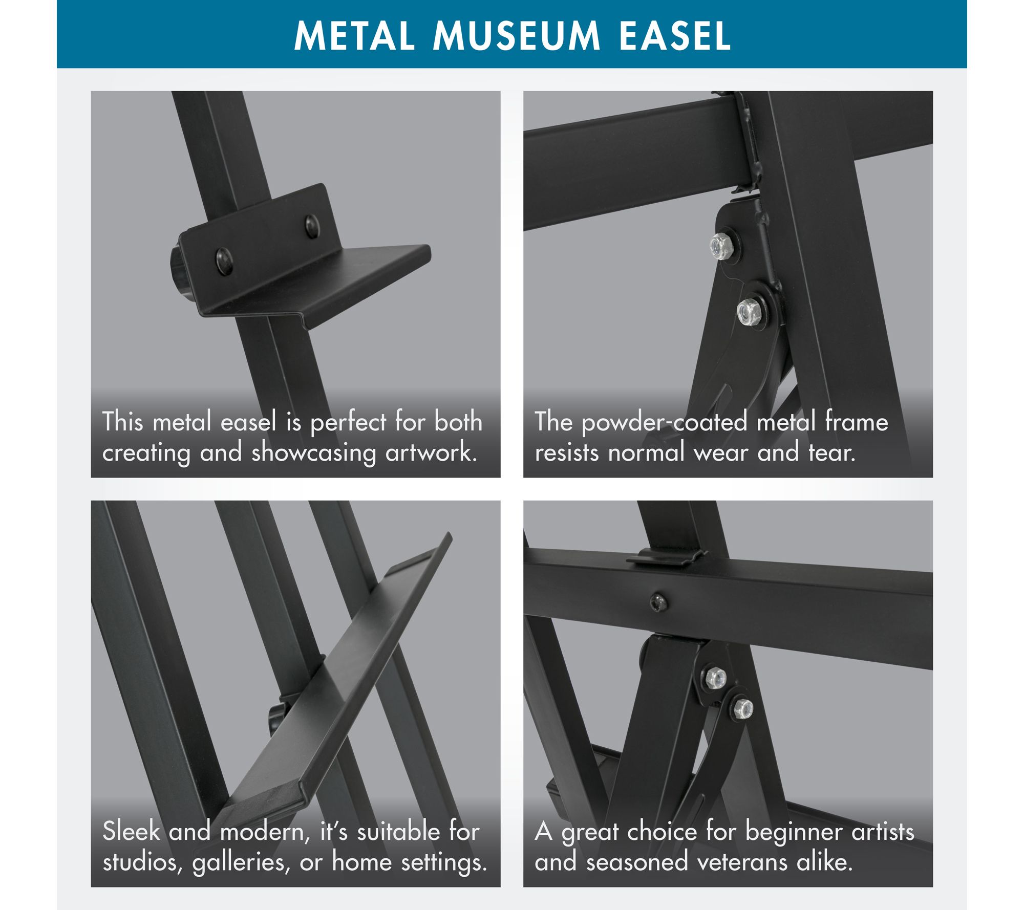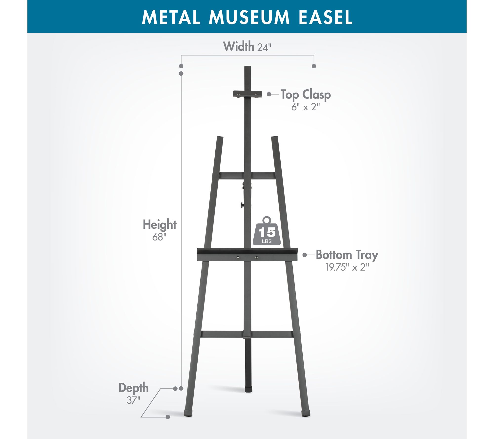 Give your artwork the spotlight it deserves, whether you're hosting a gallery night, preparing for a classroom showcase, or working in your studio. This metal easel offers versatile display options, accommodating canvases up to 53" tall while its sturdy steel frame stands up to everyday use. When it's time to pack up, simply fold it down for easy storage or transport. From Studio Designs.