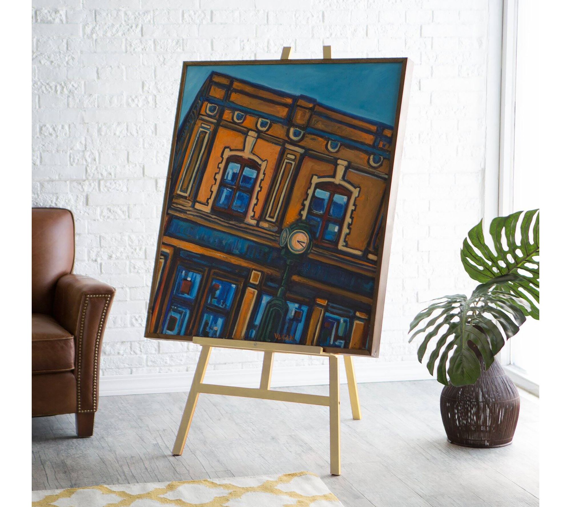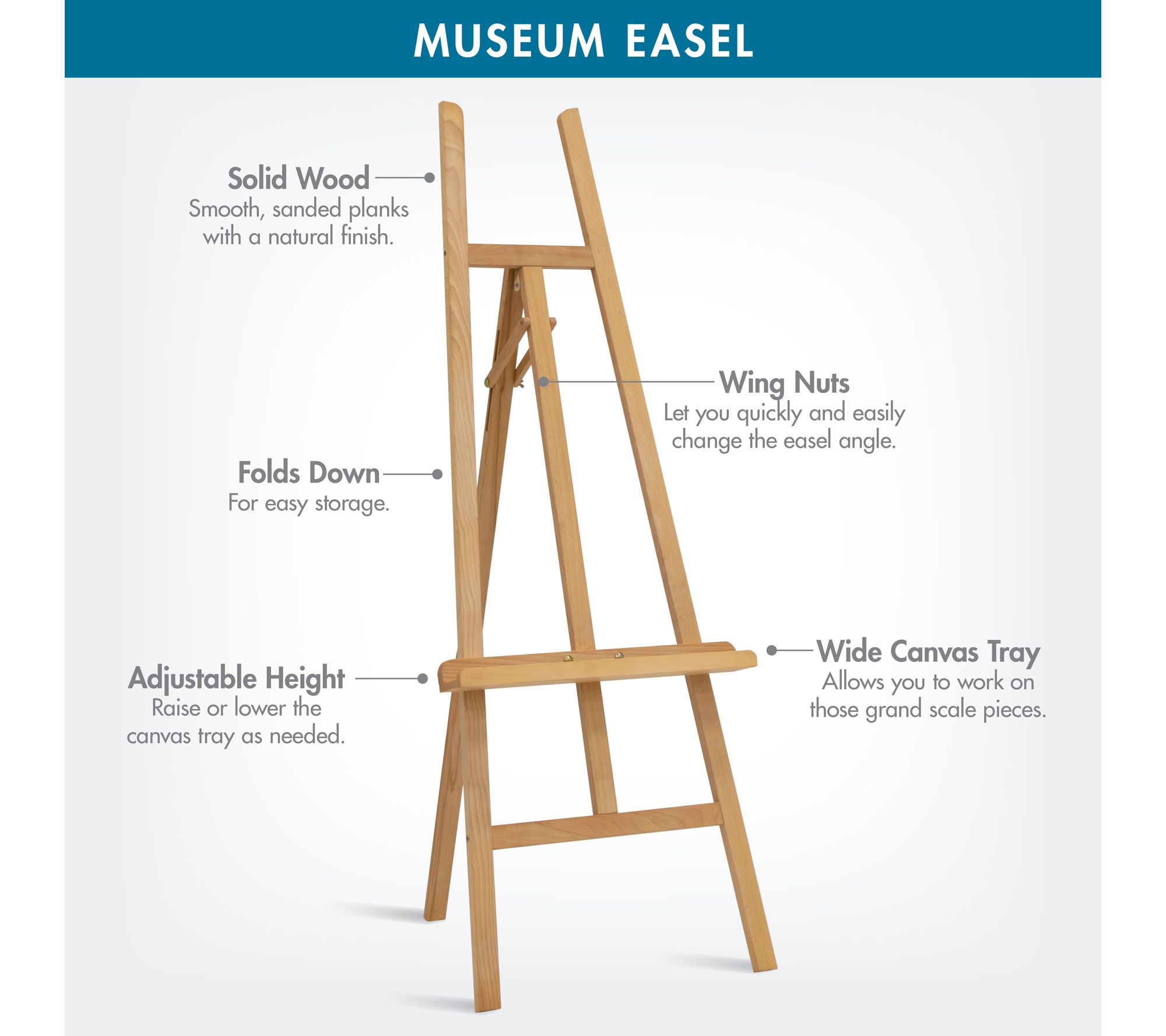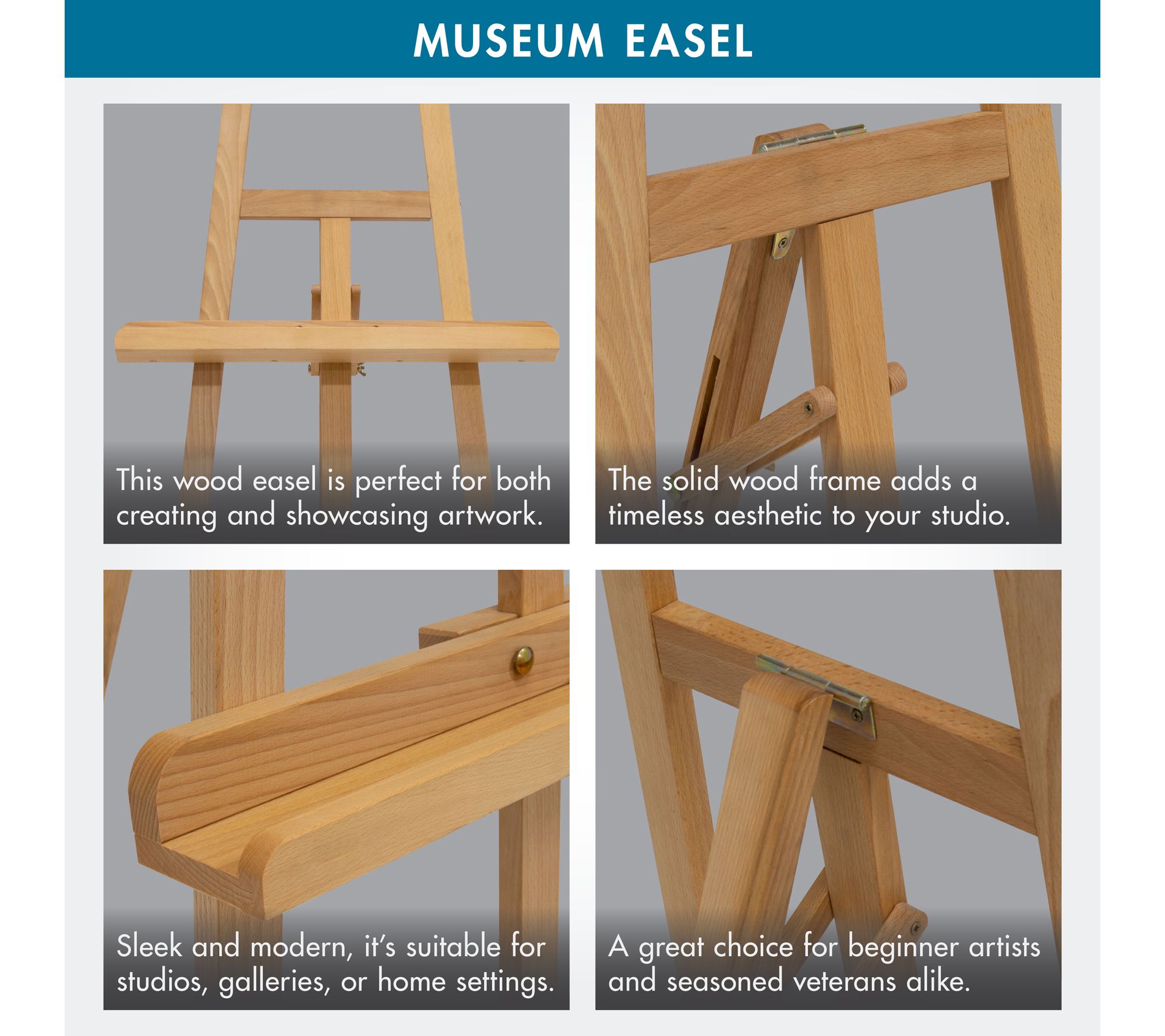 Elevate your creative space with this Museum Display Art Lyre Easel, designed to secure your artwork while you paint and showcase it when complete. The smooth sanded Birch hardwood finish adds a refined touch, and its adjustable angle allows for versatile use. The easel conveniently folds flat for easy storage. From Studio Designs.