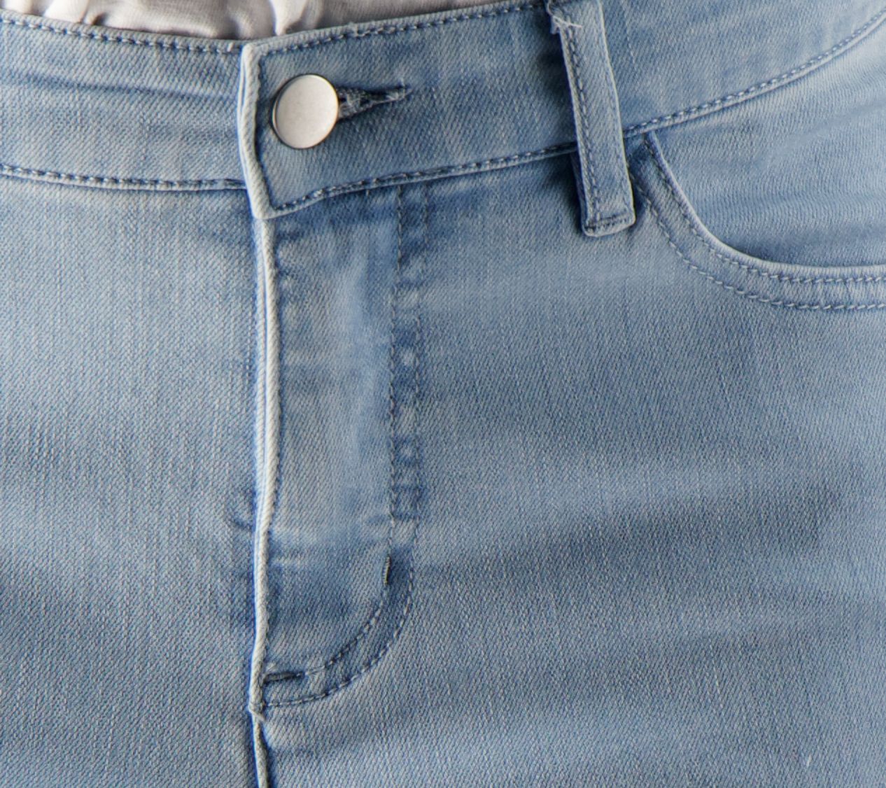 Features: raw-edge hem, cropped inseam, front scoop and coin pocket with rivets, back patch pocket