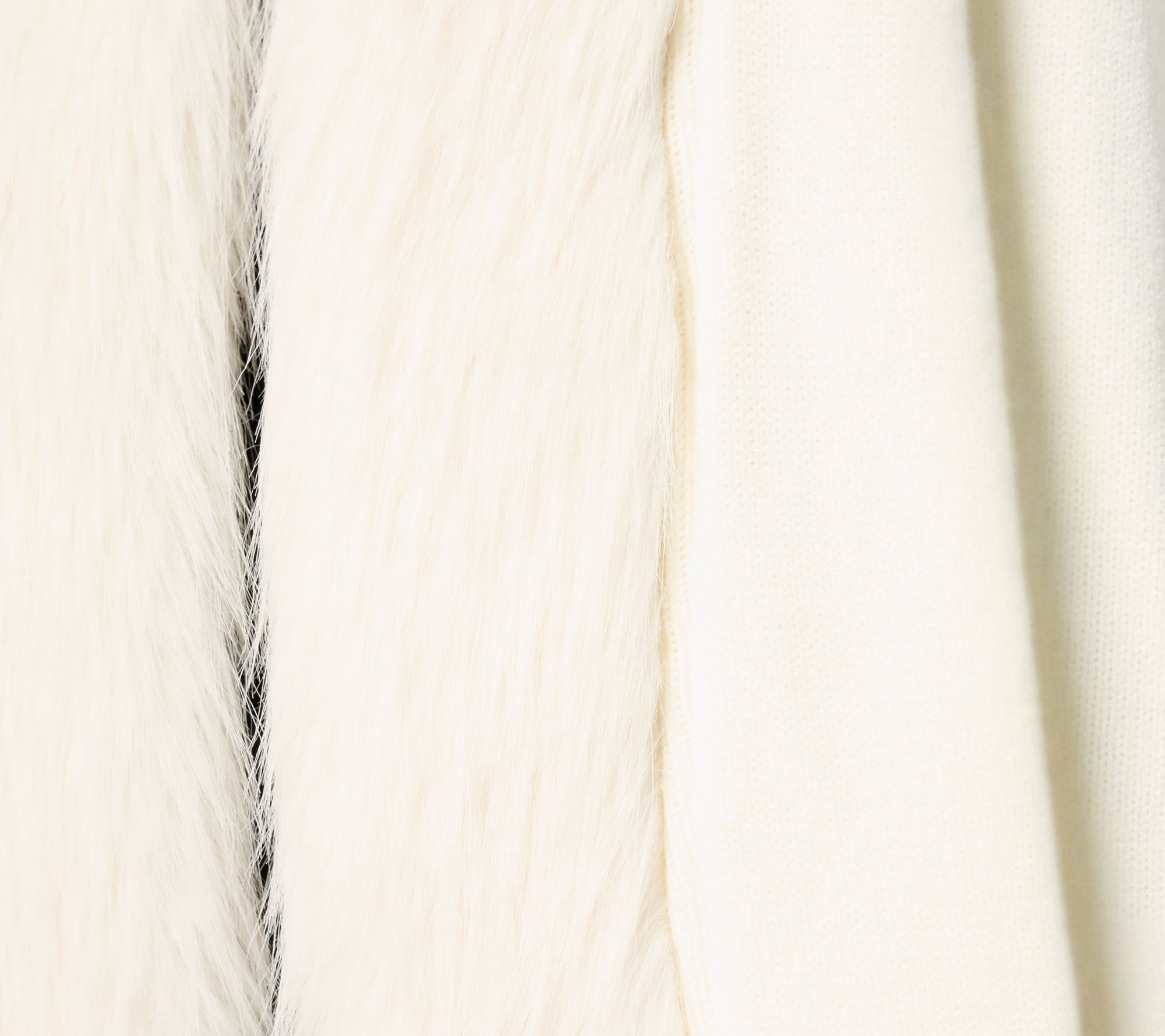 • Fabrication: jersey sweater knit body, draped faux-fur trim along placket