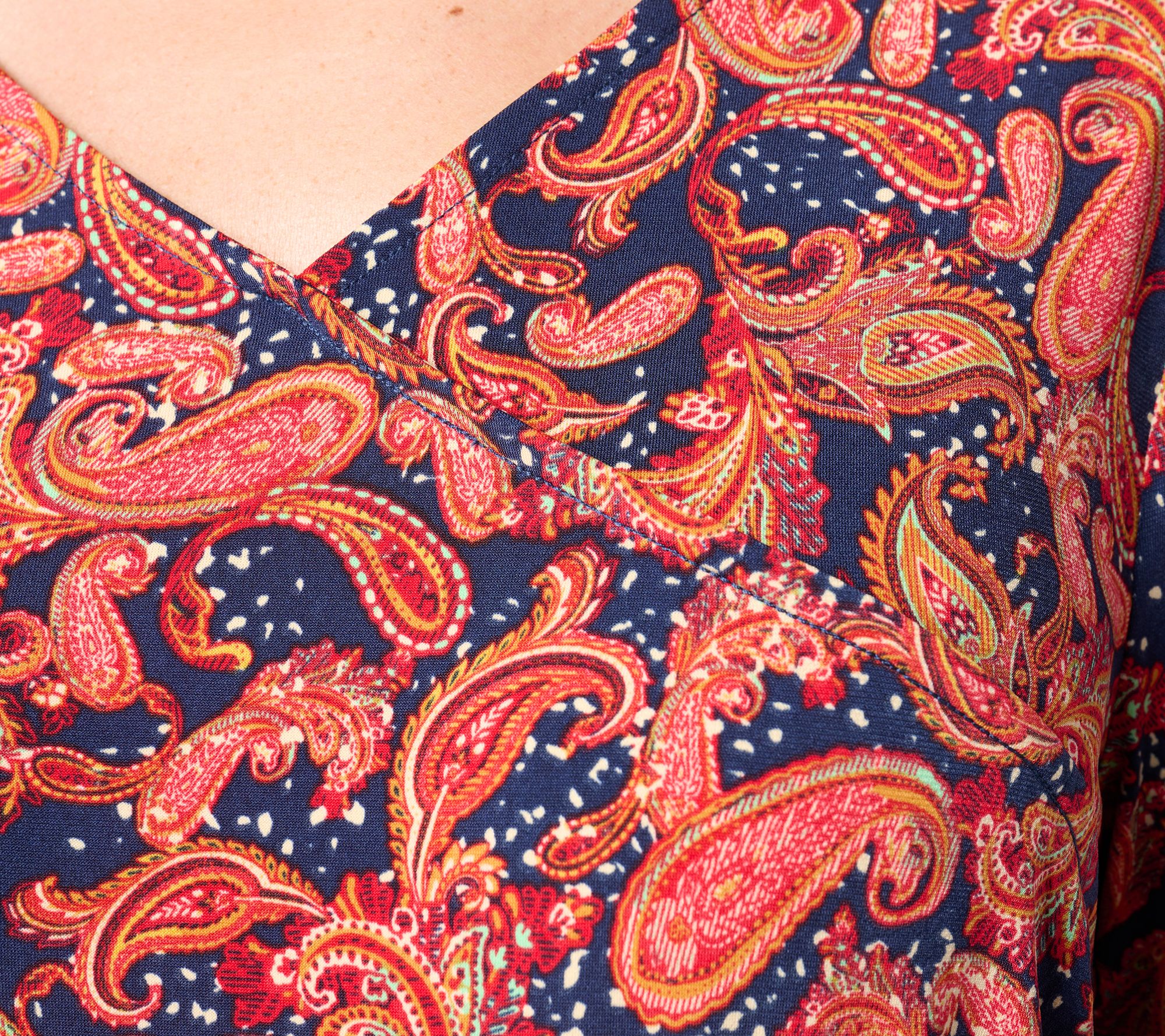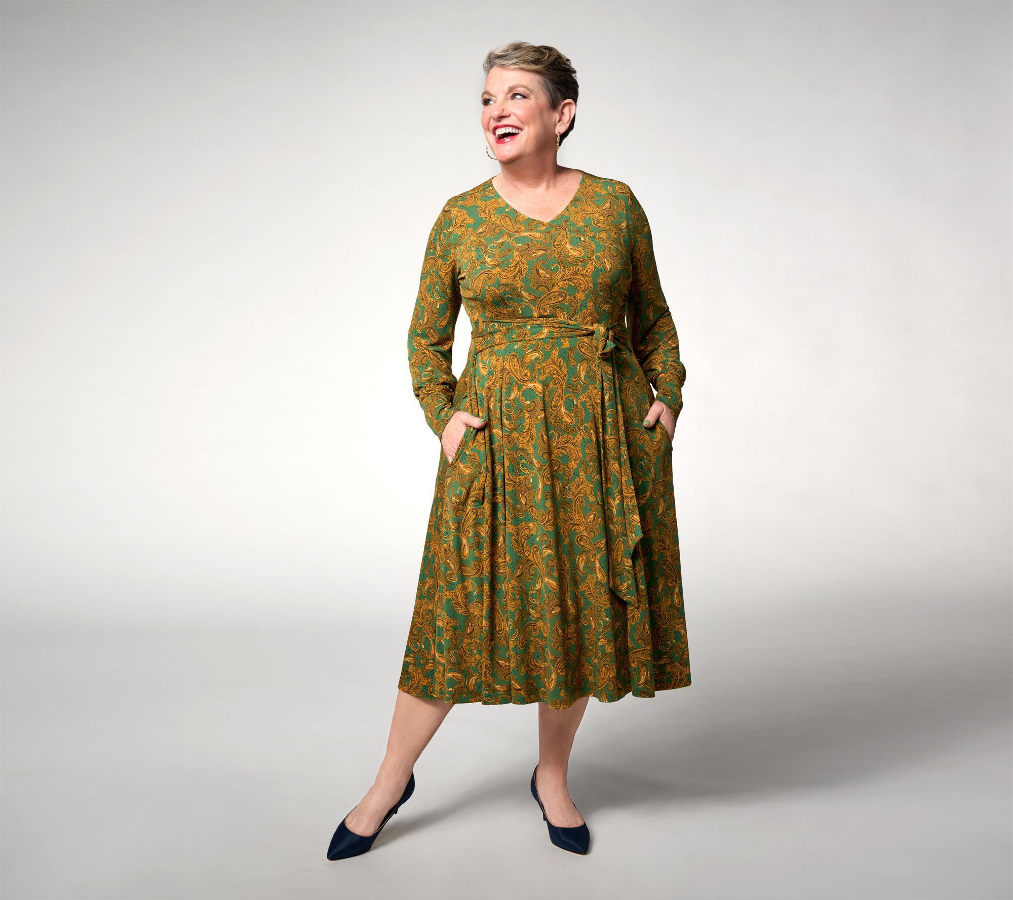 A faux-wrap bodice gives this lovely dress its flattering appeal, while the cuffed long sleeves provide a romantic touch. Wear it to weddings, parties, and special occasions of all sorts. From Studio ParkTM x Jane Treacy