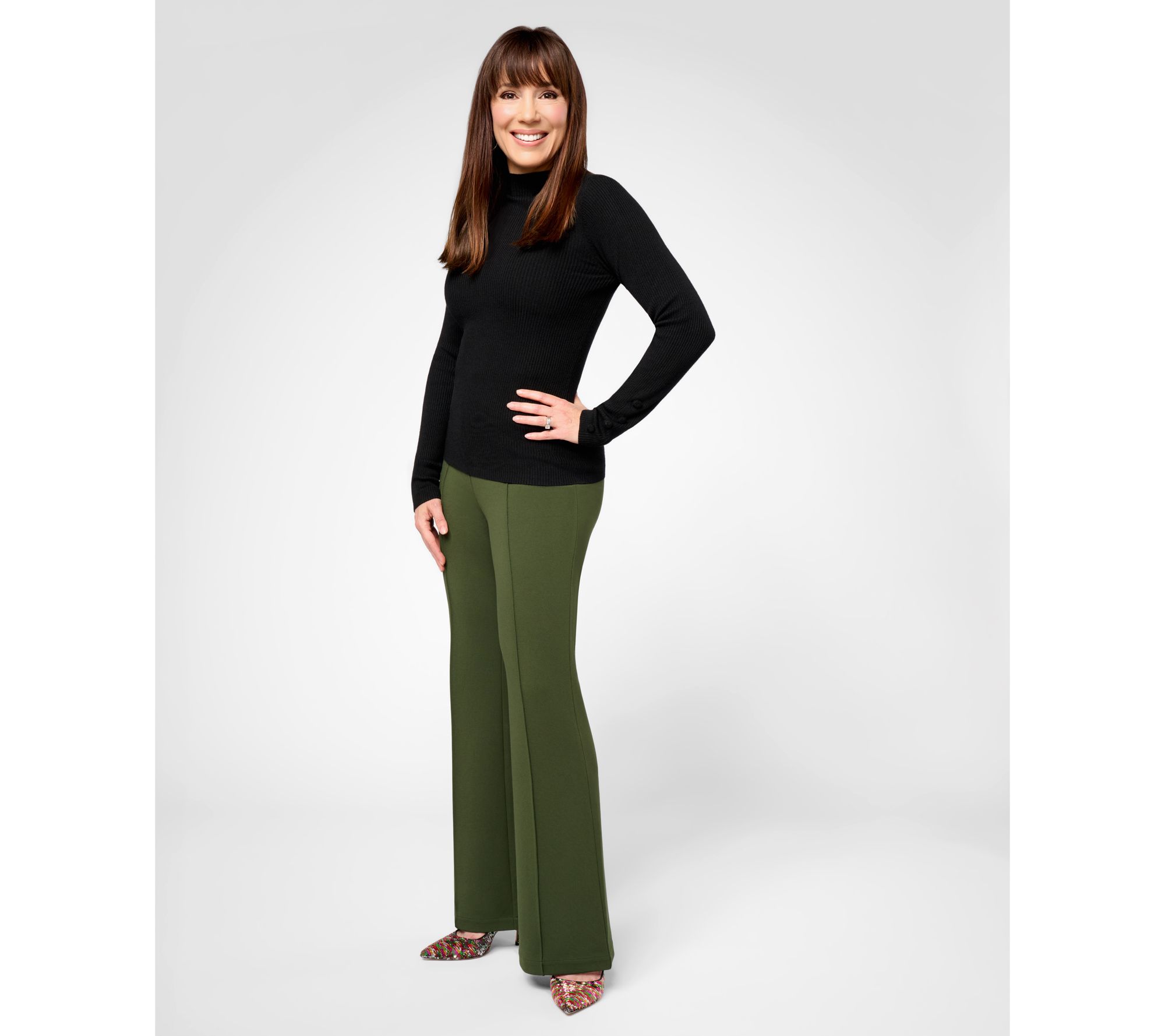 If you add one pair of go-everywhere, do-everything pants to your wardrobe this season, make it these ponte flares designed in collaboration with QVC® Program Host Sandra Bennett. Whether you're heading into the office, spending Saturday with the fam, or setting off for a chic weekend getaway, the sleek pintucked silhouette is here for it, blending tailored details with just the right amount of sturdy stretch for comfy, nonstop wear. From Studio Park™ x Sandra Bennett.