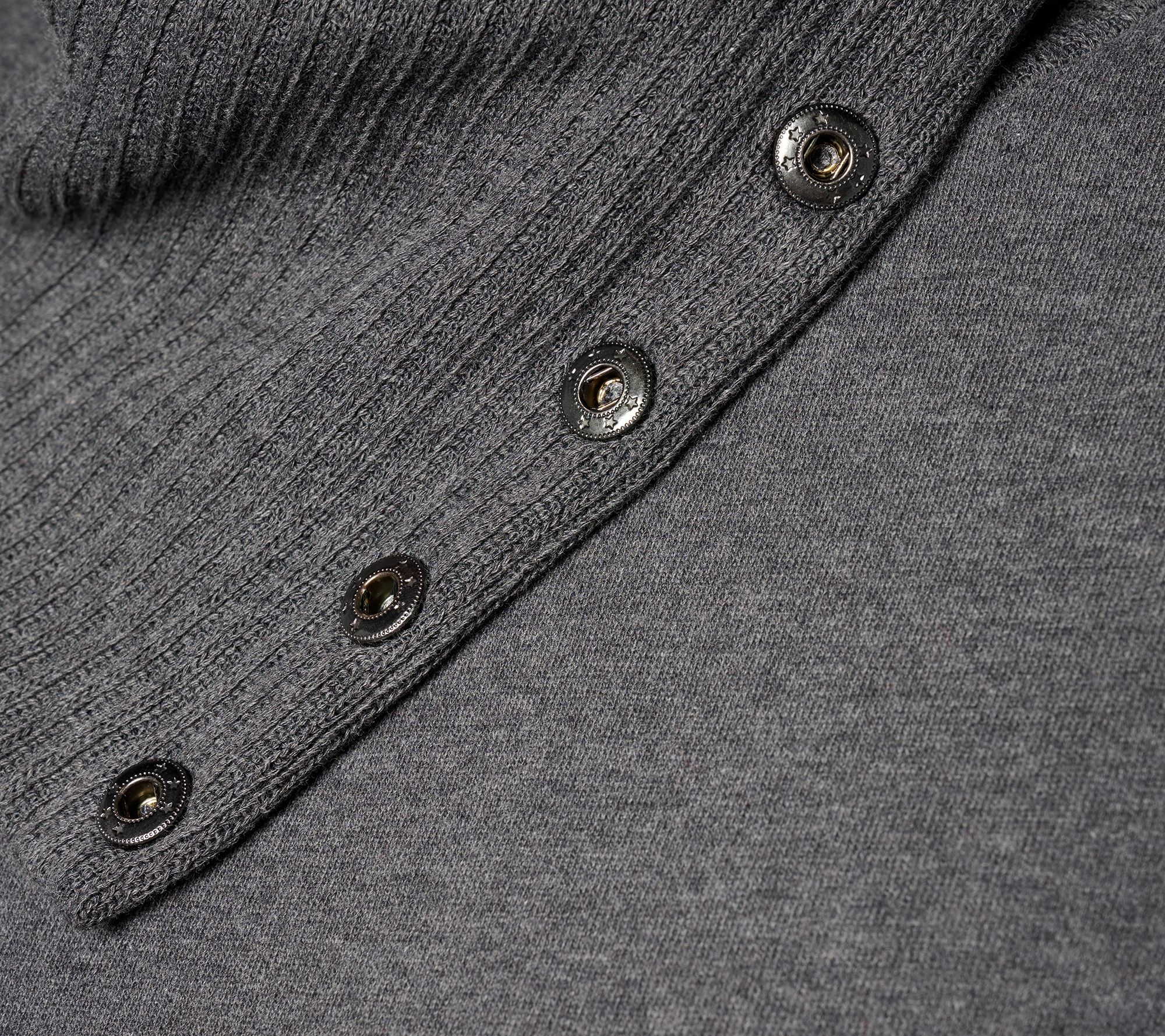Features: sweater knit ribbed cowl collar, drop shoulder, long sleeves with sweater knit ribbed cuff