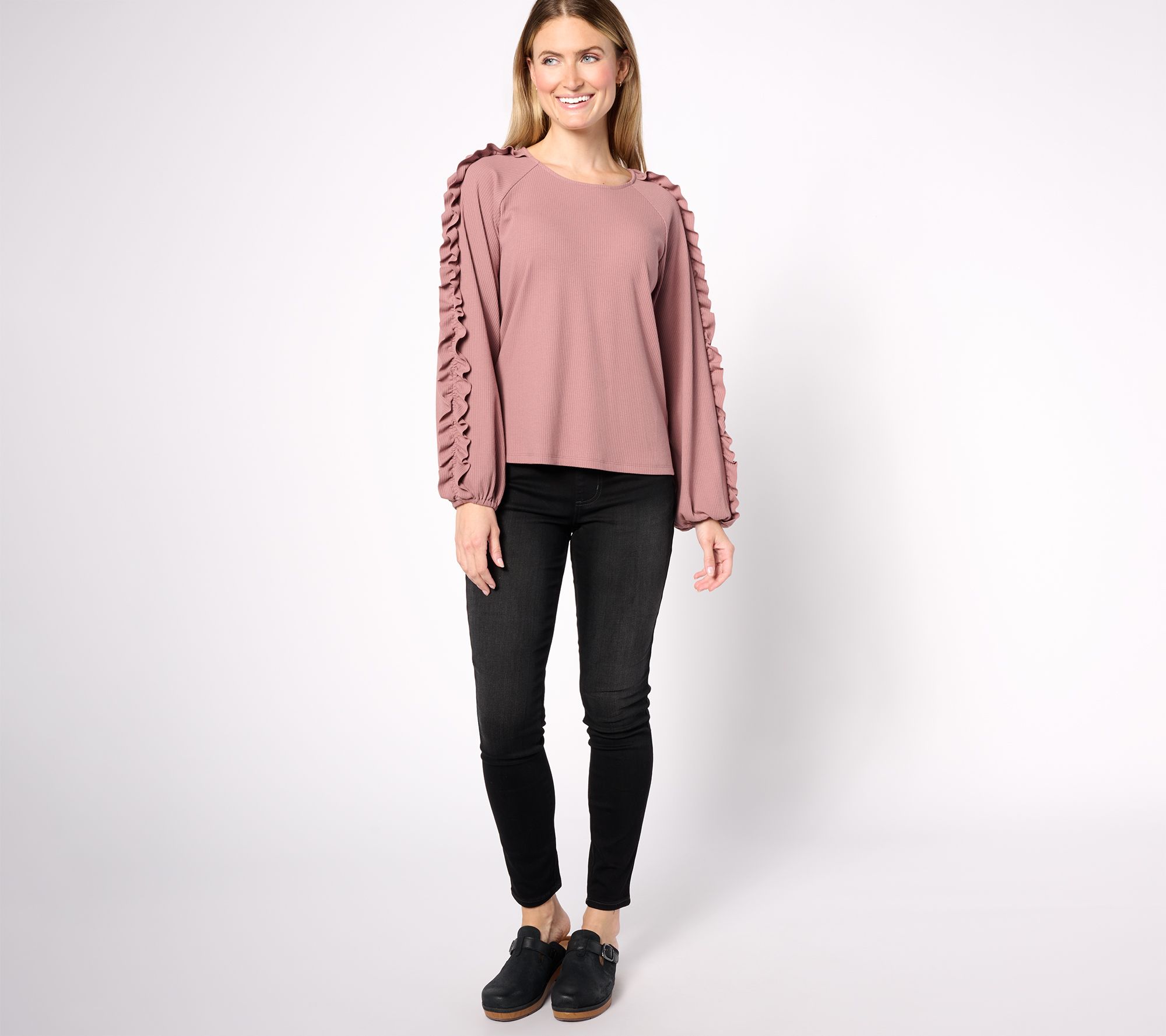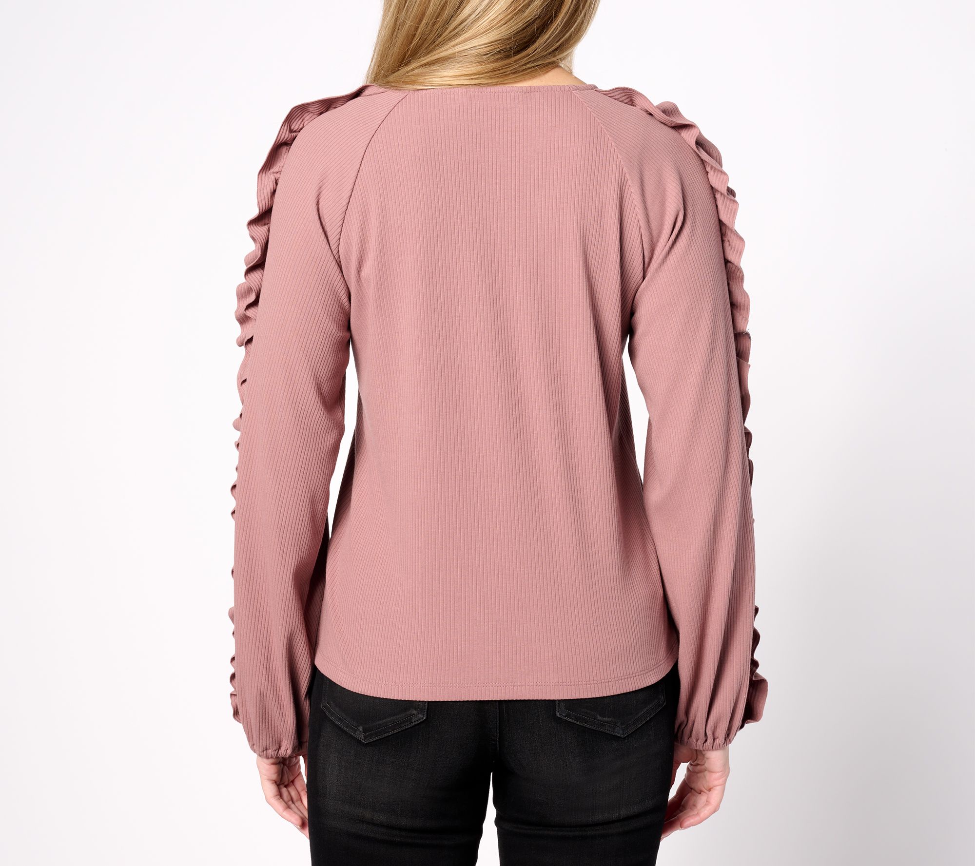 Fully embrace the beauty of this rib knit top when you pair it with jeans and a pair of lightweight loafer. The ruffled sleeves are an eye-catching detail that levels up the look. From Studio ParkTM x Shawn Killinger.