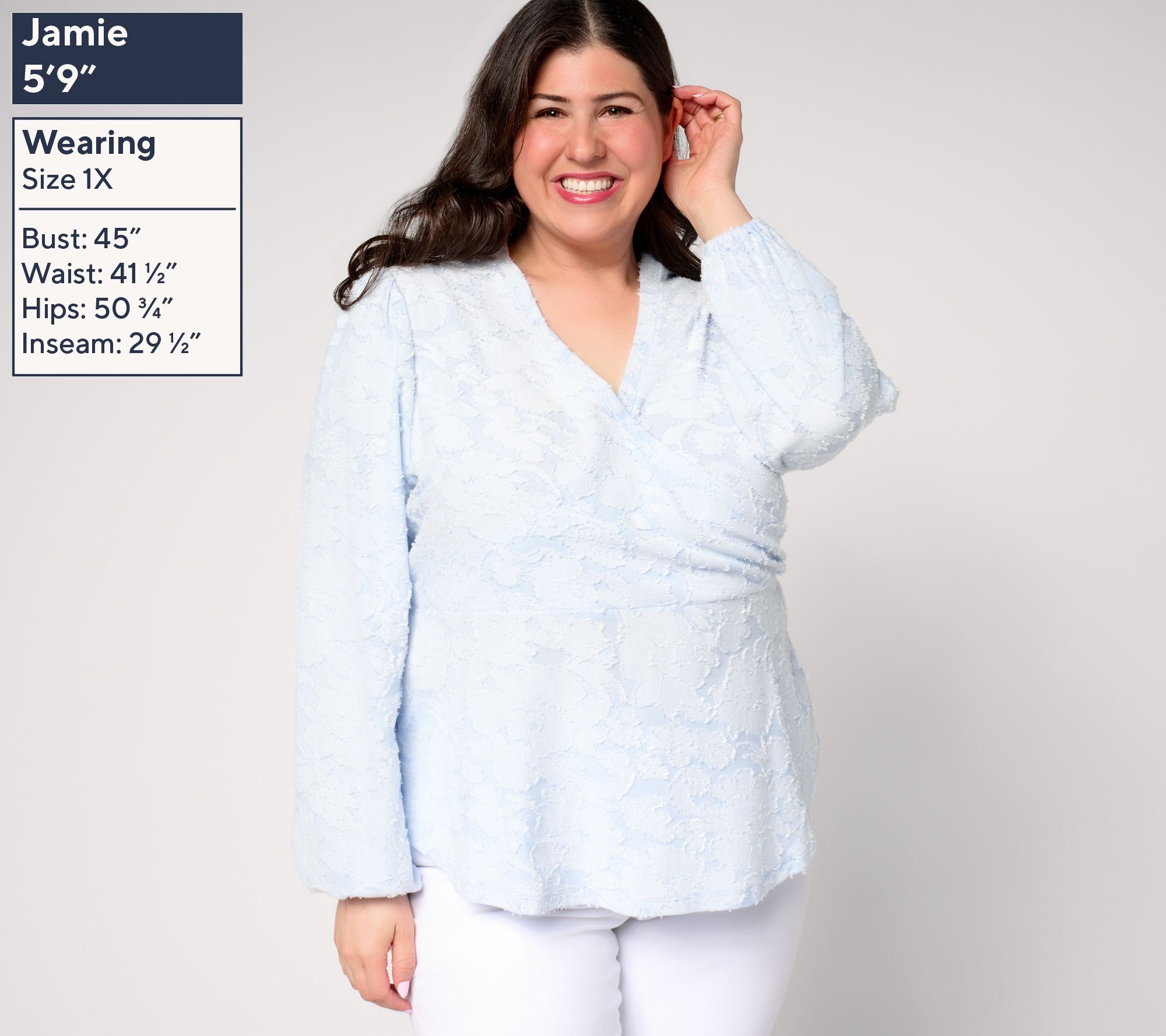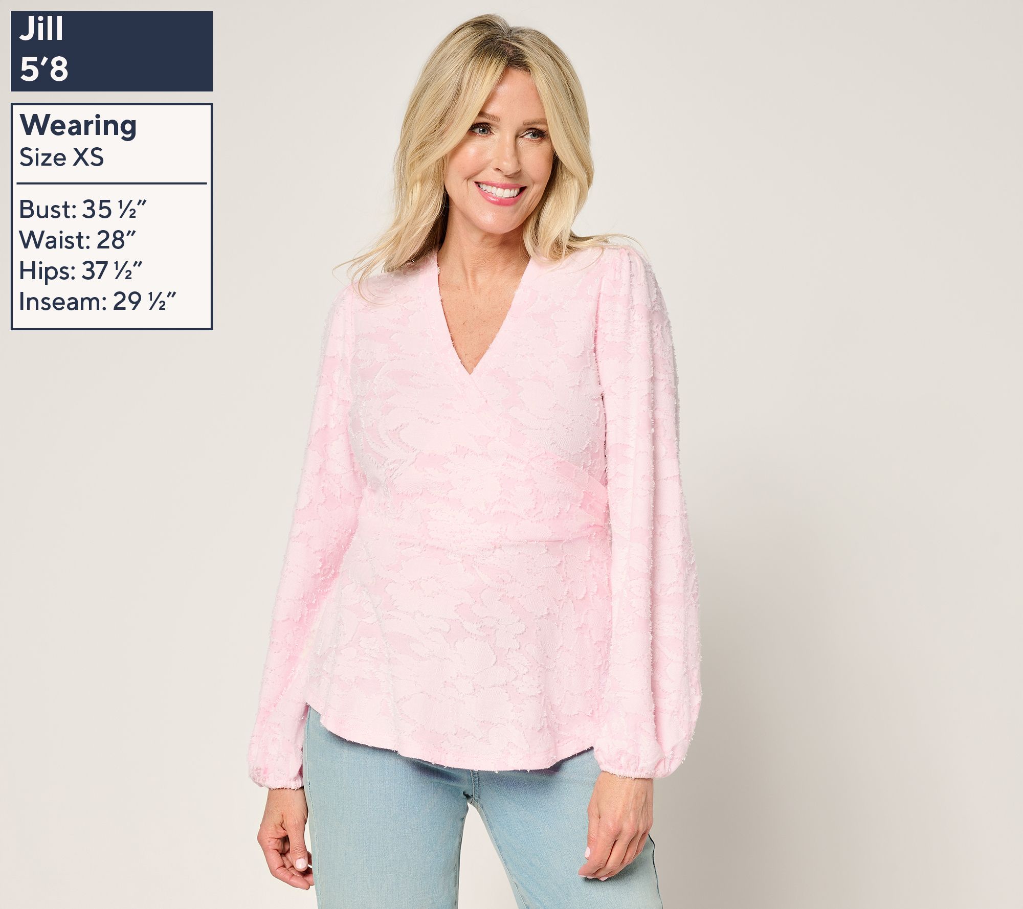 Features: faux-wrap top layer sewn into side seam, shirring centered over sleeve cap, hook-and-eye closure inside of neckband at crossover, elastic back waist, long sleeves with elastic cuff