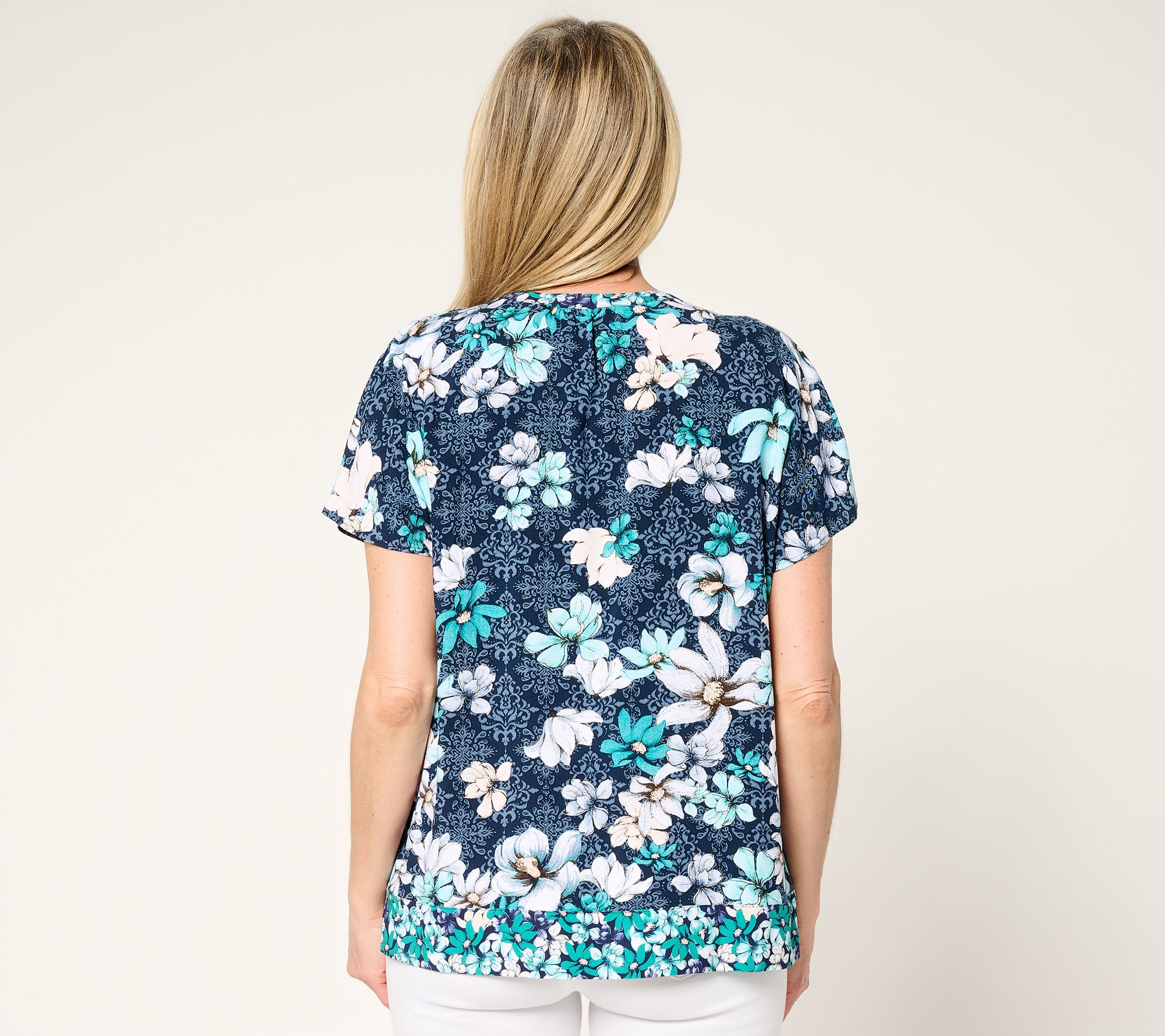 Greet the day with a beautiful bouquet. This relaxed-fit top features a floral print finished with an intricate border for even more head-turning appeal. Start your spring and end your summer with this petaled pick. From Studio ParkTM x Terri Conn.