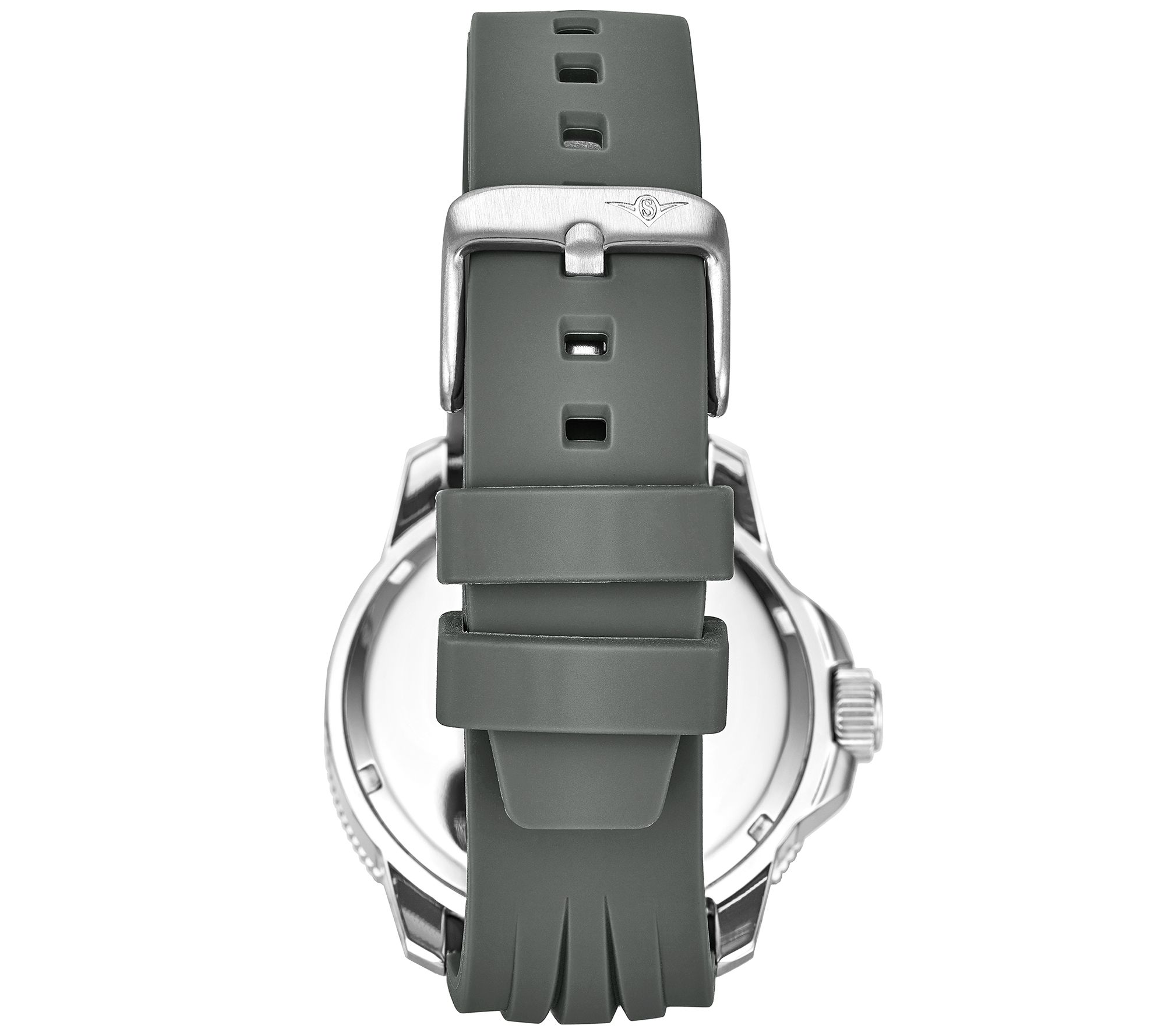 • Round, stainless steel case; gray stainless steel unidirectional, rotating coin-edge bezel; push/pull serrated-style crown; mineral crystal