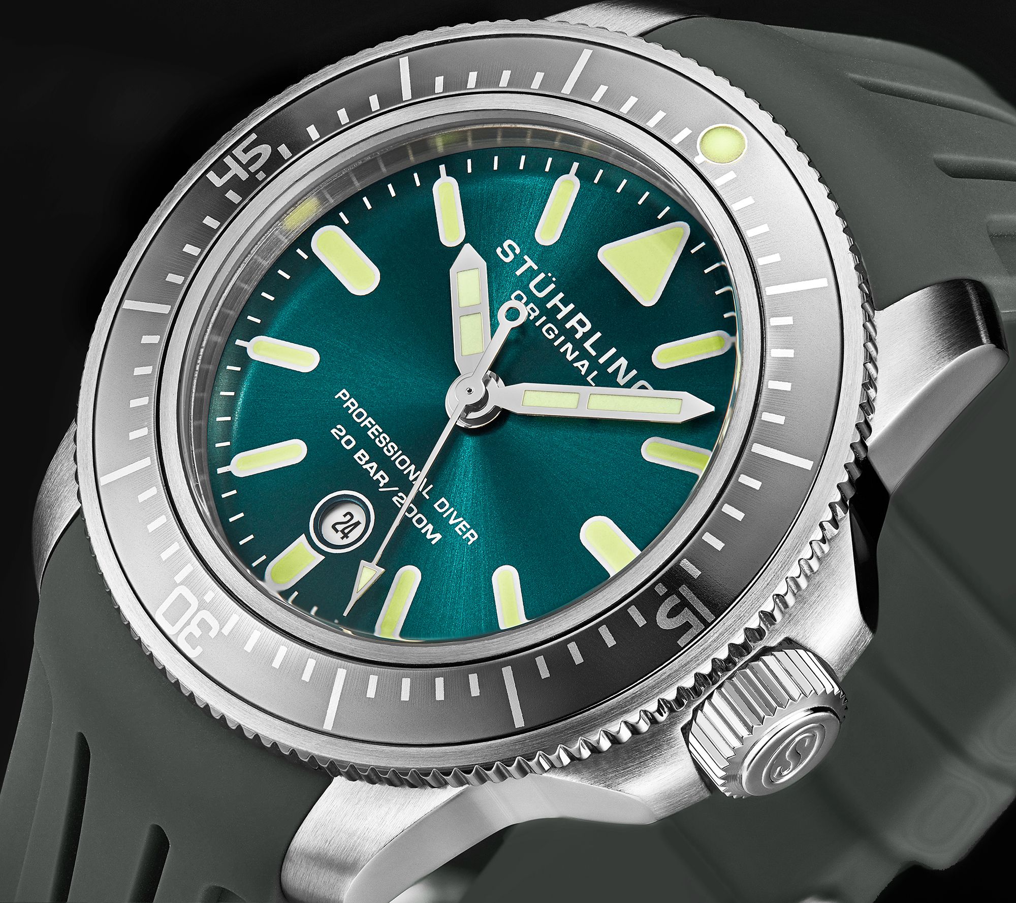 • Turquoise dial; luminous hour, minute, and second hands; luminous index markers; analog date at 6:00 mark