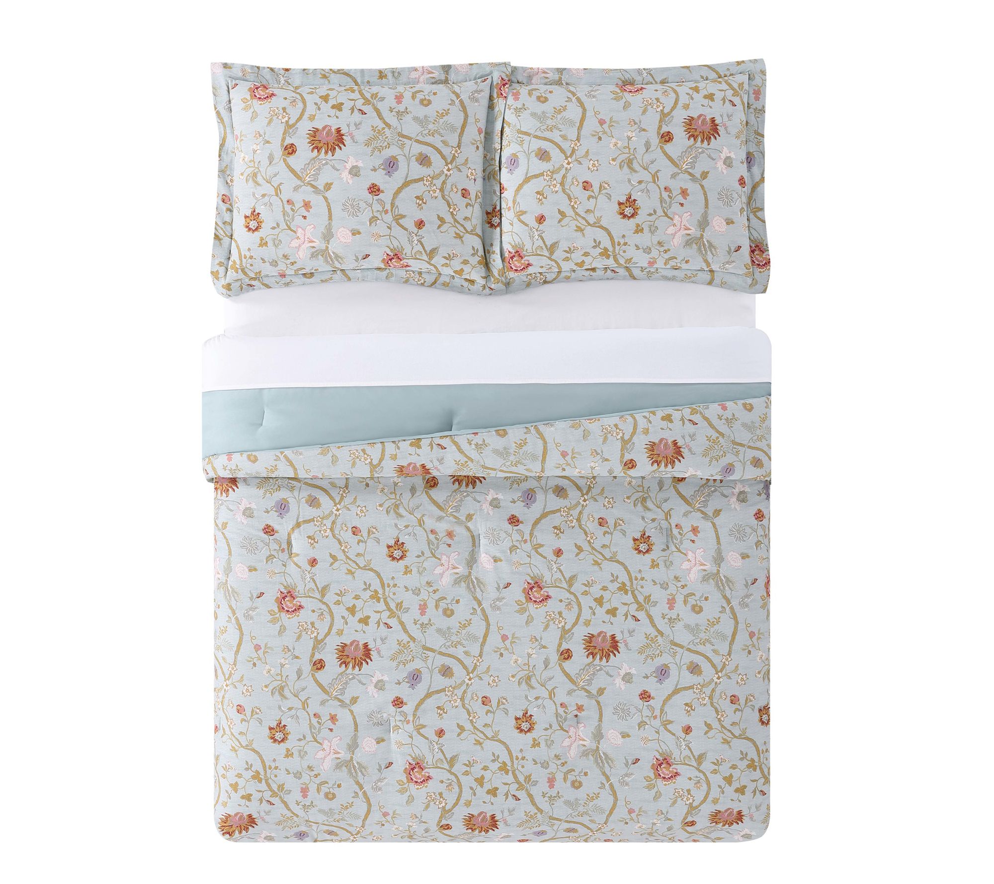 Surround yourself with cozy softness and lovely flowers, this Bedford king size comforter set features an elegant floral scroll print face and a solid light blue reverse. From Style 212.