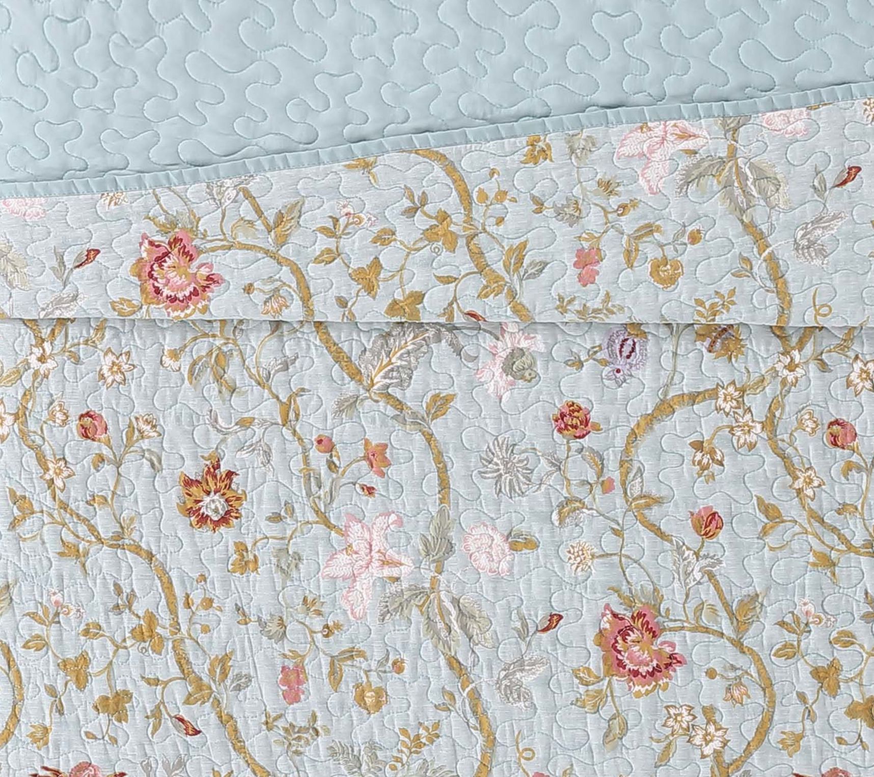 Surround yourself in cozy softness and lovely flowers with this Bedford quilt set that features an elegant floral scroll print face and a solid light blue reverse. From Style 212.