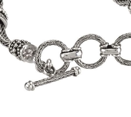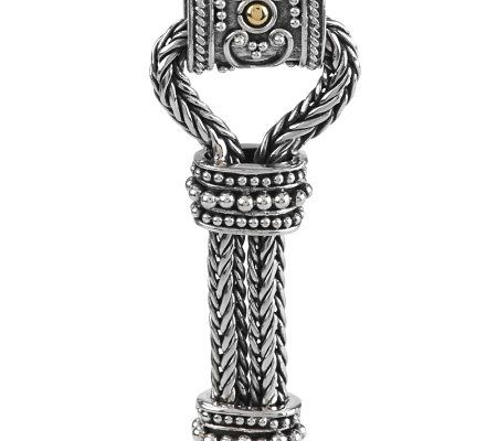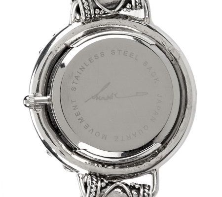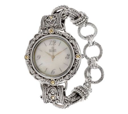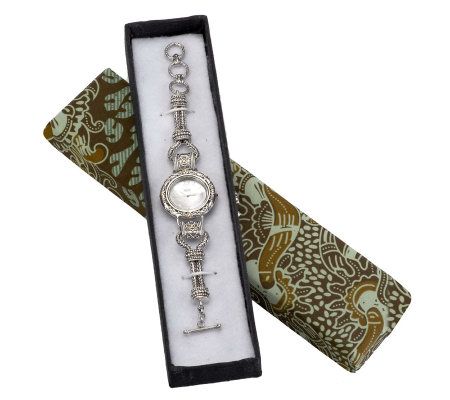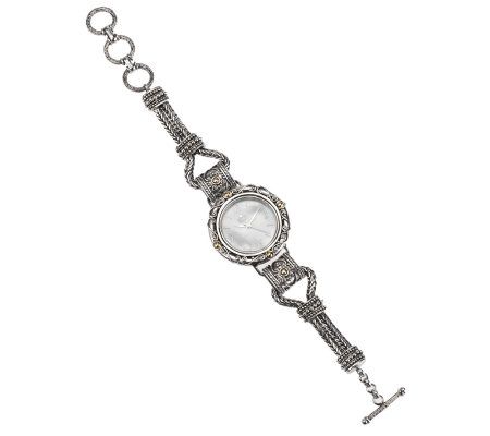 An elegant watch never goes out of style. Designed by Suarti, this artisan-crafted, sterling silver timepiece features a round, white mother-of-pearl dial. Bead and scrollwork details are joined by 18K yellow gold accents for a touch of shine. The toggle-bar closure adjusts for a customizable fit.