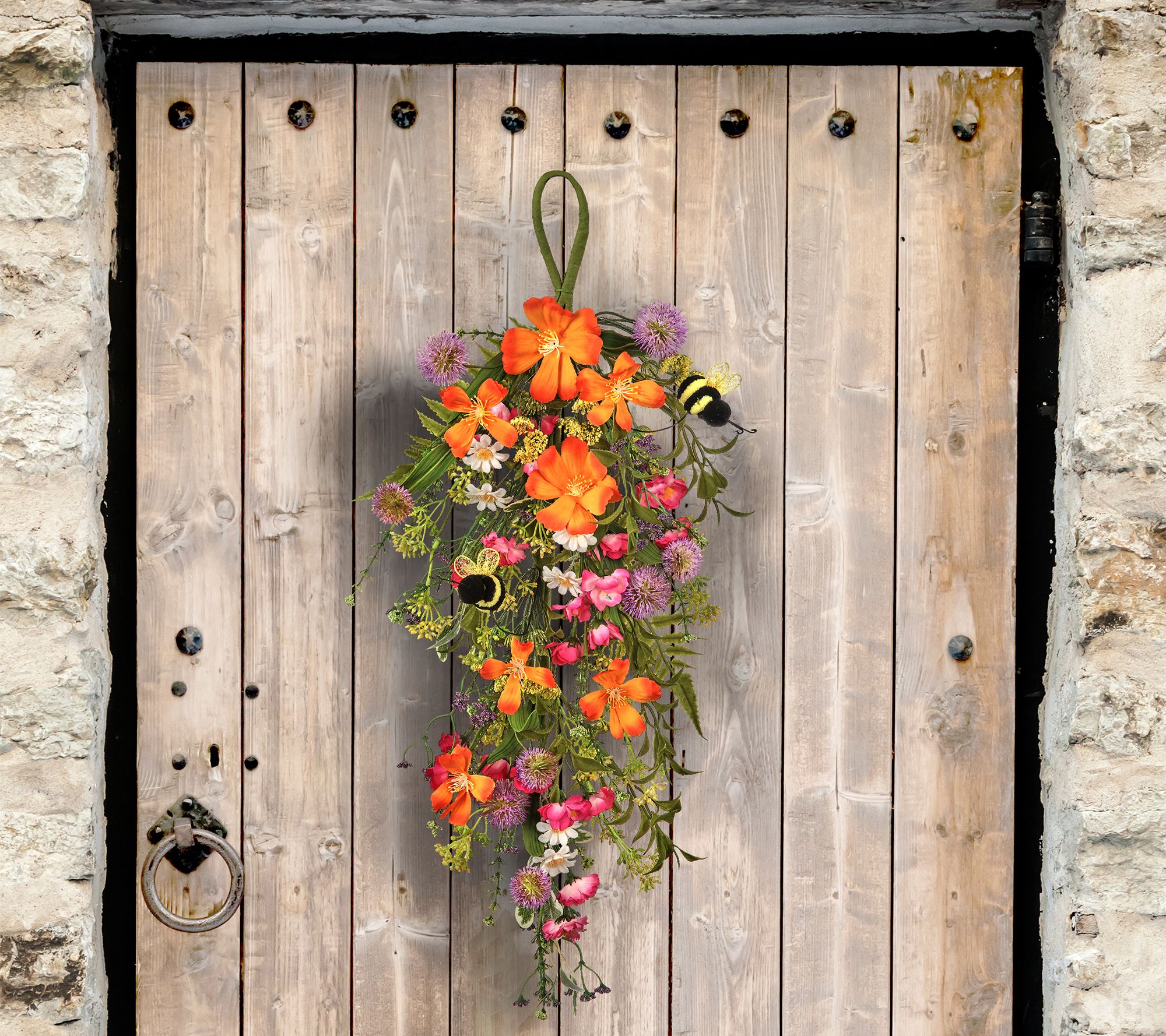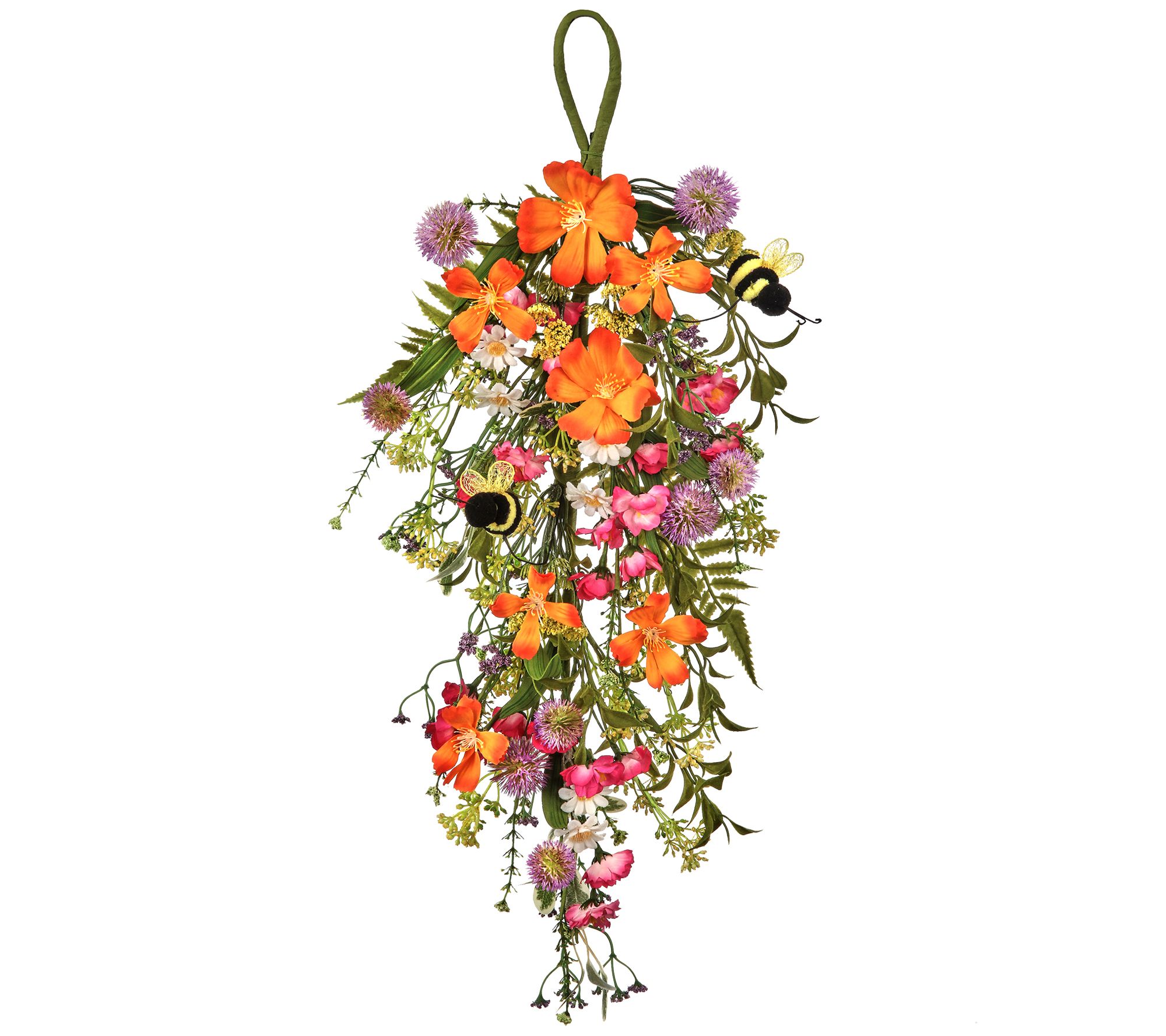 Show off beautiful blooms all year long with this colorful bee teardrop. Hang it on a wall or your front door as a decorative accent piece. From the Valerie Parr Hill Collection.
