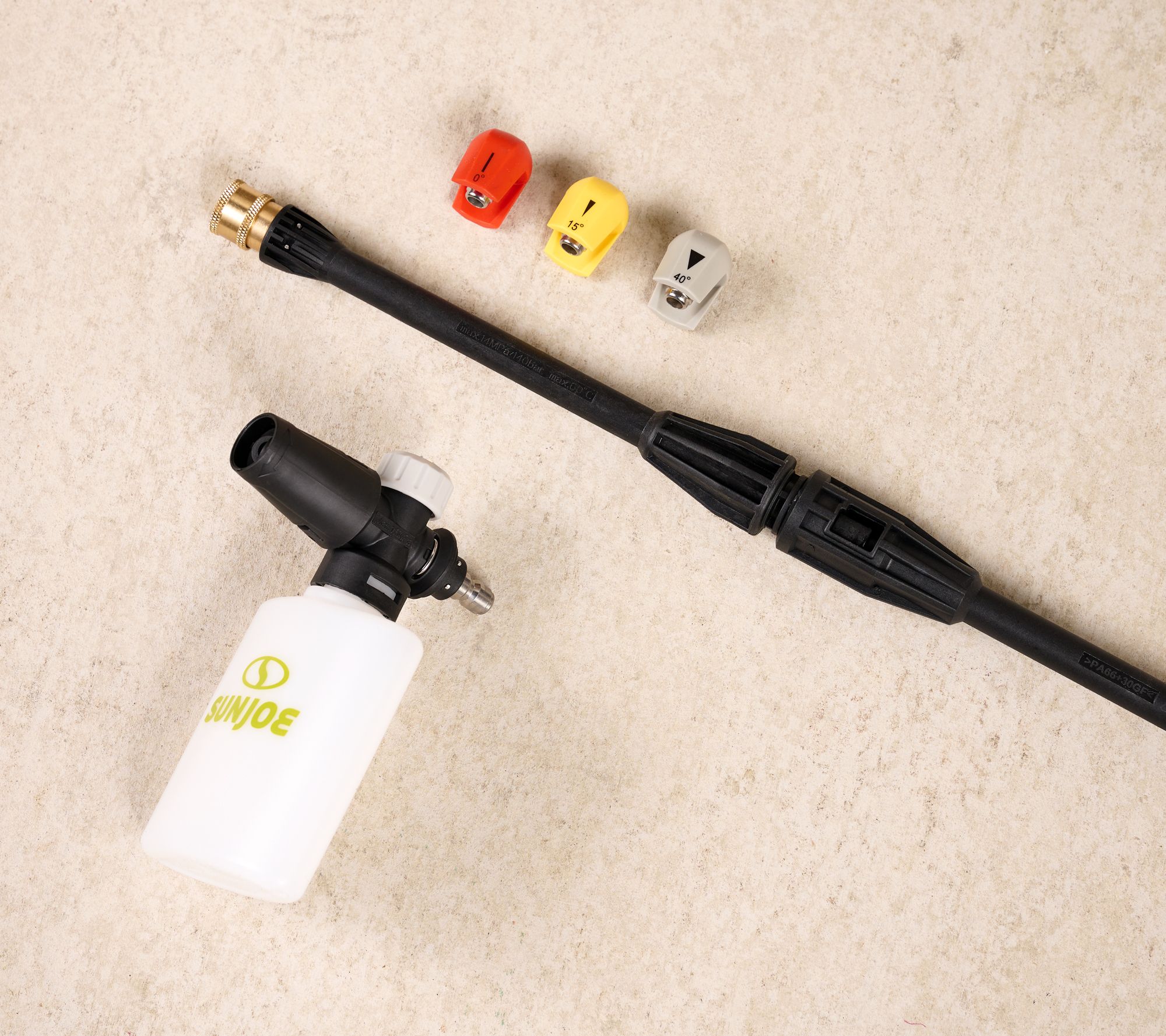 Includes pressure washer, 0-degree nozzle, 15-degree nozzle, 40-degree nozzle, empty detergent bottle, 20-foot high-pressure hose, 35-foot power cord, brass Quick-Connect lance, and needle clean-out tool