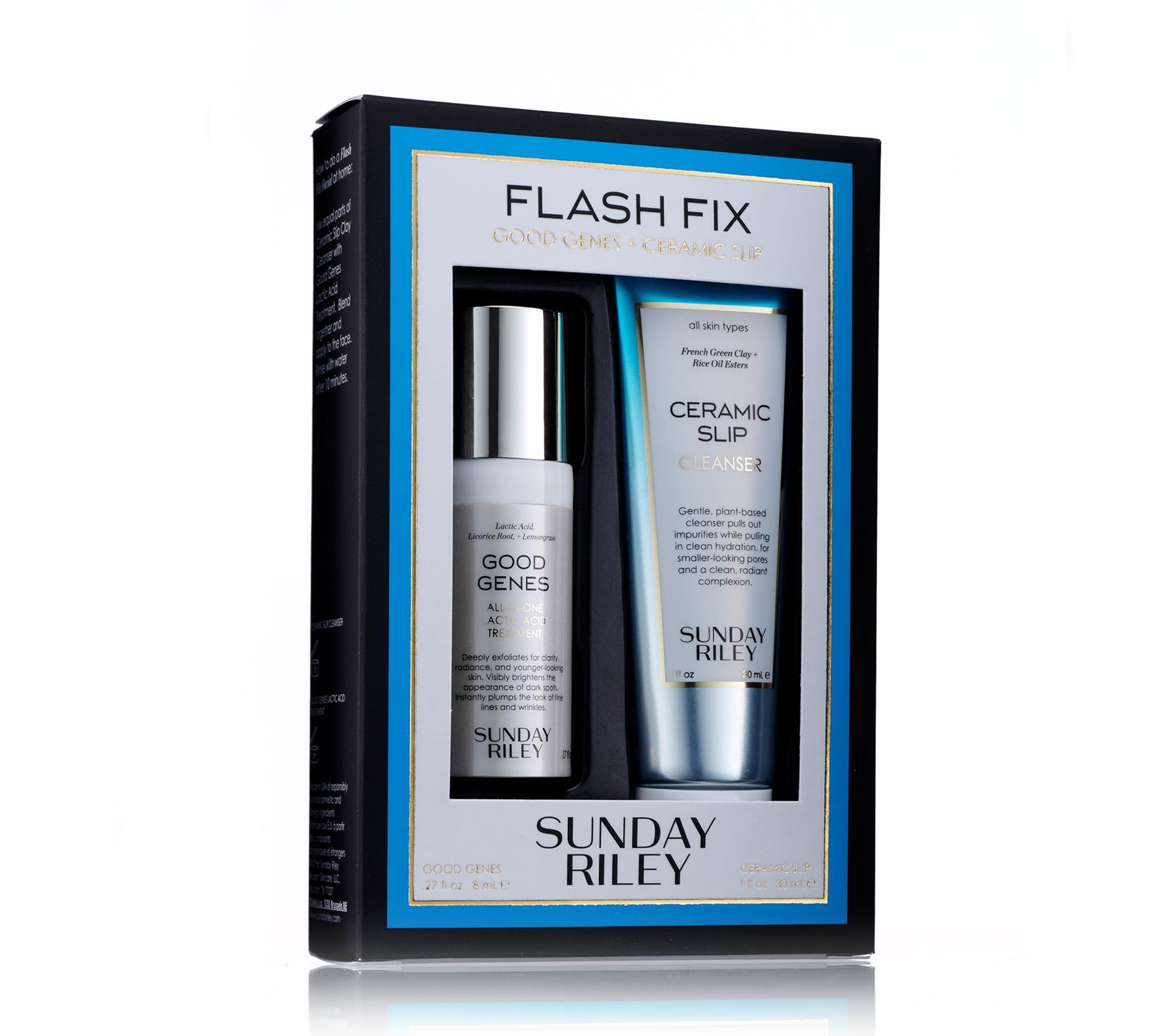 How to do a Flash Fix facial at home: Mix equal parts of Ceramic Slip Cleanser with Good Genes All-in-One Lactic Acid Treatment. Blend together and apply to the face. Rinse with water after 10 minutes.