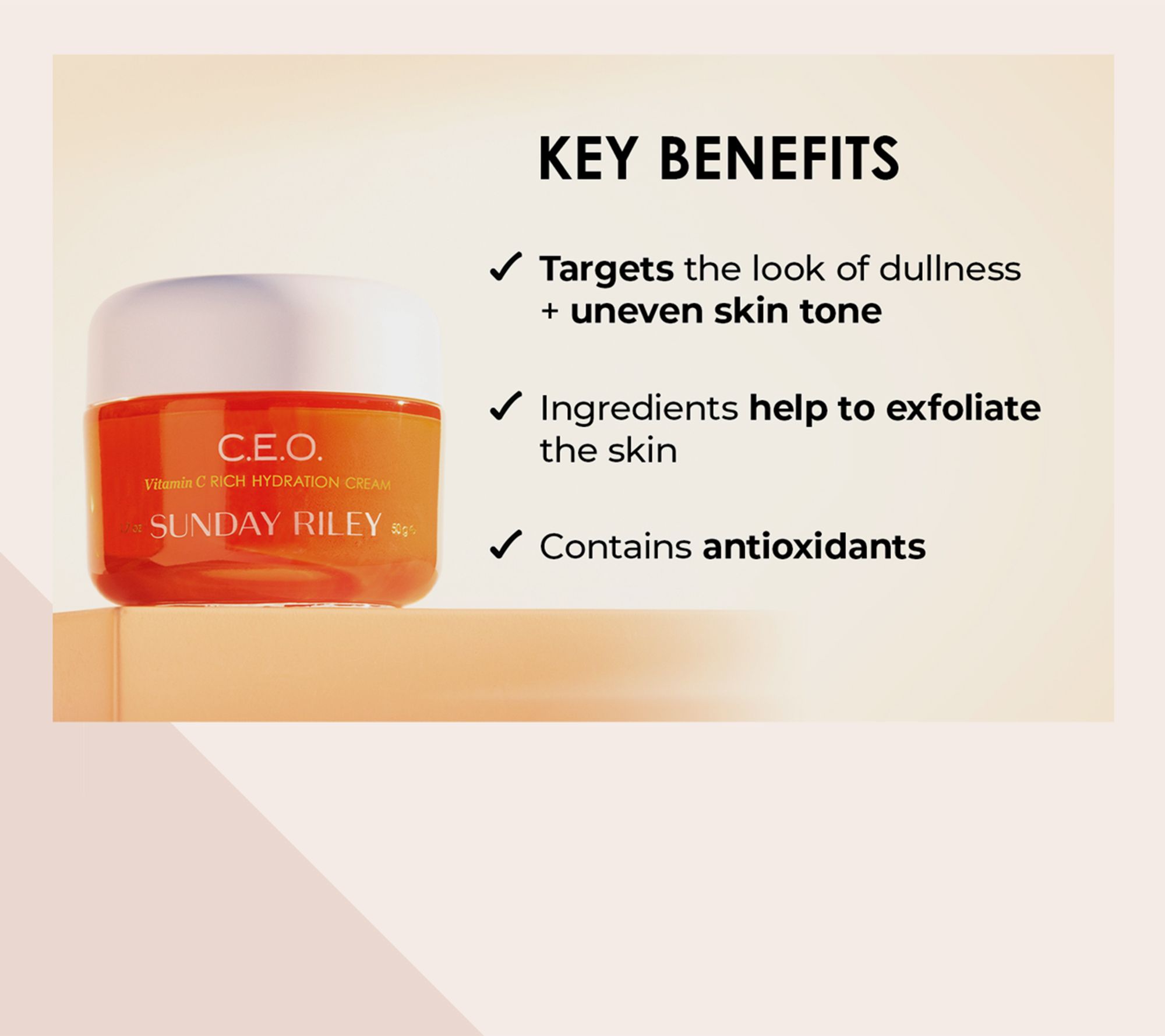 C.E.O. Vitamin C Rich Hydration Cream visibly brightens the look of dull skin and improves skin hydration. The cream is also formulated with lime pearl, a source of fruit acids that has been shown to help to exfoliate the skin.