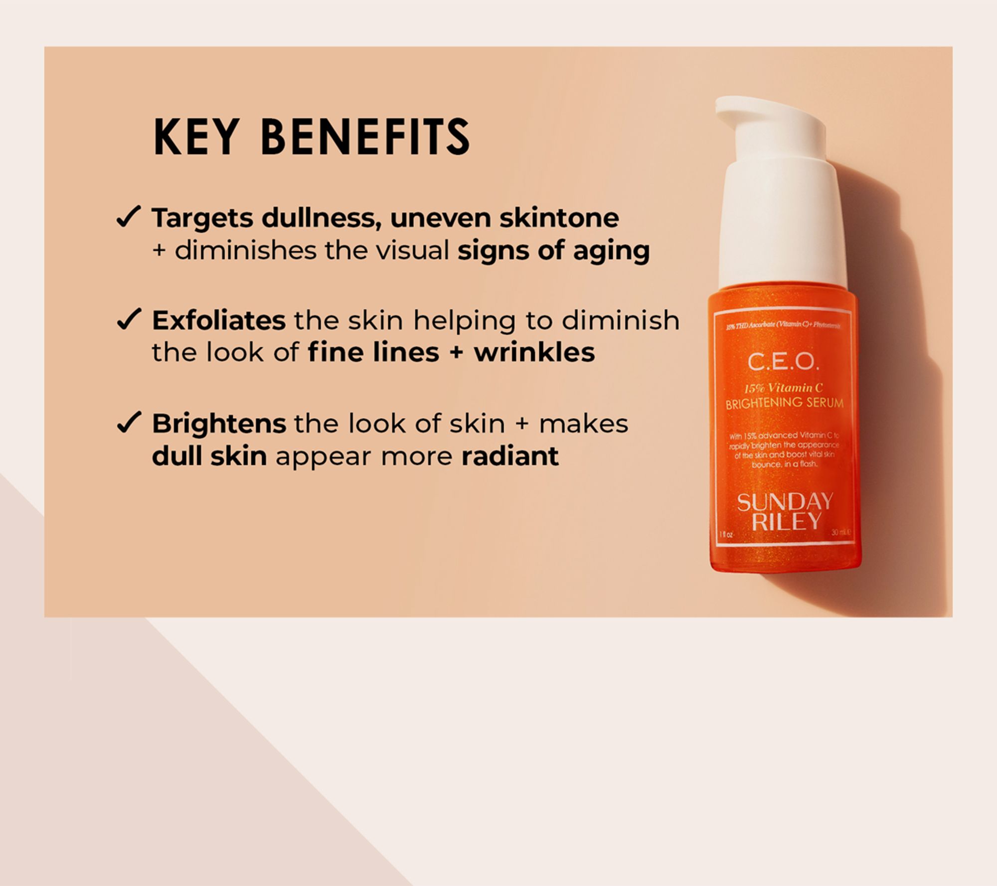 C.E.O. Vitamin C Brightening Serum targets the look of dullness and uneven skin tone while diminishing the visual signs of aging. In a test by an expert grader, the serum was shown to improve the appearance of brightness after using once daily for one and four weeks.
