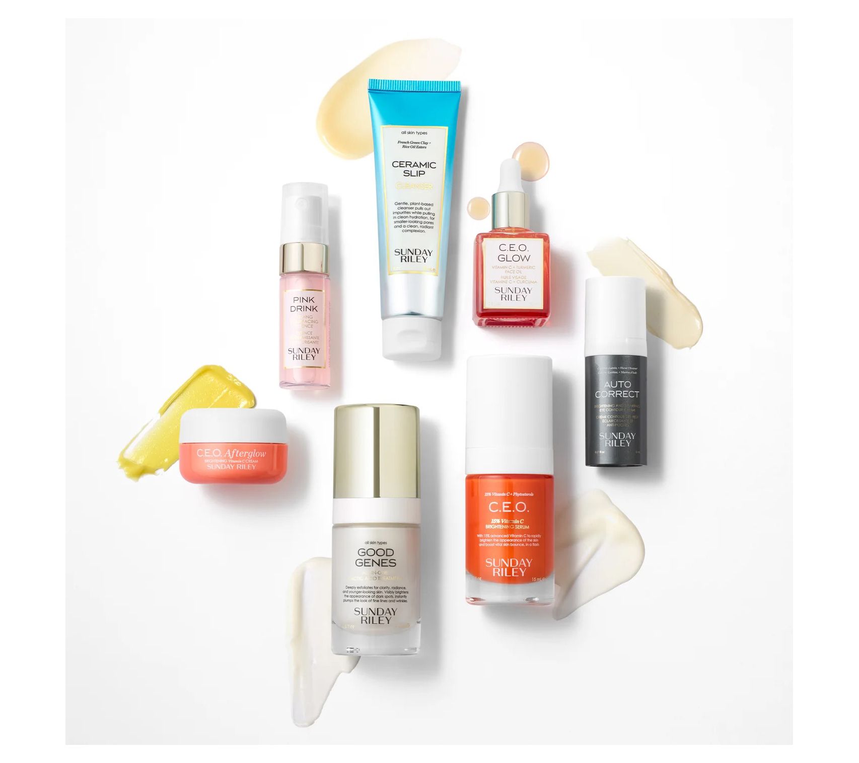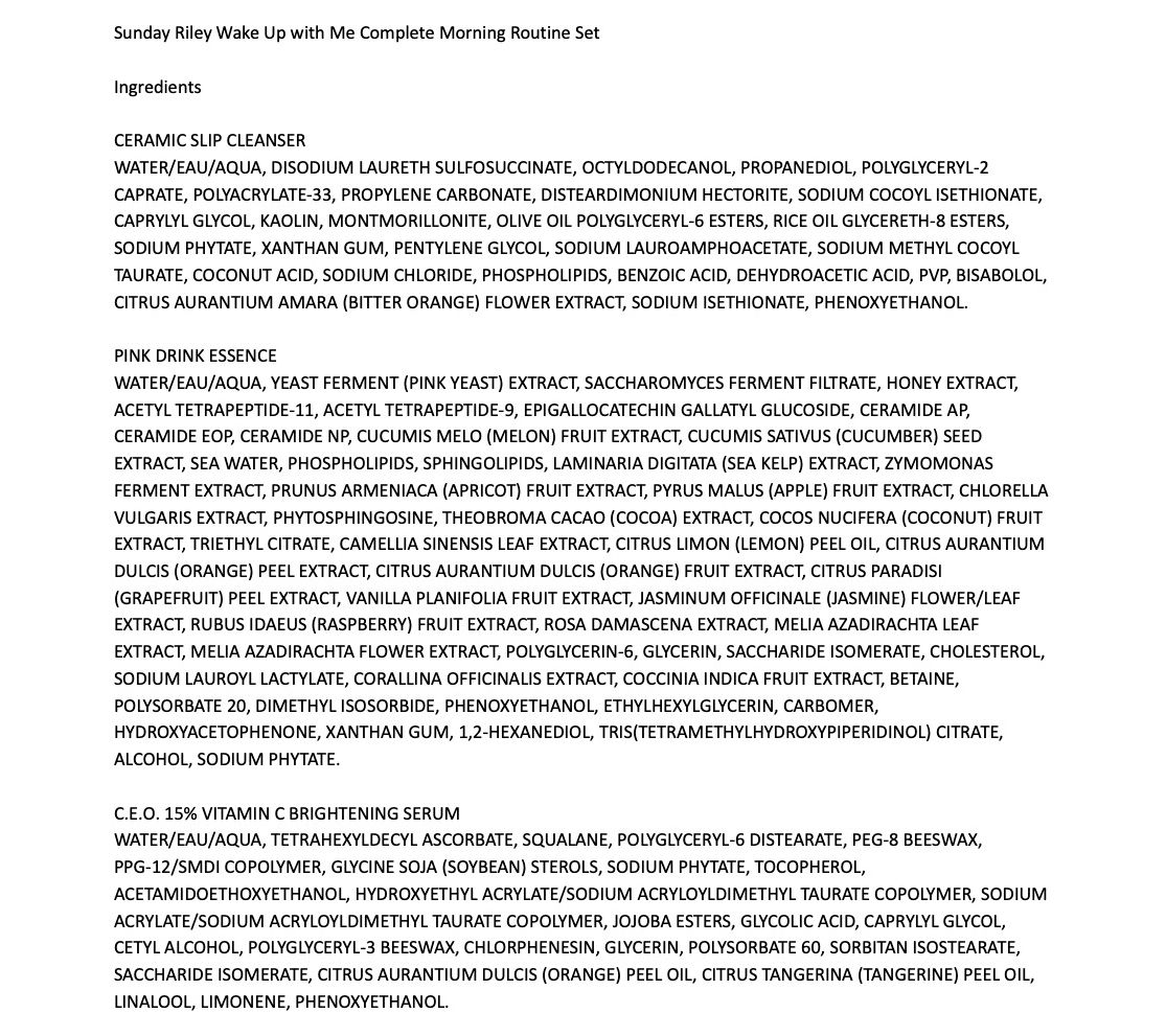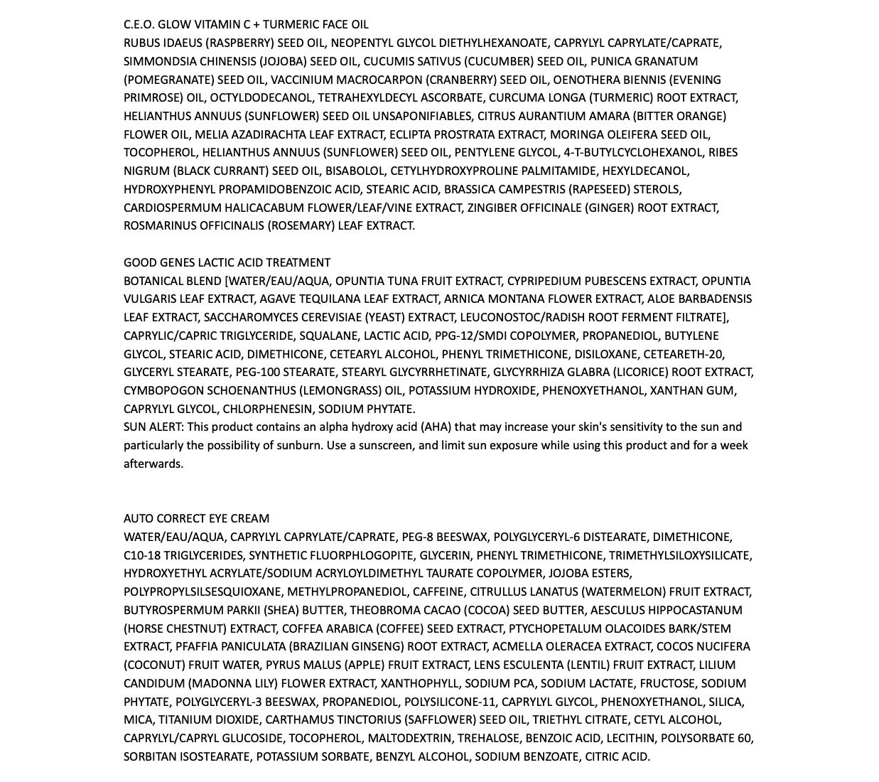 How do I use it: Cleanse with Ceramic Slip Cleanser. After patting your skin dry, mist Pink Drink Firming + Resurfacing Essence onto your face. Massage into your skin and let dry. Next, apply two to three drops of C.E.O. Glow Oil to your face and neck, followed by one to two pumps of C.E.O. Vitamin C Serum (or mix them together and apply as a skin cocktail). Follow with one to two pumps of Good Genes Lactic Acid Treatment to face and neck. Pat one to two pumps of Auto Correct Brightening + Depuffing Eye Cream around the eye area, starting under the eye and continuing to the outer corners (in the crow's feet area). Then apply under the brow bone, for a lifting effect. Lastly, apply C.E.O. Afterglow Cream to face, neck, and decollete.