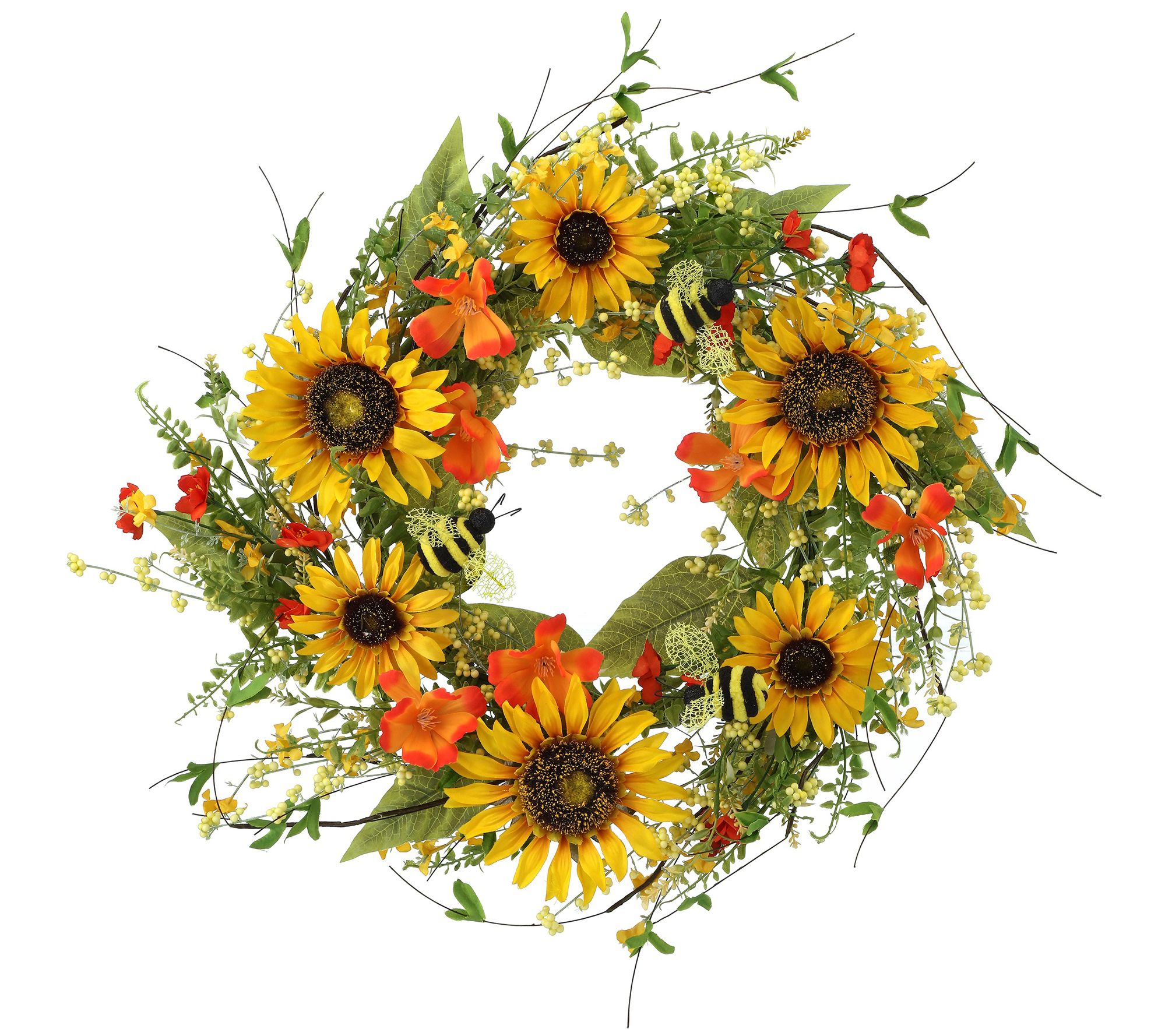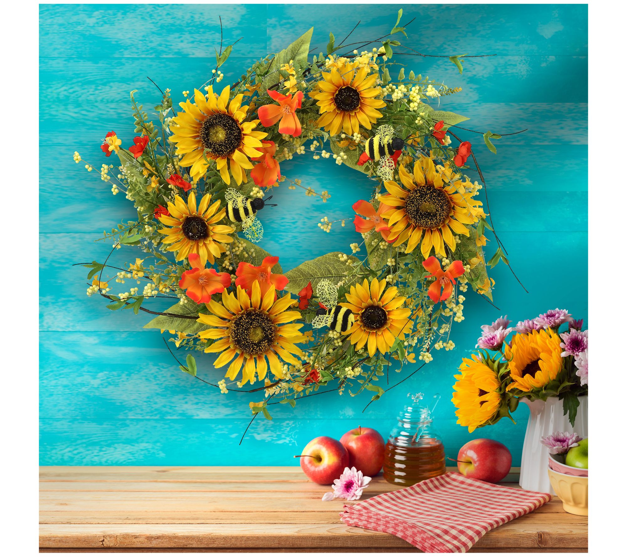 Welcome spring (and your guests!) with the vibrant beauty and realistic look of this gorgeous wreath featuring faux sunflowers and honey bee accents. From the Valerie Parr Hill Collection.