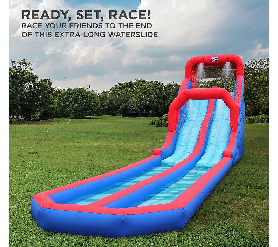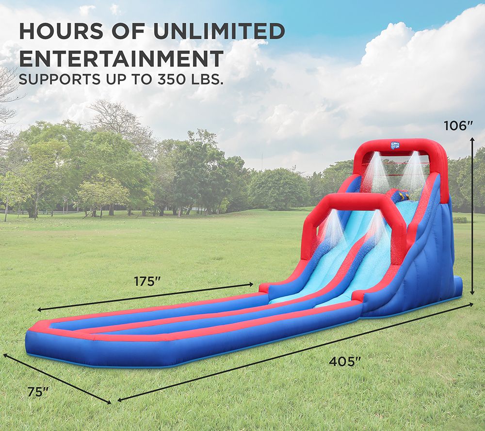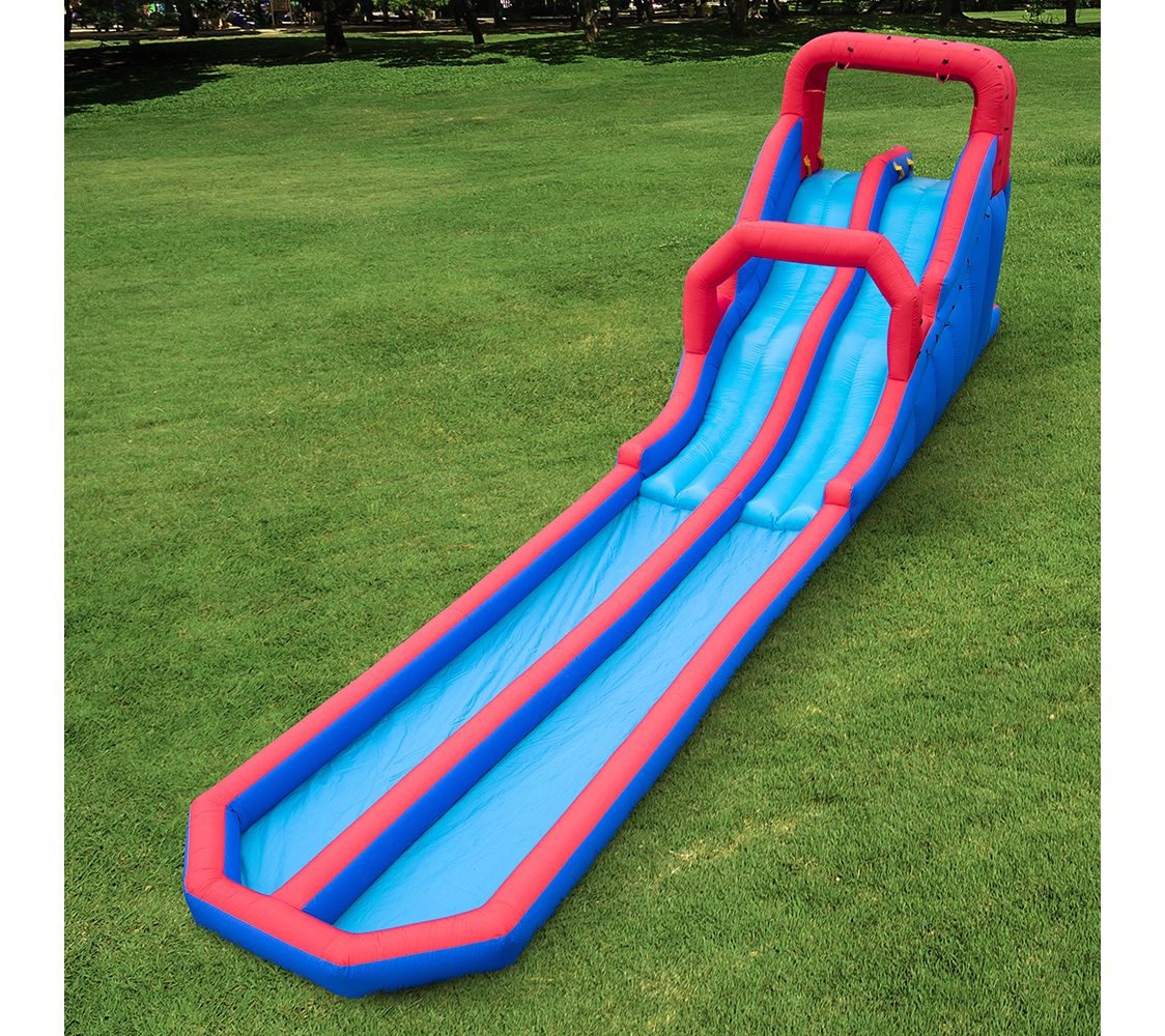 • Includes inflatable water slide, air pump, carrying case, repair kit, air pump, four stakes, eight water slide stakes, hose assembly kit, hose connector, and storage strap