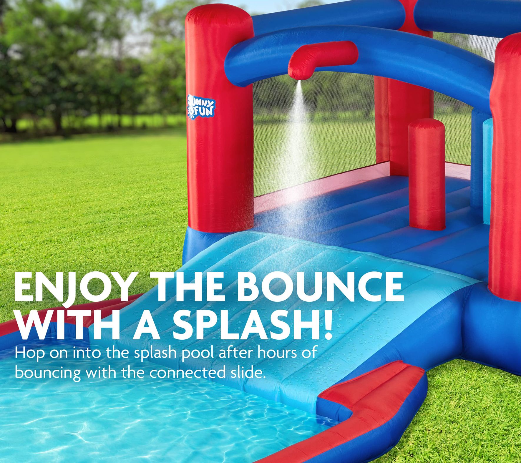 One part bounce house and one part water slide, this Slide N' Splash inflatable water park brings double the summer excitement to your backyard. From Sunny & Fun.