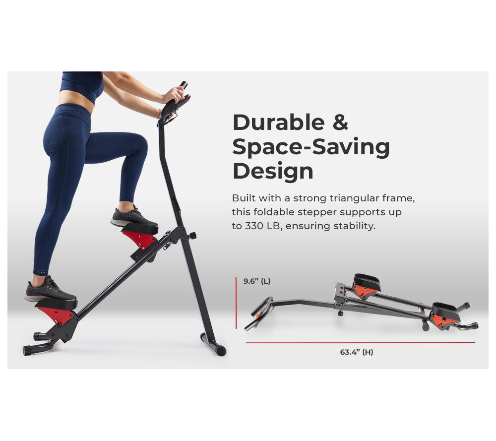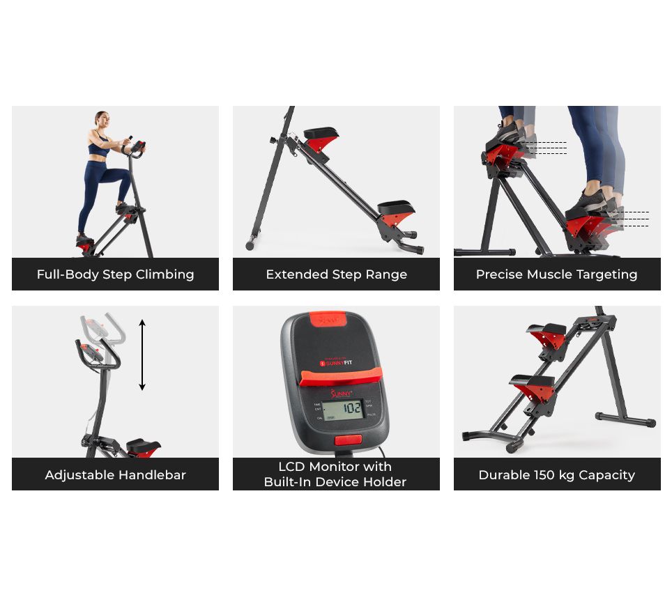 Take your workout routine to new heights with the Sunny Foldable Smart Cardio Step Climber. Enhance your fitness regime with a stepper climber designed to replicate climbing, providing a full-body workout while protecting your joints. Connect to the SunnyFit app via Bluetooth for a variety of workouts and real-time tracking. The adjustable handlebars and customized step height ensure a comfortable and personalized experience. From Sunny Health & Fitness.