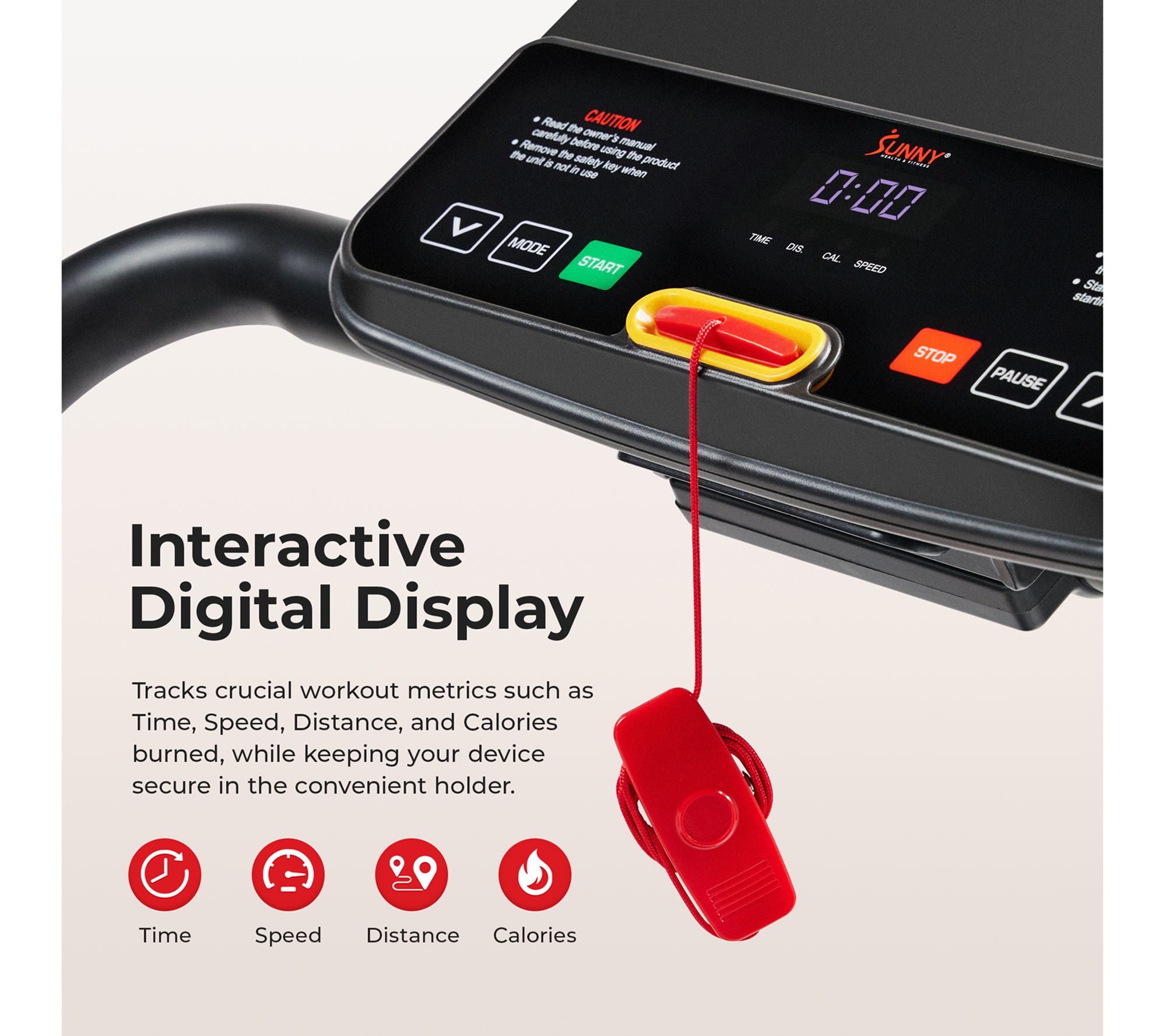 Experience the convenience of a gym-quality workout at home with the Sunny Smart easy assembly folding treadmill. Perfect for small spaces, it offers a maximum speed of 6.5 mph and features Bluetooth connectivity for access to over 1,000 training videos. The digital display tracks your progress, while the quiet motor and foldable design ensure a seamless fitness routine. From Sunny Health & Fitness.