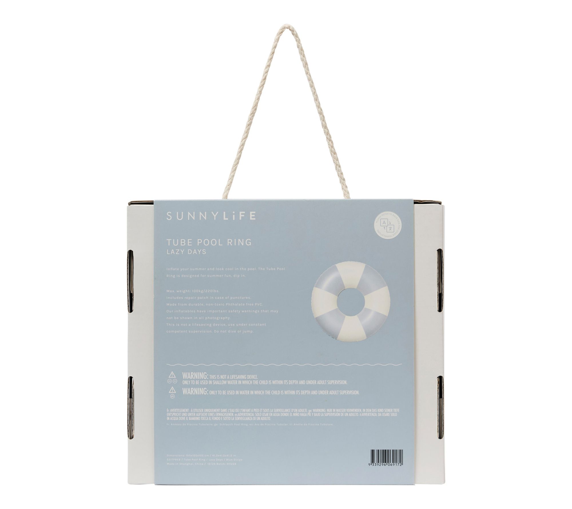 Let the summer vibes wash over you as you relax in style on this charming pool ring. Immerse yourself in the soothing duck egg blue design, whether you're unwinding under the sun or simply drifting through tranquil waters. From Sunnylife.