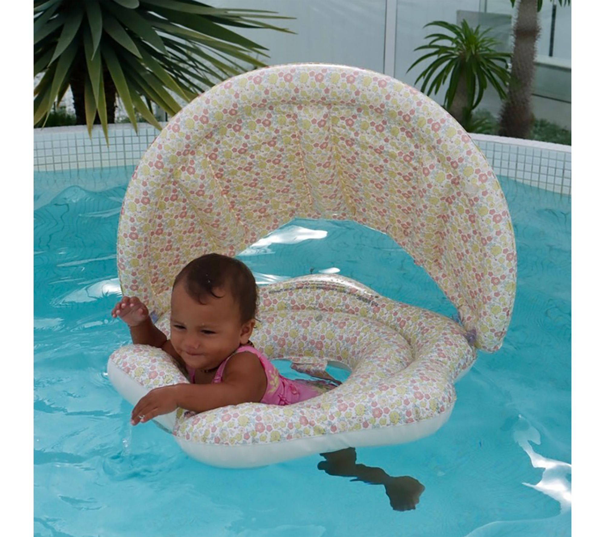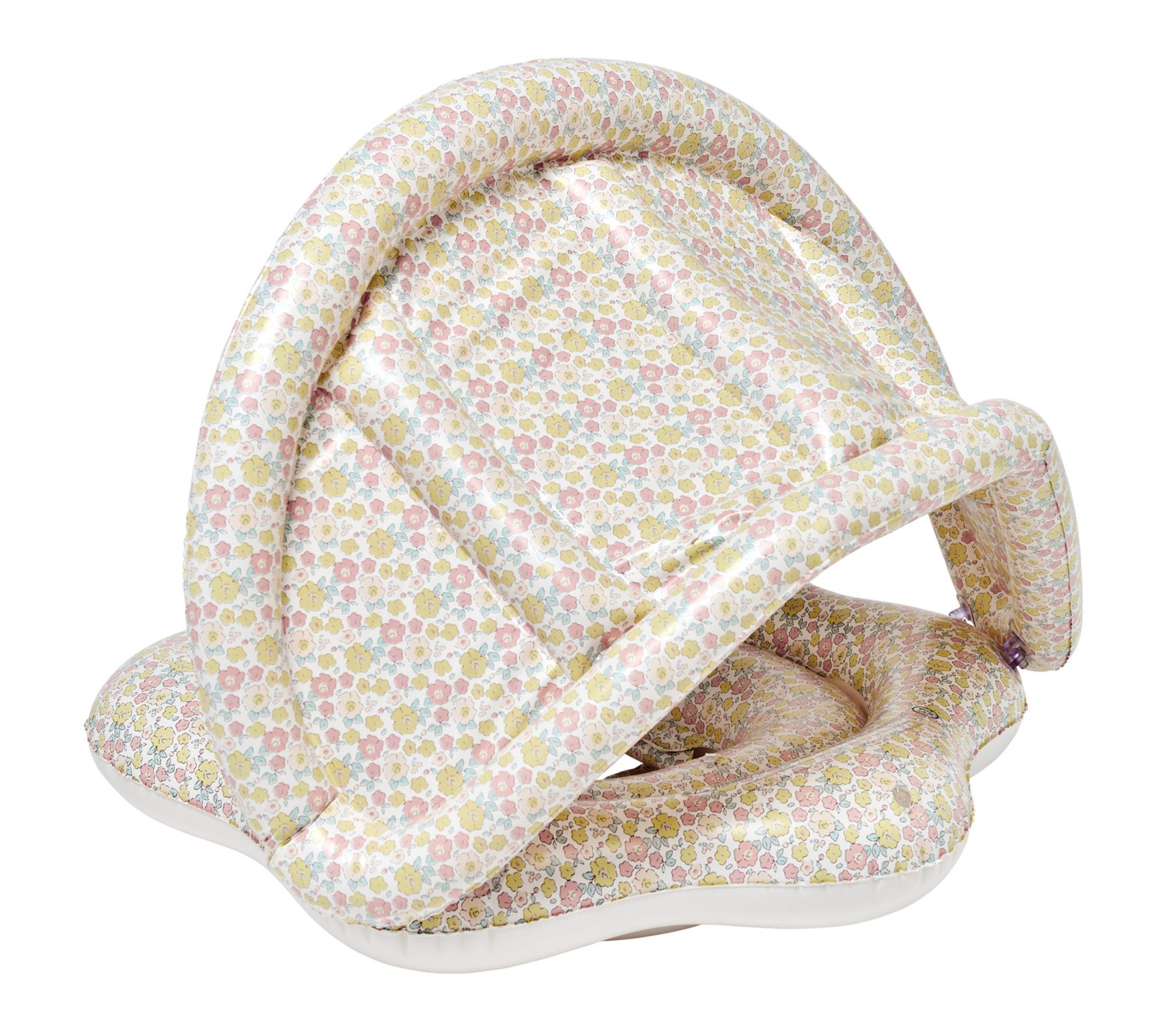 Sunny days bring sparkling fun with this flower-shaped baby pool float, designed with soft leg supports and a cozy headrest to keep your little one comfortable as they gain confidence in the water. Its playful cream, yellow, and pink floral pattern adds a joyful touch, while a removable canopy provides shade for care-free splashing. From SUNNYLiFE.