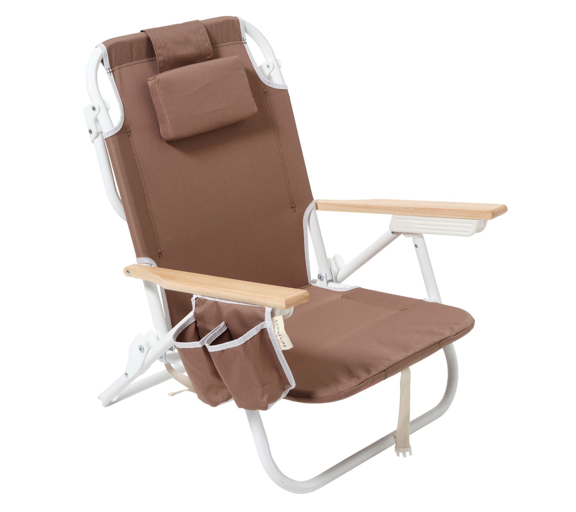 Taking your seaside comfort to the next level, this beach chair invites you to relax in style all summer long. Imagine settling into its premium support as you bask in the sun's warmth, with five recline positions tailored to your ideal level of comfort. Need to refresh? Reach into the insulated zip cooler pocket and enjoy a chilled drink without leaving your spot. As you pack up, transform the chair into a convenient backpack for effortless carrying. This versatile seat is designed to keep you comfortable and cool. From Sunnylife.
