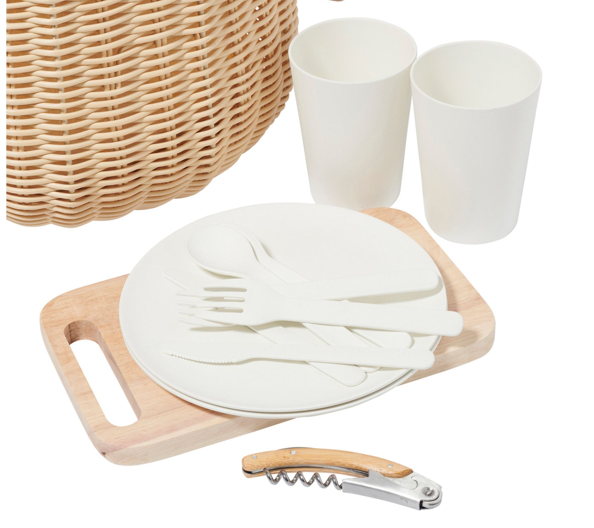 • Includes picnic basket, two cups, two plates, two cutlery sets, bottle opener, and cutting board