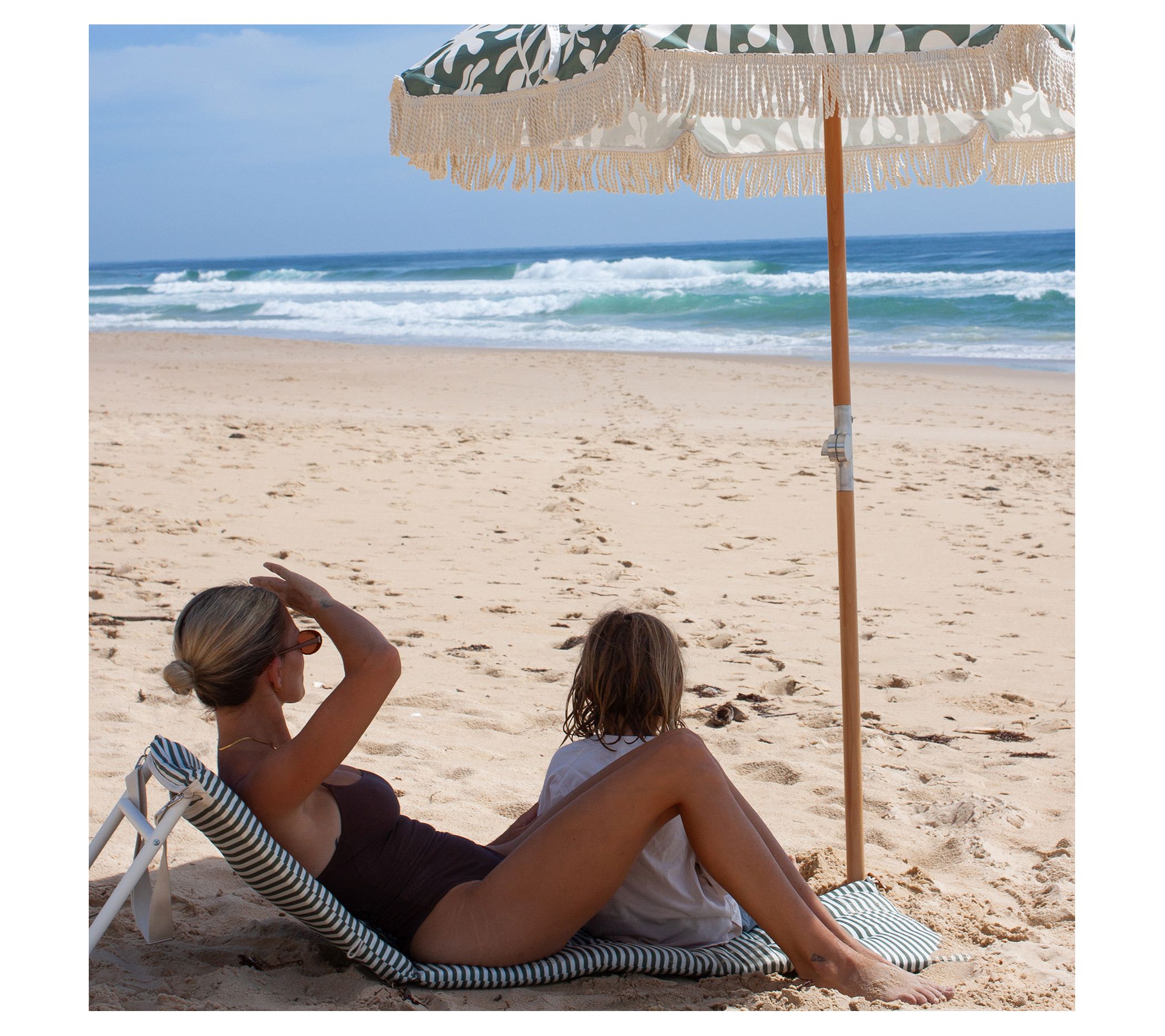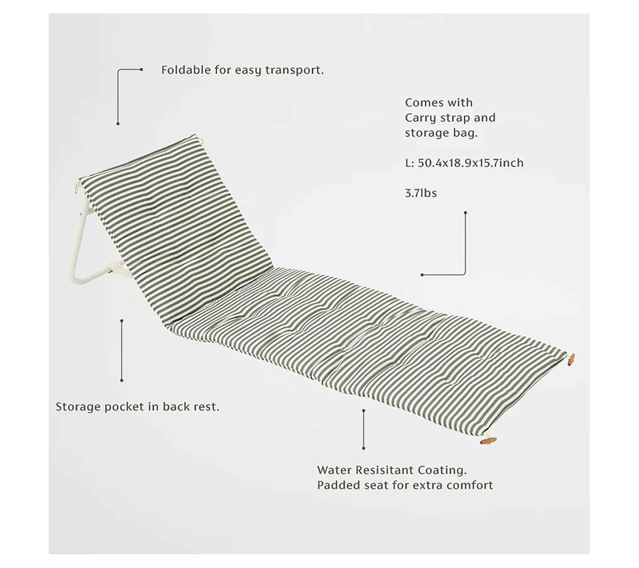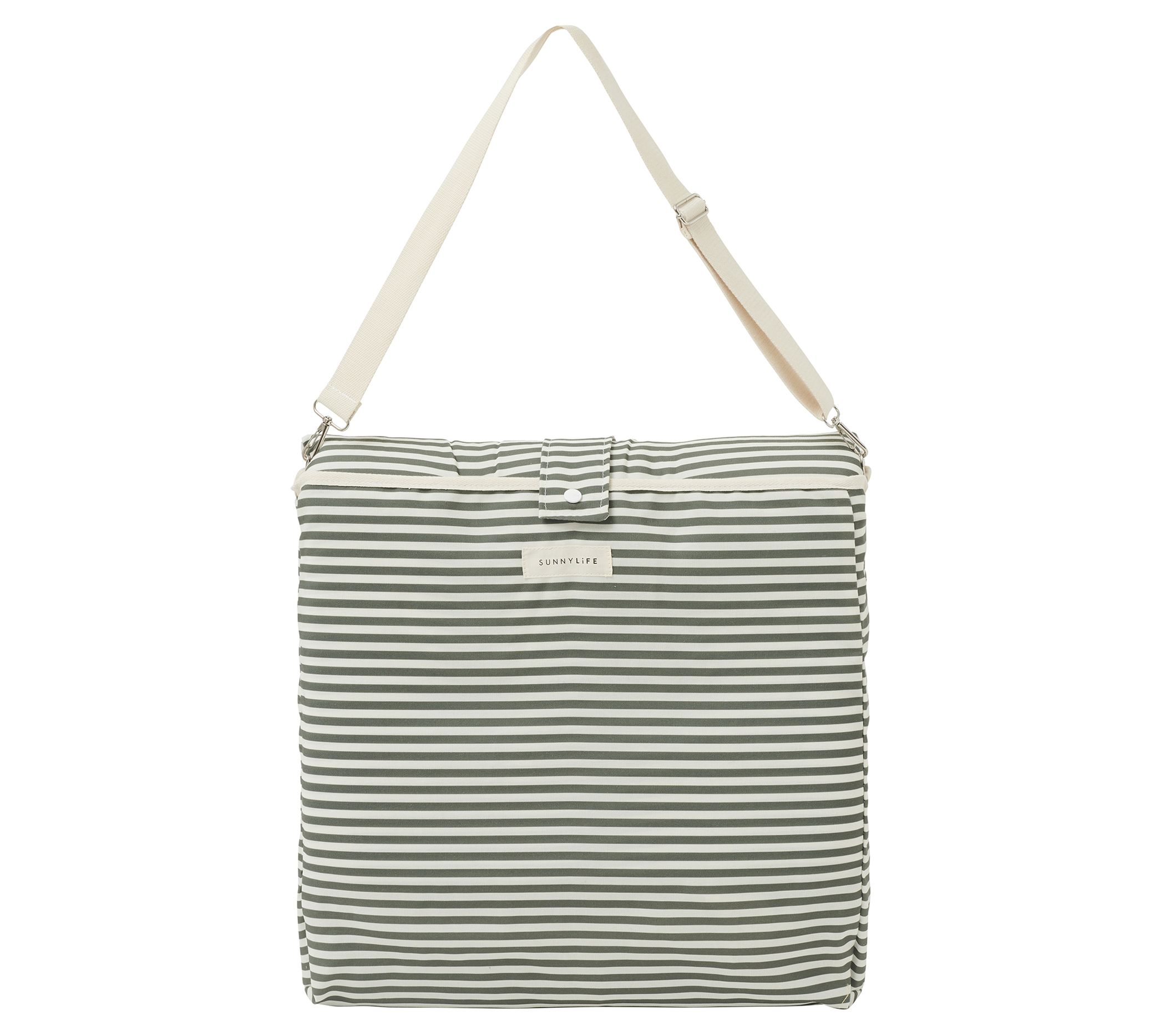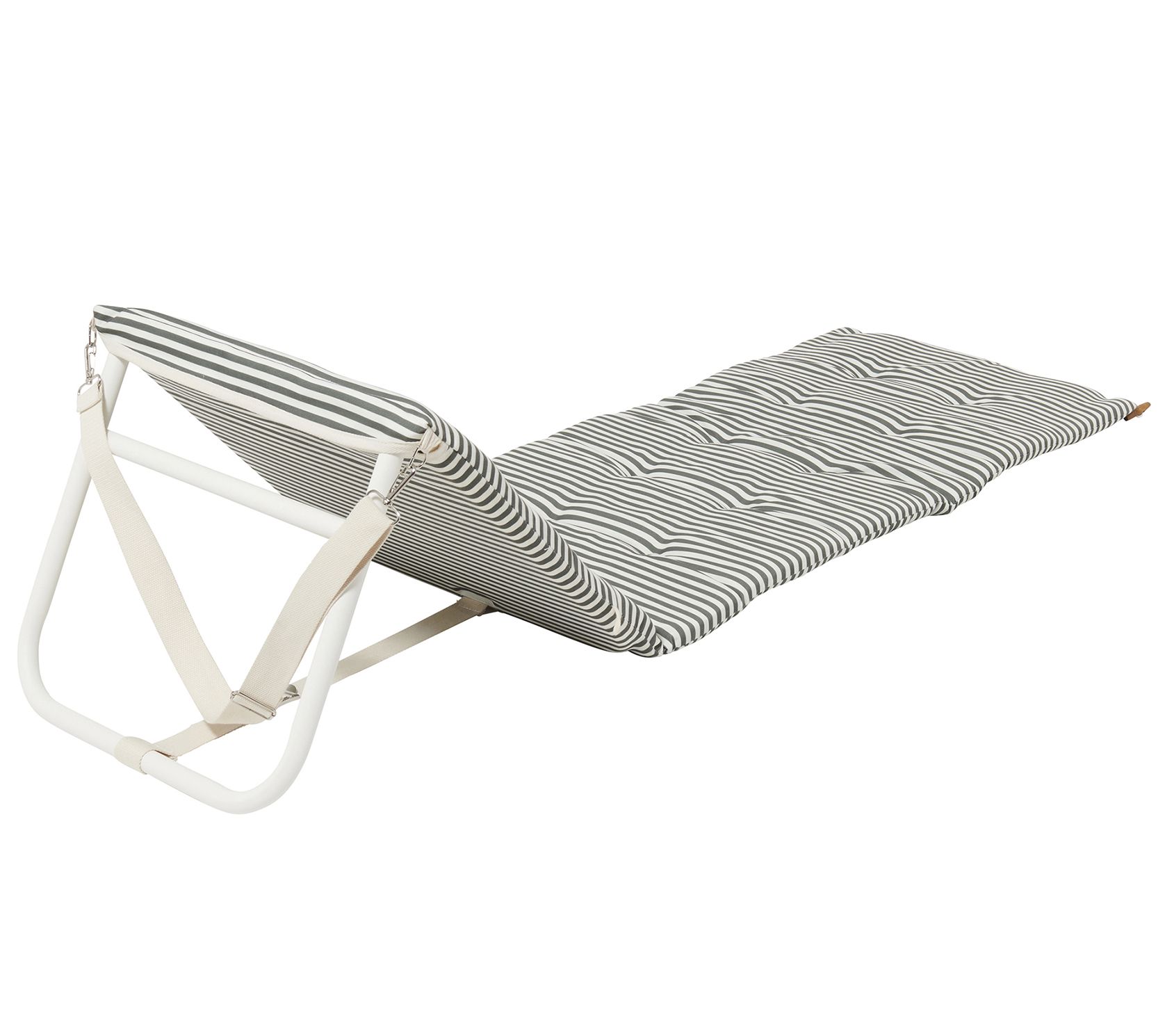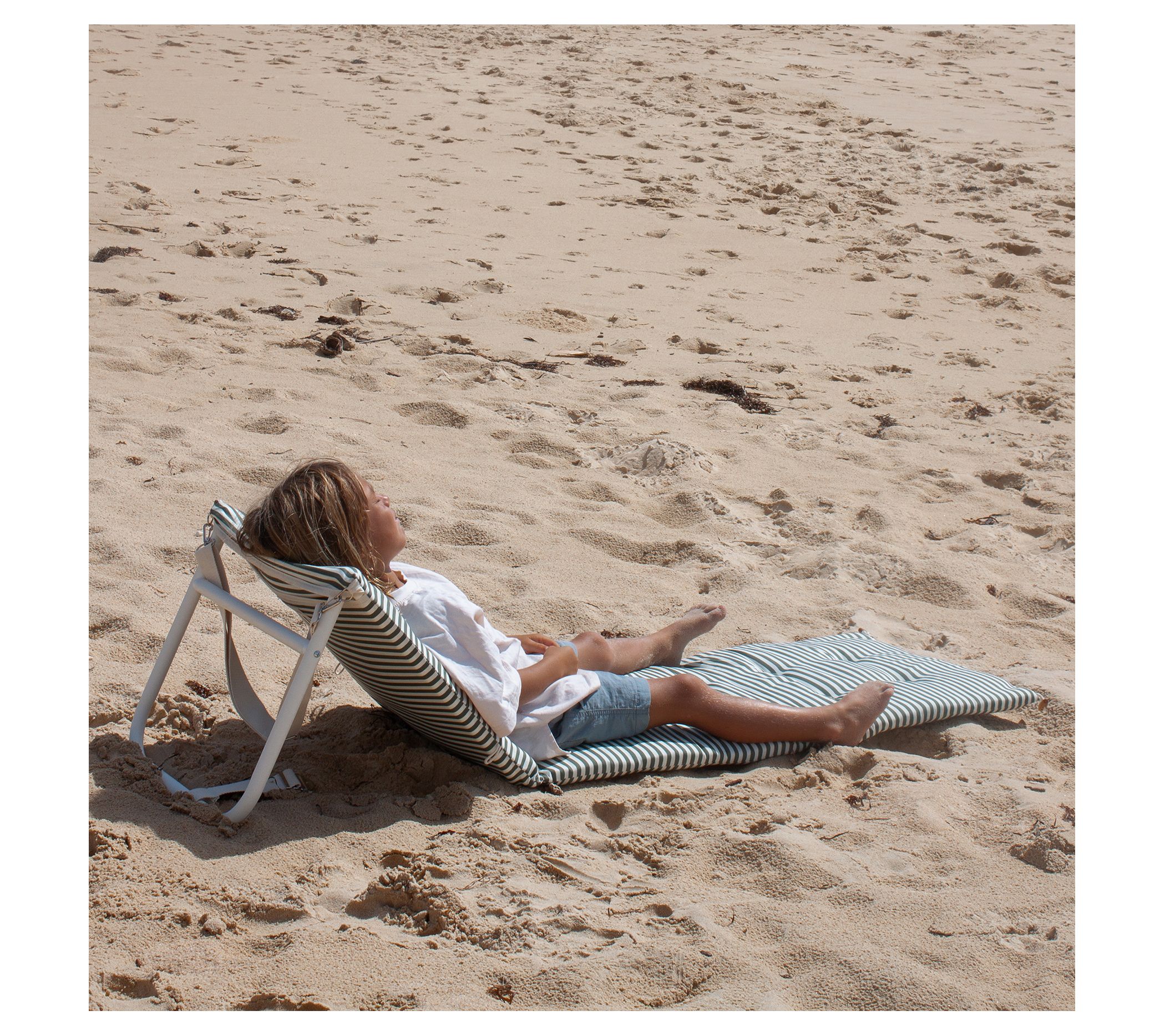Recline in comfort with the Sunnylife reclining beach chair. Perfect for long days under the sun, this chair features a fully adjustable backrest and a chic olive and cream maxi stripe print. Made from cushioned cotton canvas, it's designed for easy transport with a foldable design, carry strap, and storage bag. From beach to park to pool, claim your sunshine in style. From Sunnylife.
