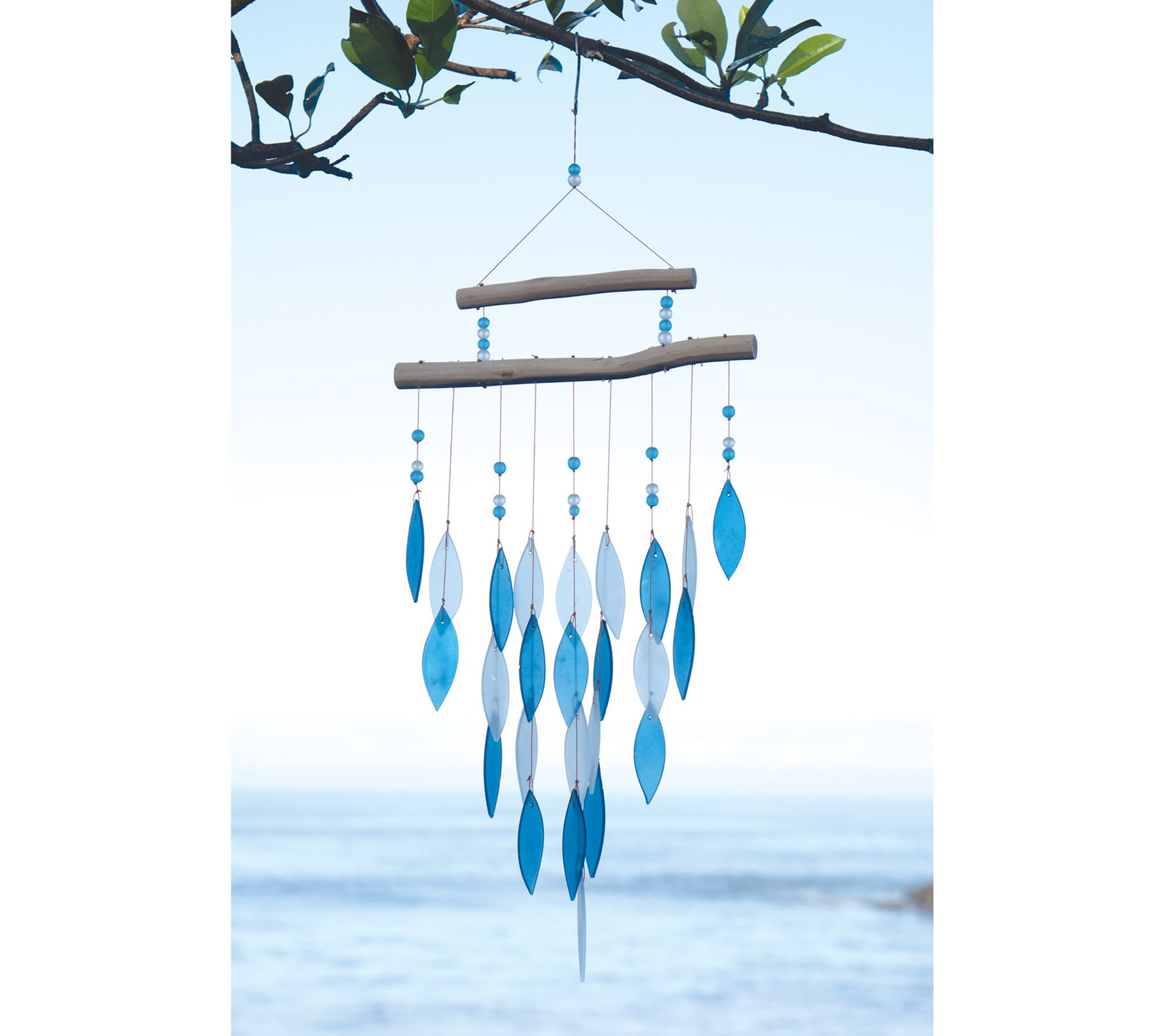 Transform your outdoor space into a serene oasis with this beautiful blue wind chime. The sandblasted glass pendants create a soothing melody reminiscent of gentle waterfalls, perfectly complemented by the driftwood sailboat that adds a touch of natural charm. Hang it up and let the relaxing sounds take you away. From Sunset Vista Designs.