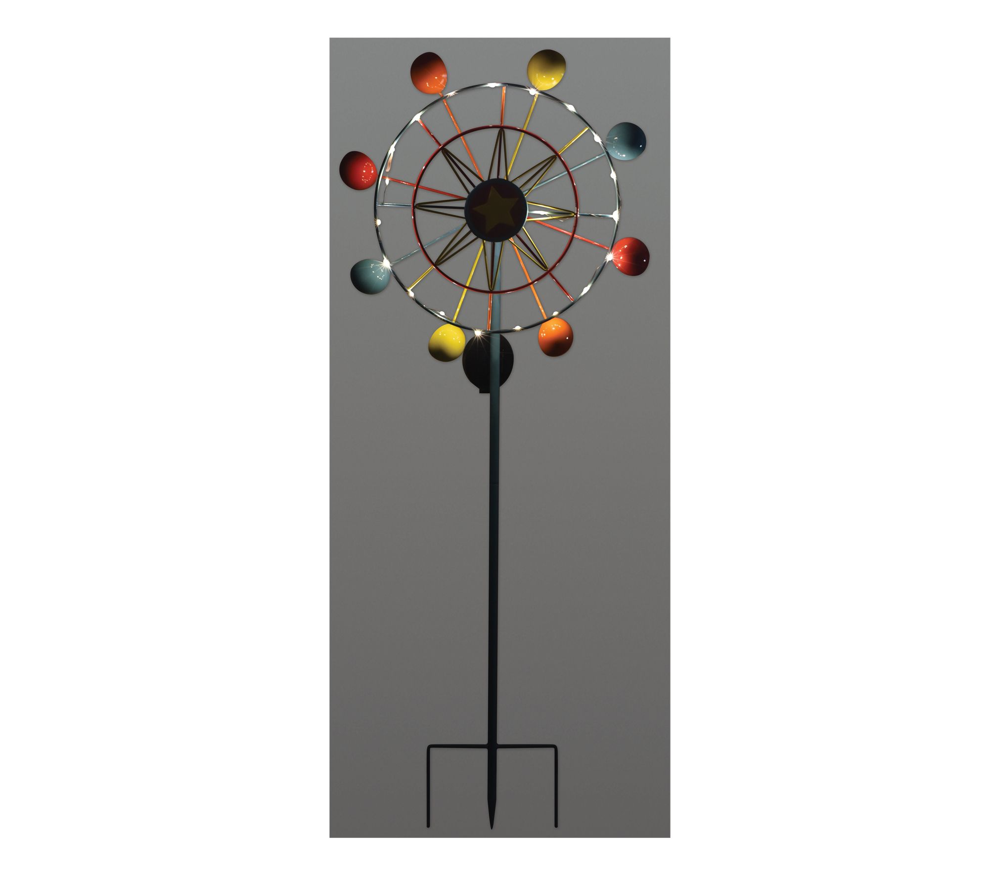 Bring a sense of wonder to your yard with this Ferris Wheel Solar Spinner, inspired by classic carnival rides and bursting with retro circus colors. Watch as the wind sets the vibrant cups spinning by day, while fairy lights twinkle at night thanks to an auto dusk-to-dawn sensor. It's a magical accent that adds playful movement and glowing charm to your outdoor space. From Sunset Vista Designs.