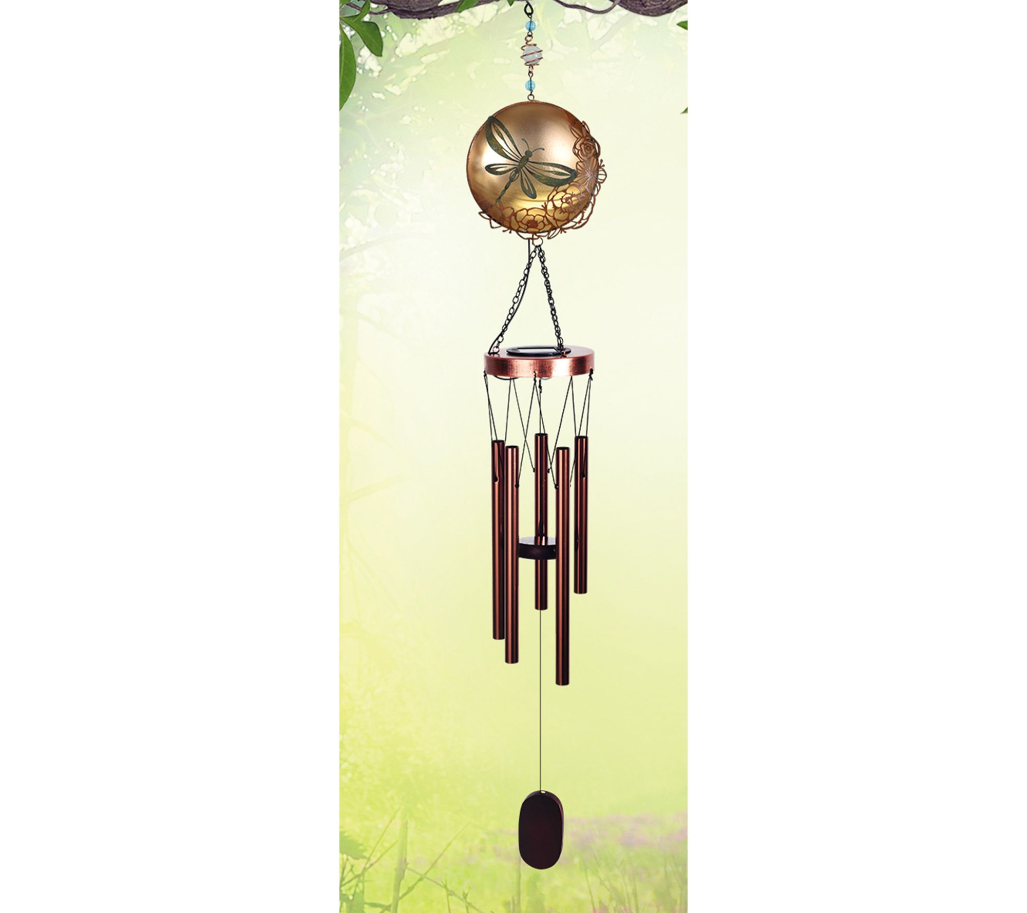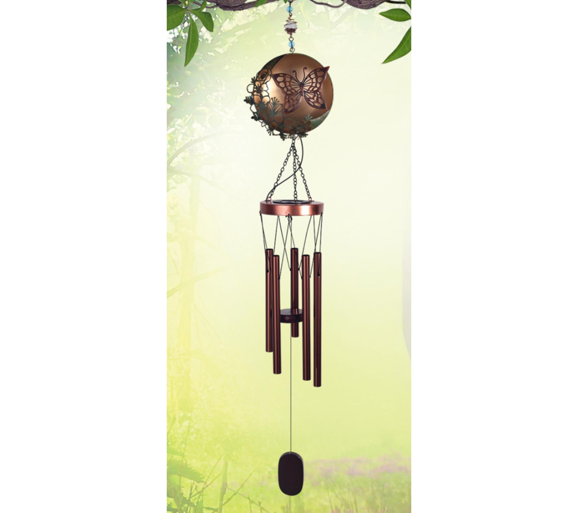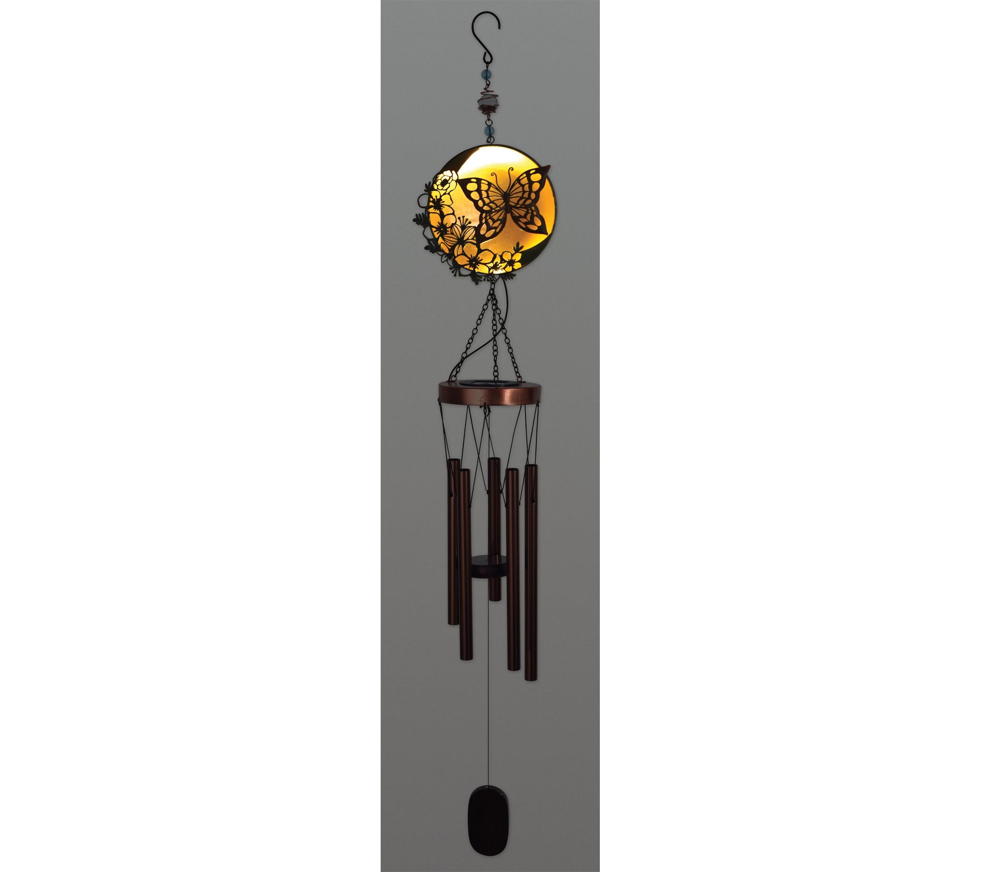 Let soft, melodic notes and a gentle glow transform your evenings with this solar wind chime, featuring a butterfly, dragonfly, or hummingbird design that captures the magic of moonlit nights. Five bronze chime tubes and a wooden clapper create soothing sounds, while a dusk-to-dawn sensor brings your garden or patio to life as the sun sets. From Sunset Vista Designs.