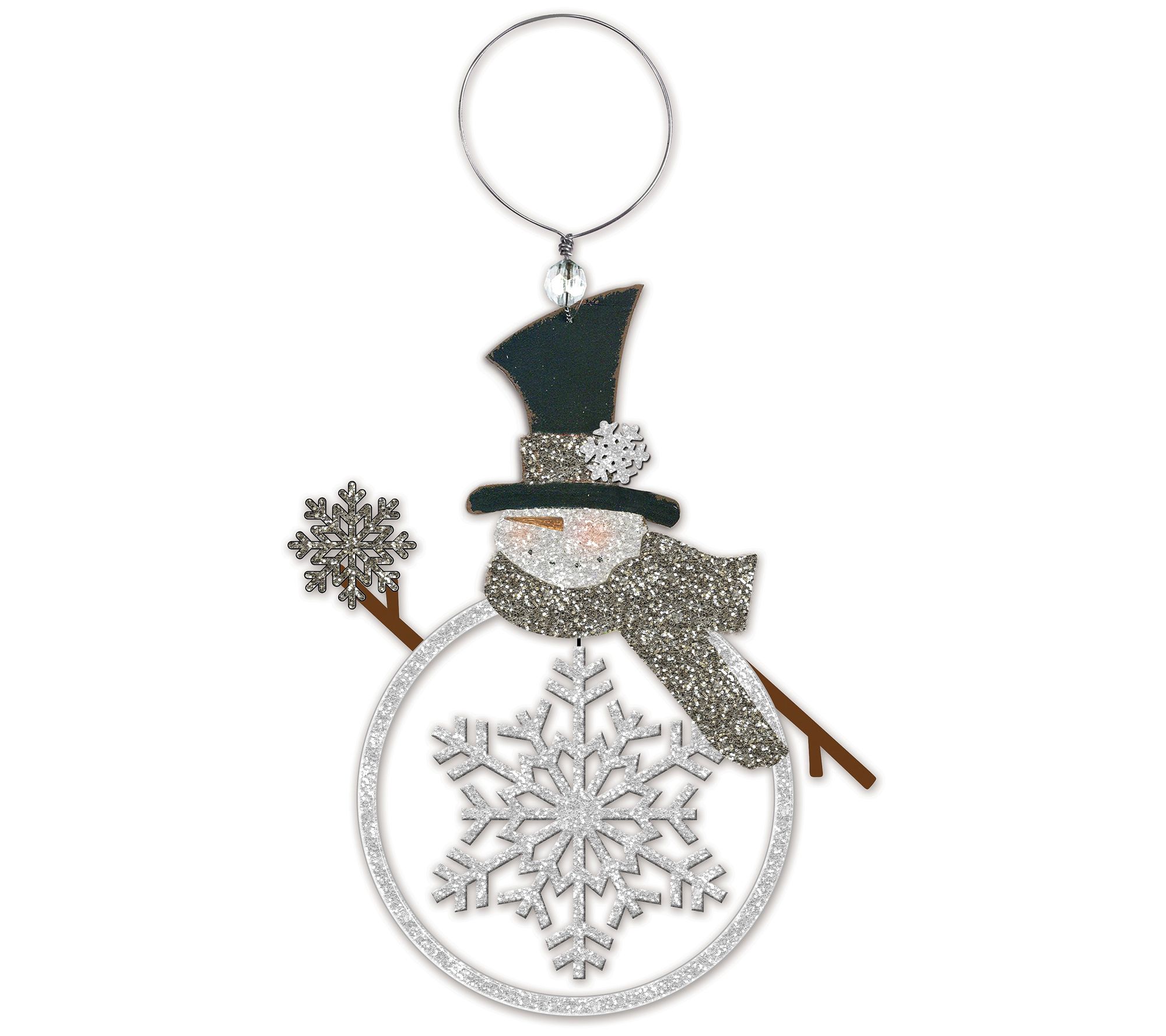 Update your decor with festive flair by decking the halls with these whimsical snowmen ornaments showcasing a glittered design for some added sparkle. From Sunset Vista Designs.
