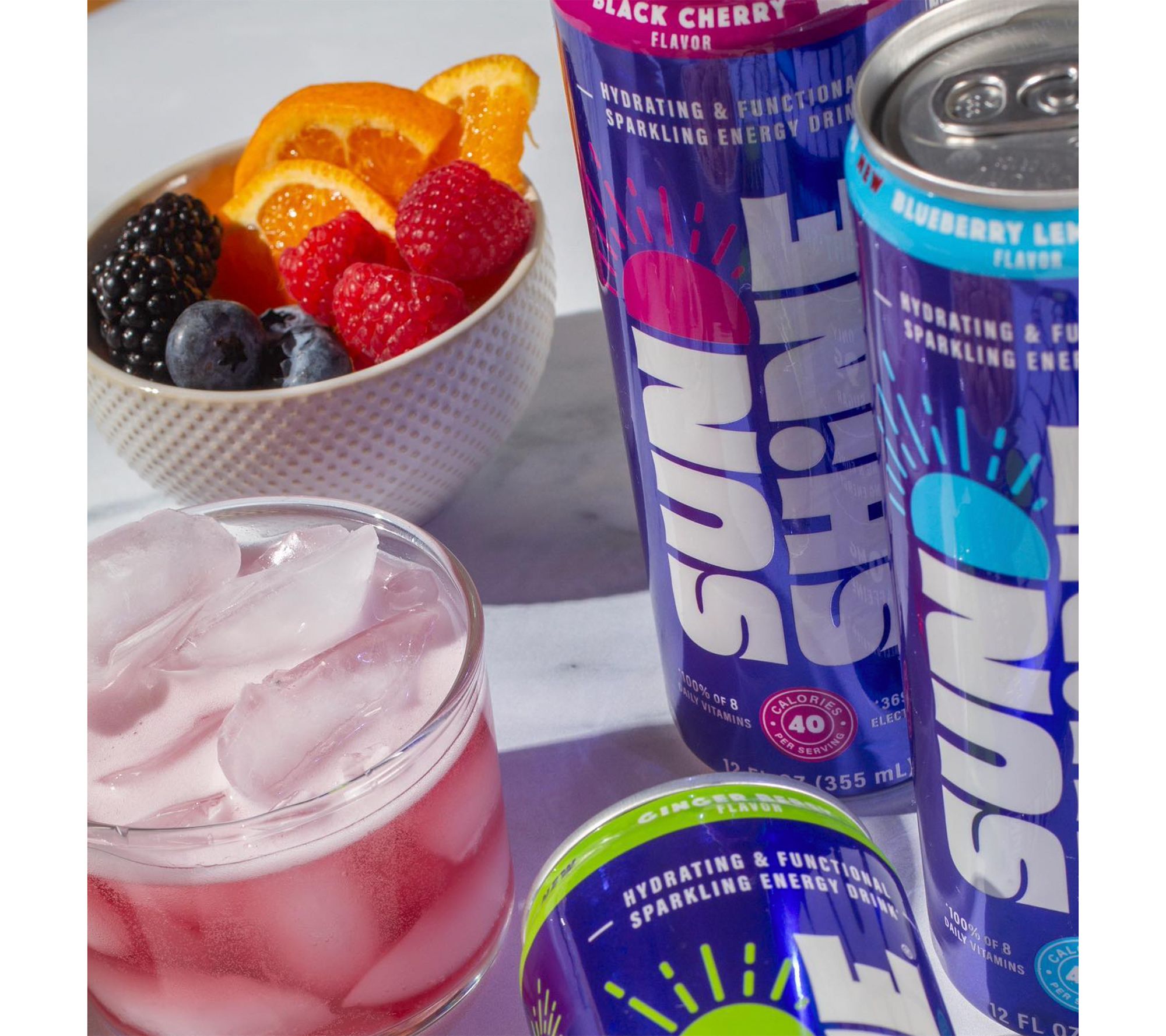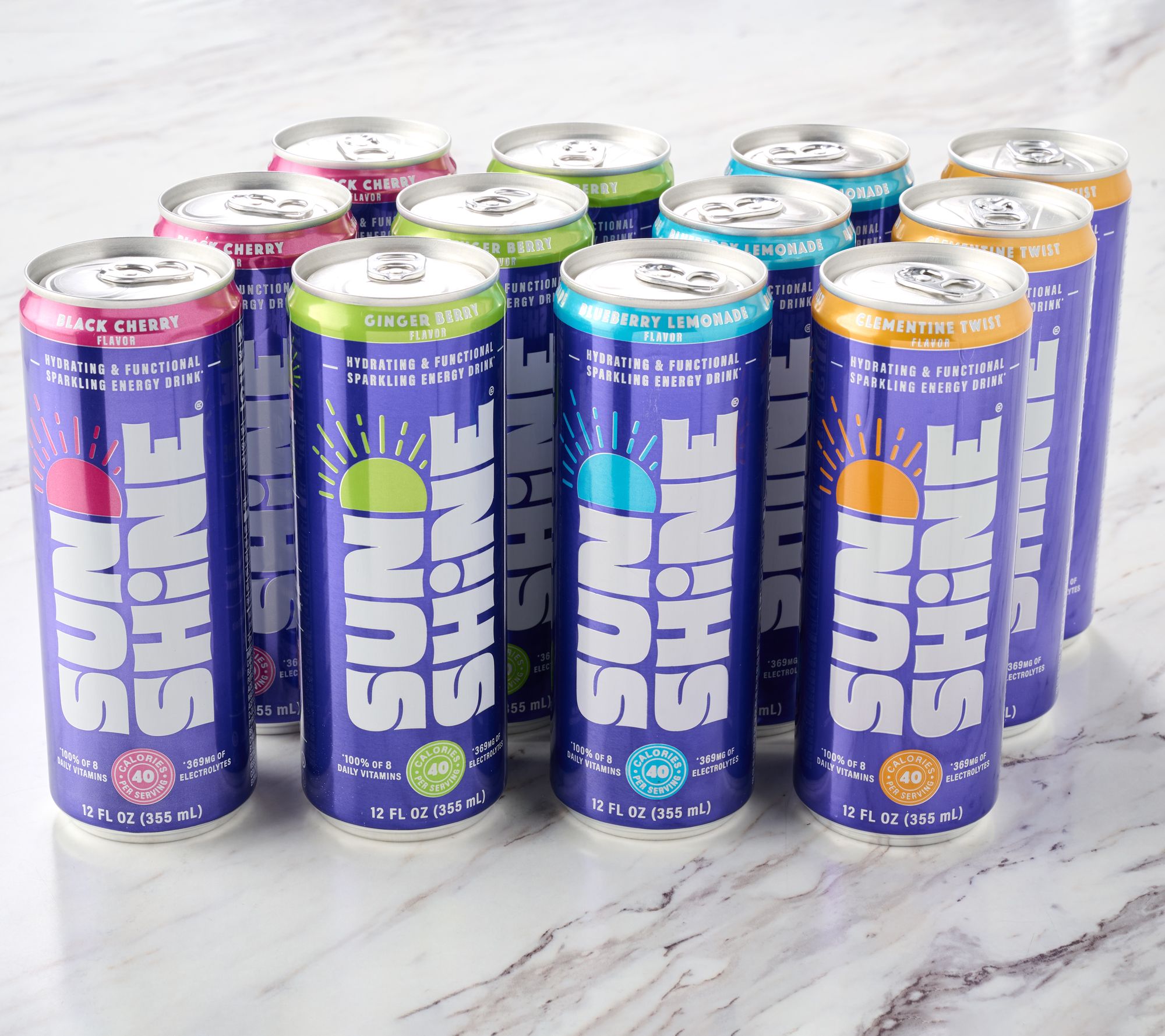 Reach for a sparkling energy drink that fuels your day -- on the way to work, after a brisk walk, or while tackling that afternoon slump. Infused with craveable flavors, these drinks are a welcome addition to your routine. Each can delivers 100% daily value of eight essential vitamins, 365mg of electrolytes, and 70mg of caffeine sourced from green coffee beans. With just 40 calories per can, no sugar alcohols, and no synthetic colors, Sunshine is a refreshing, feel-good choice. From Sunshine Beverages.