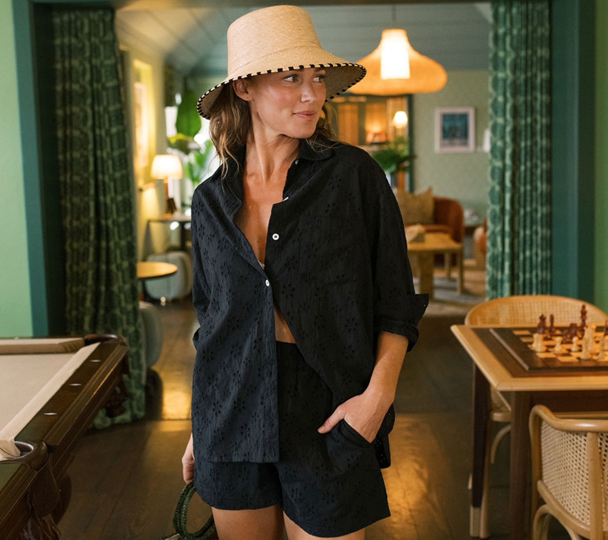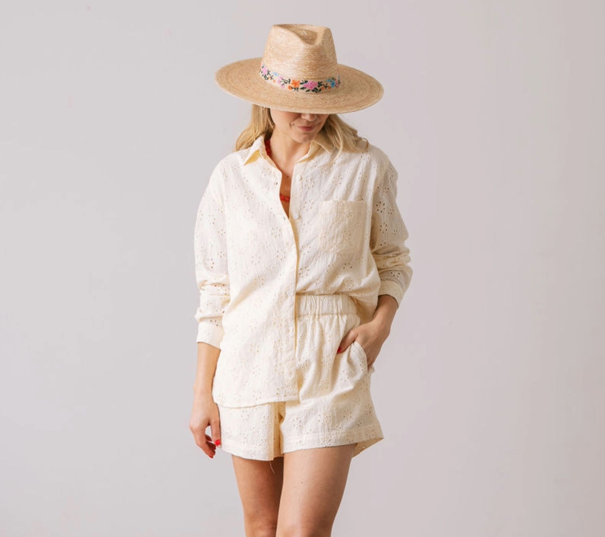 Grab your favorite sunhat and enjoy a day under the sun in this fun and fresh bermuda set. With delicate eyelet detailing and breathable cotton, it's a delightful pick for relaxed summer outings or poolside lounging. From Sunshine Tienda.