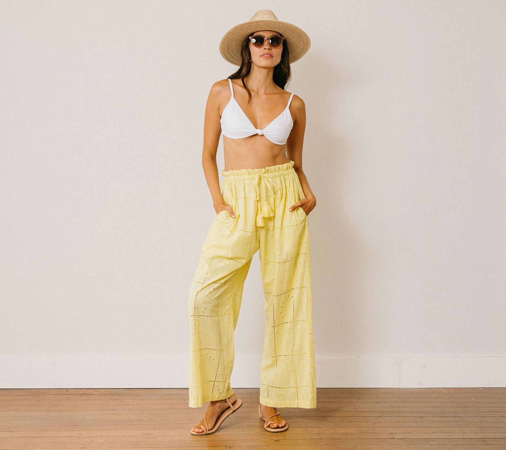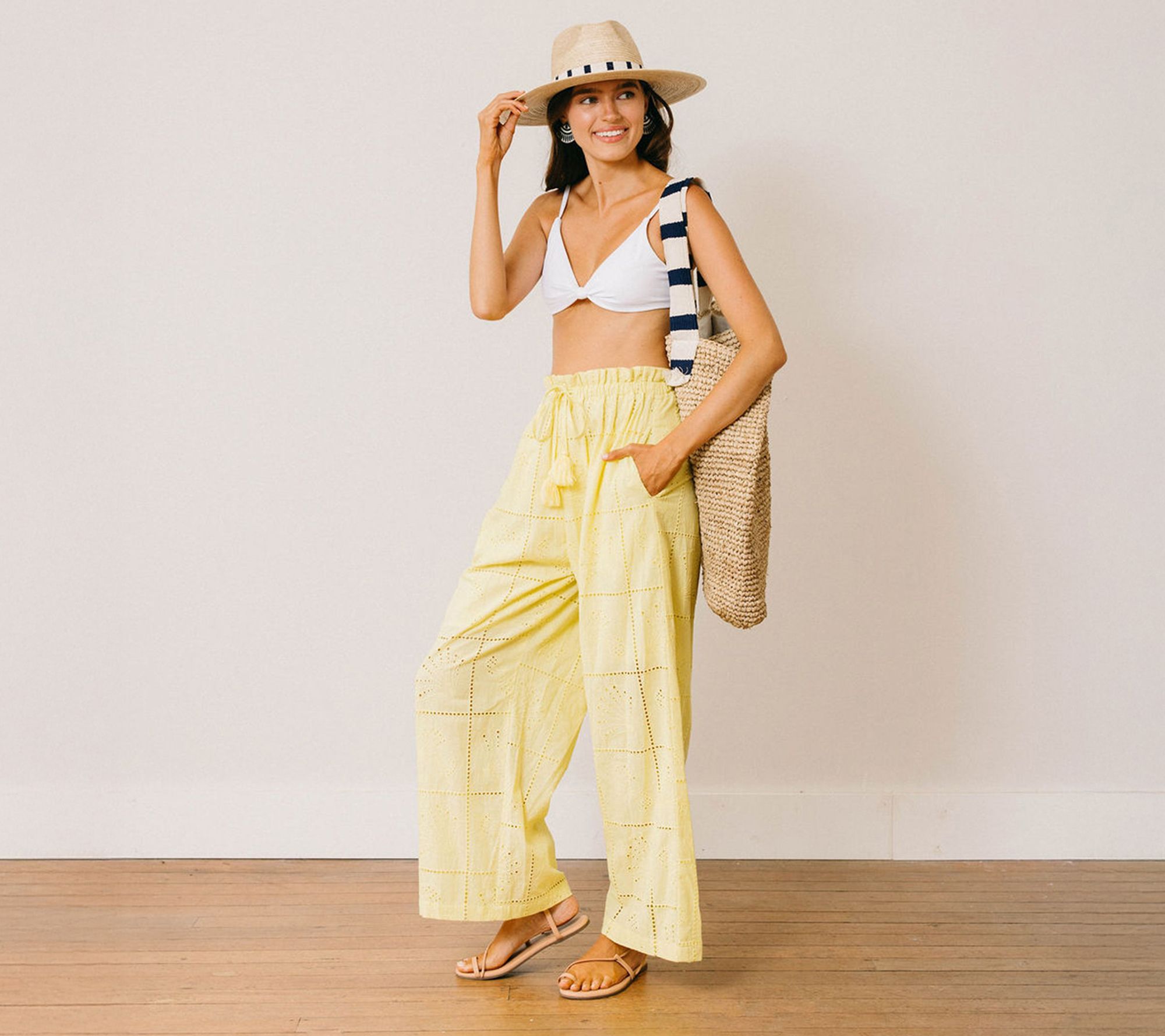 Step up your spring and summer style with these relaxed wide-leg pants, designed for both comfort and flair. Crafted from 100% cotton, these pull-on pants feature an adjustable drawstring waist with fun tassel ties for a personalized fit. Eyelet fabric detailing adds feminine charm, while the comfy elastic waist provides an easy relaxed feel. From Sunshine Tienda.