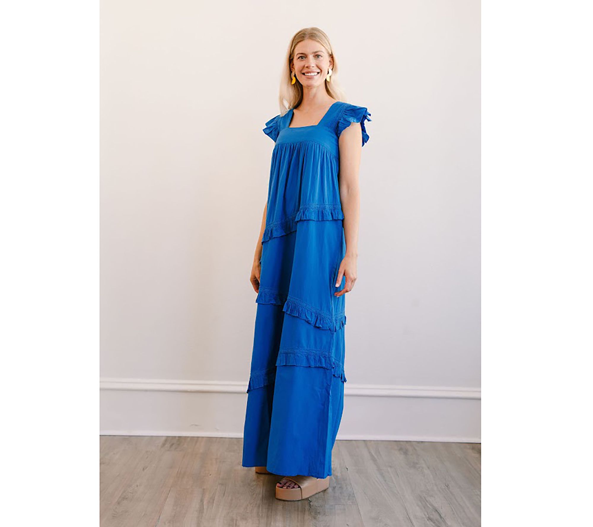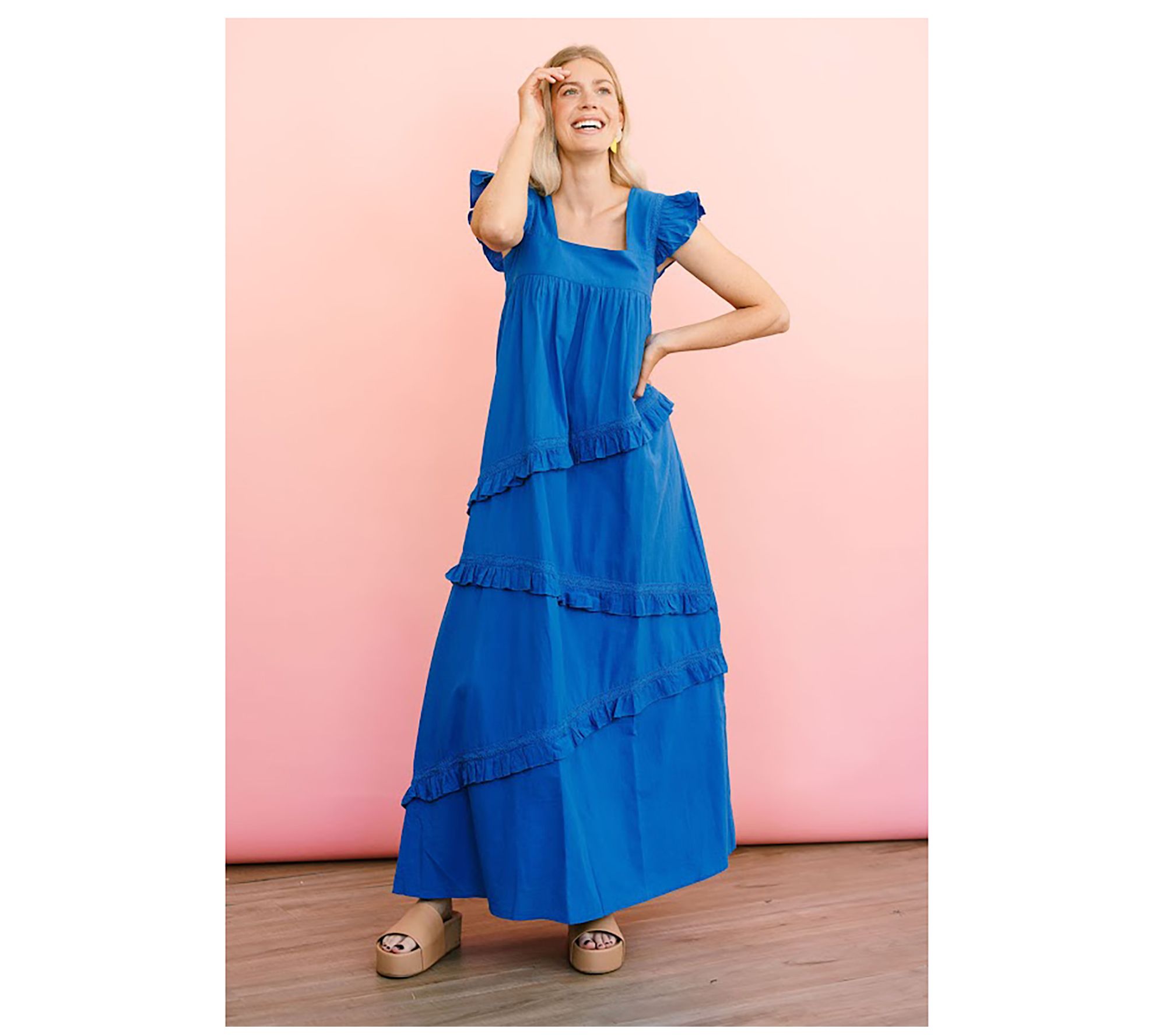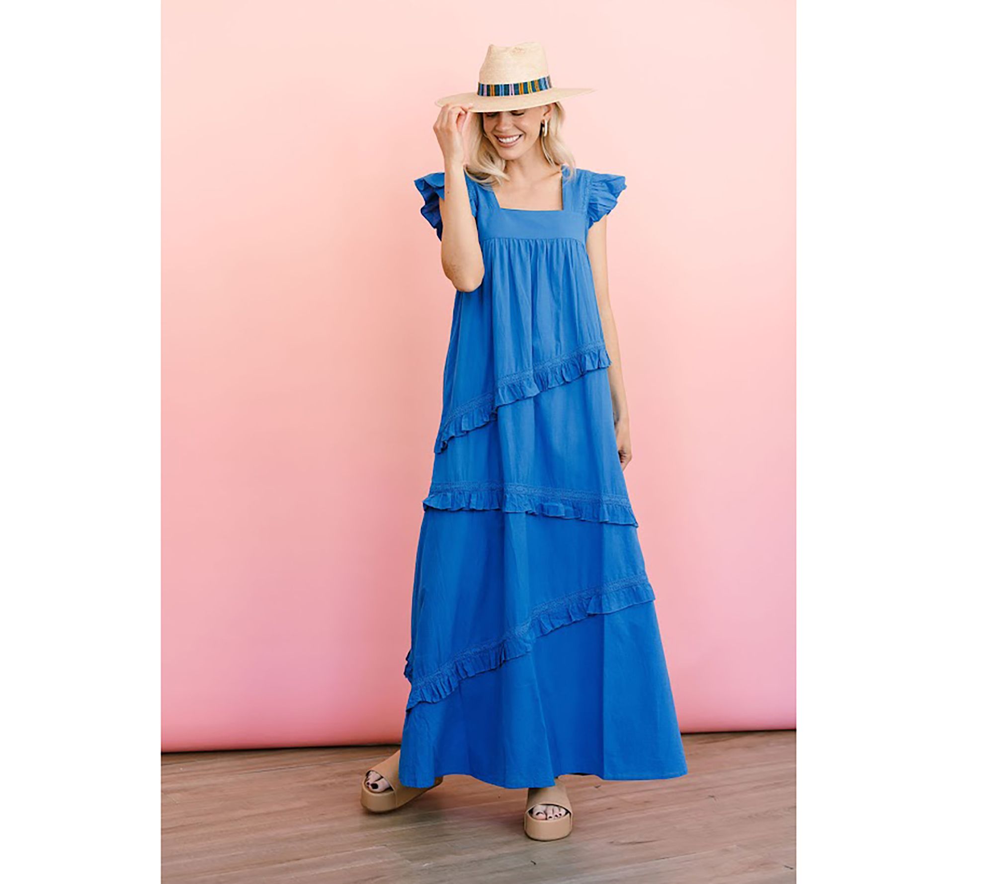 Sunshine ready! This ankle-length maxi dress is crafted in comfy cotton with flutter sleeves and charming ruffle detailing across the bodice. From Sunshine Tienda.