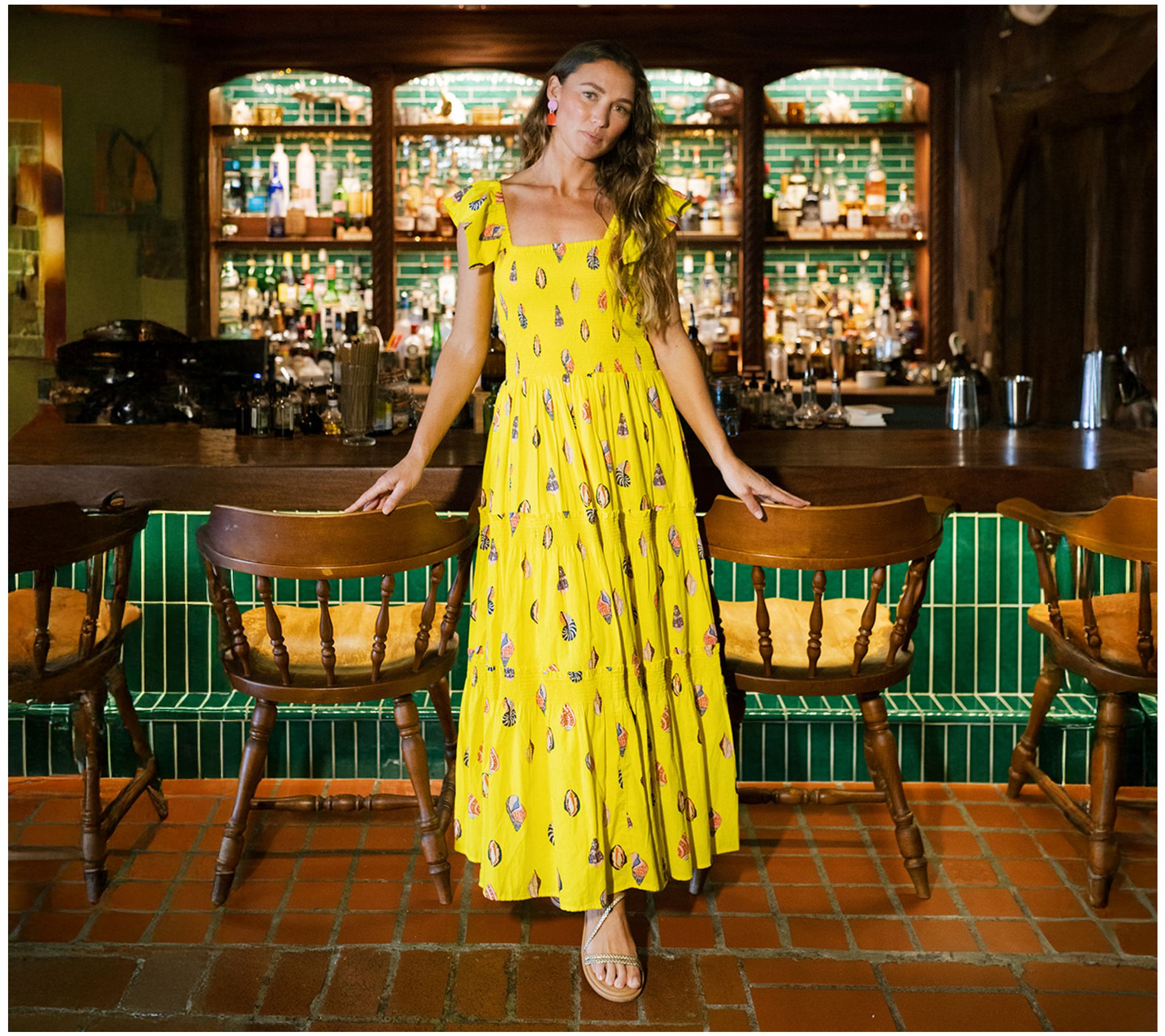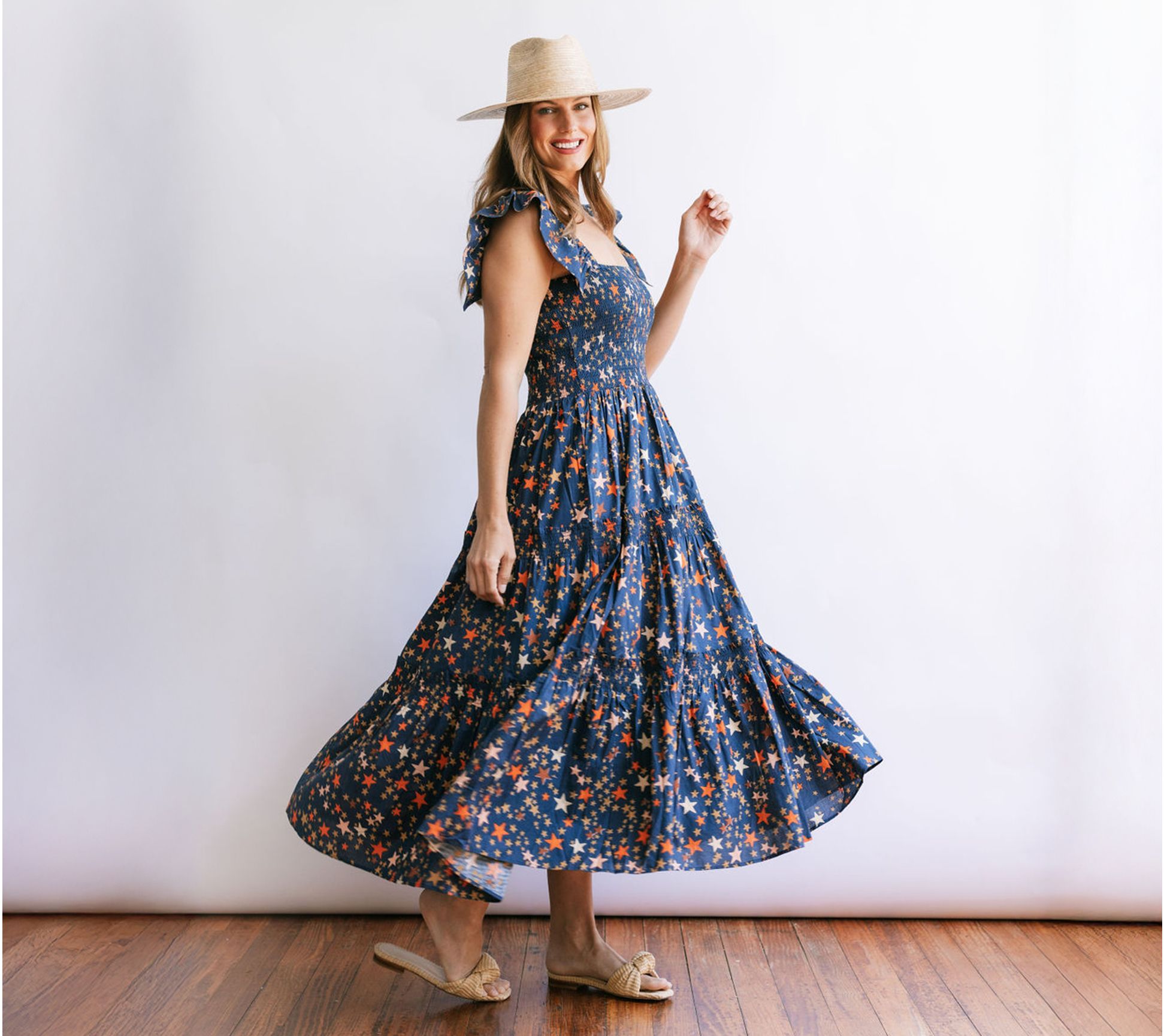 Float through your warm-weather days in this delightful tiered midi dress, perfect for everything from brunches to beach walks. The smocked bodice and ruffled elastic straps add a comfortable stretch, while the mid-calf length skirt moves beautifully with every step. From Sunshine Tienda.