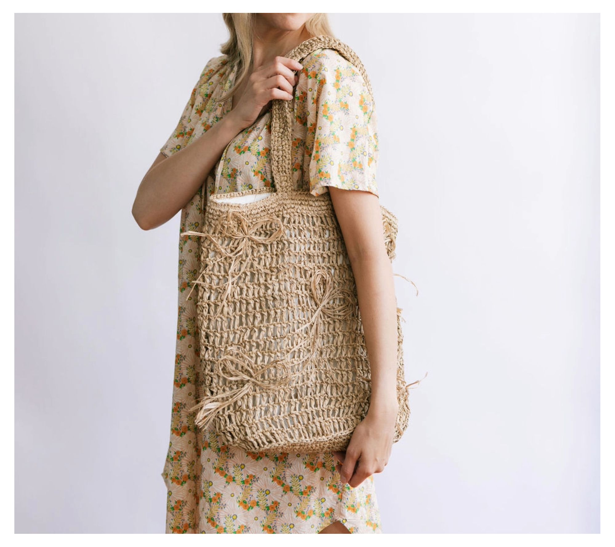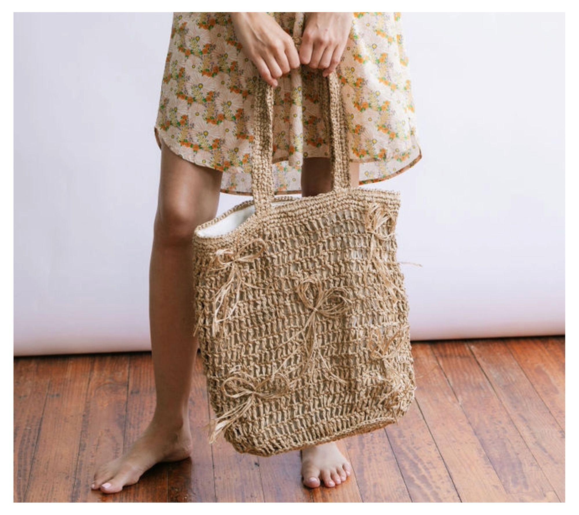 Perfect for a day at the beach or a summer outing in town, this raffia ribbon bag is your go-to accessory for sunny days. Woven from raffia, it boasts charming bow details that add a playful touch to your outfit. With a soft cotton-lined interior, you can easily store your essentials while maintaining a breezy, laid-back vibe. From Sunshine Tienda.