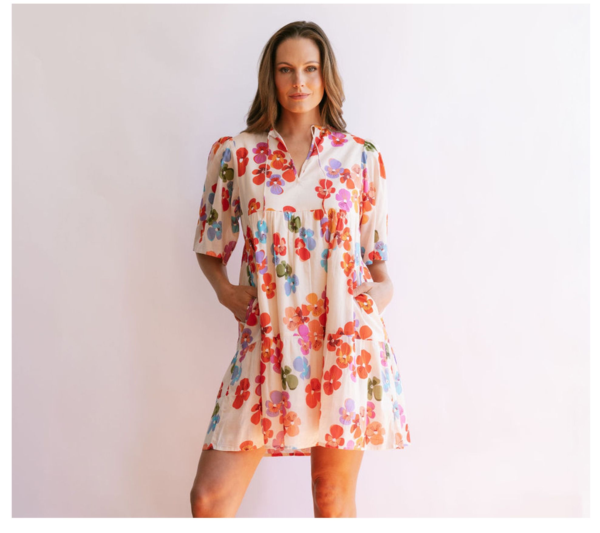 • Features: rainbow floral print, short sleeves, V-neckline with tie, tiered silhouette