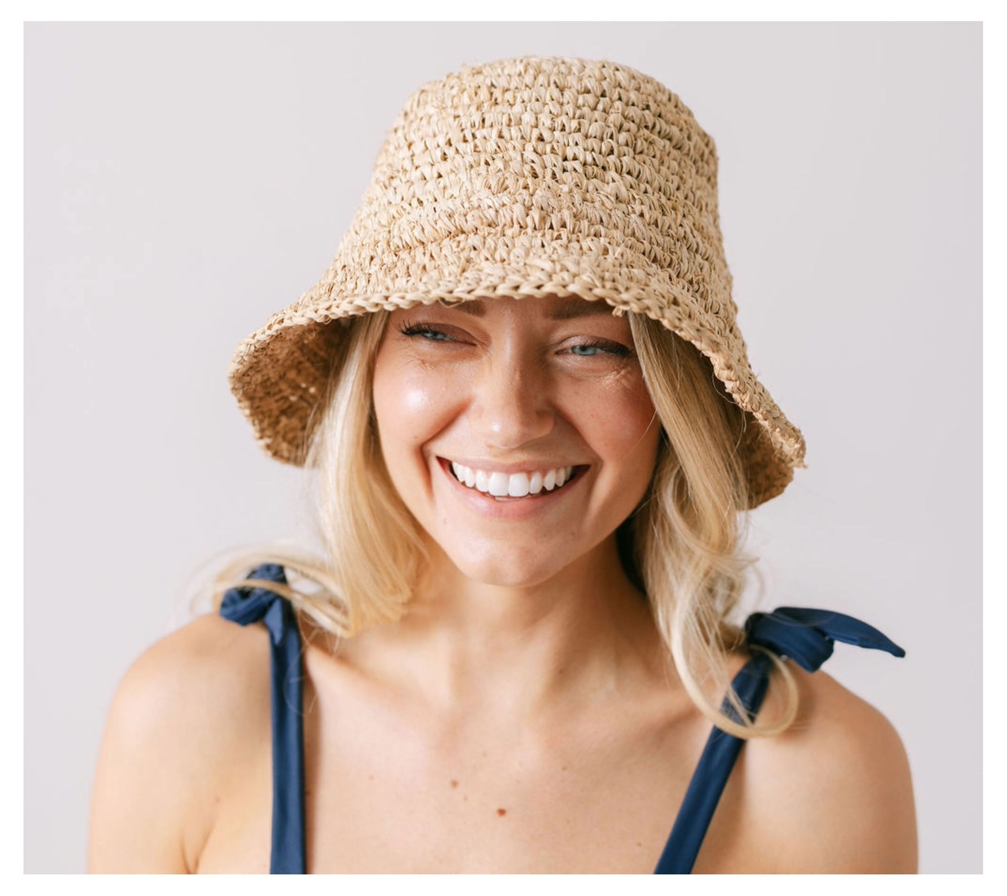 • Features: floppy natural raffia woven bucket hat