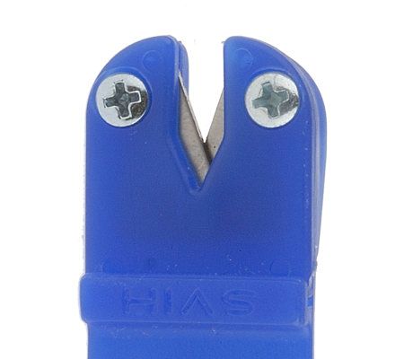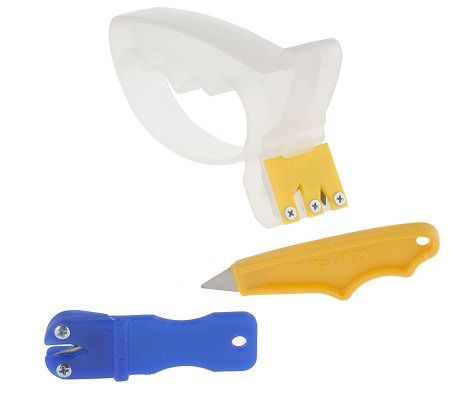 Keep kitchen knives in pristine condition with the Super Sharpener three-piece set. The carbide blades give all types of knives razor-sharp, round edges. The large tool is marked with an icon that identifies the types of cutlery it sharpens, including scissors, shears, blades, and peelers.