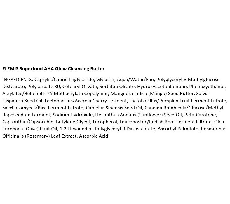 Superfood AHA Cleansing Butter is a facial cleanser containing exfoliants that have been shown to help improve the look of skin texture. Containing a unique blend of pumpkin fruit and acerola cherry, the butter helps remove makeup and daily grime to reveal a more healthy-looking radiance to the skin.How do I use it: Use every morning and evening. To use as a makeup remover, apply to a cotton pad and wipe gently over the face and eyes.To use as a daily cleanser, massage a coin-sized amount into dry skin and rinse off with warm water.To use as a deep cleansing mask, apply a thin layer to the face and leave on for one minute before rinsing. From ELEMIS.Includes: