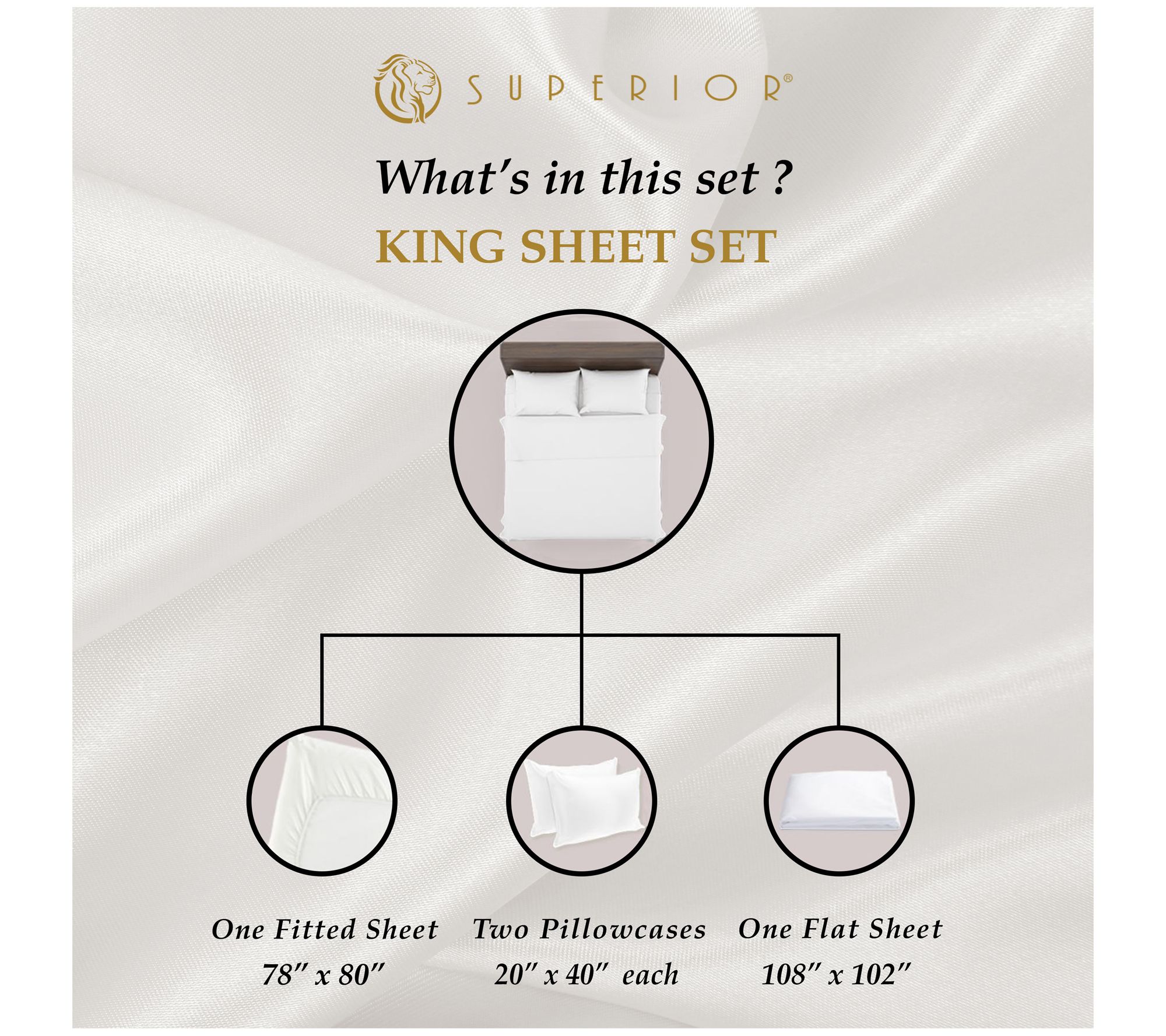 • King sized: Flat sheet 108" x 102"; Fitted sheet 78" x 80" x 18" pocket depth; Pillowcases 20" x 40"