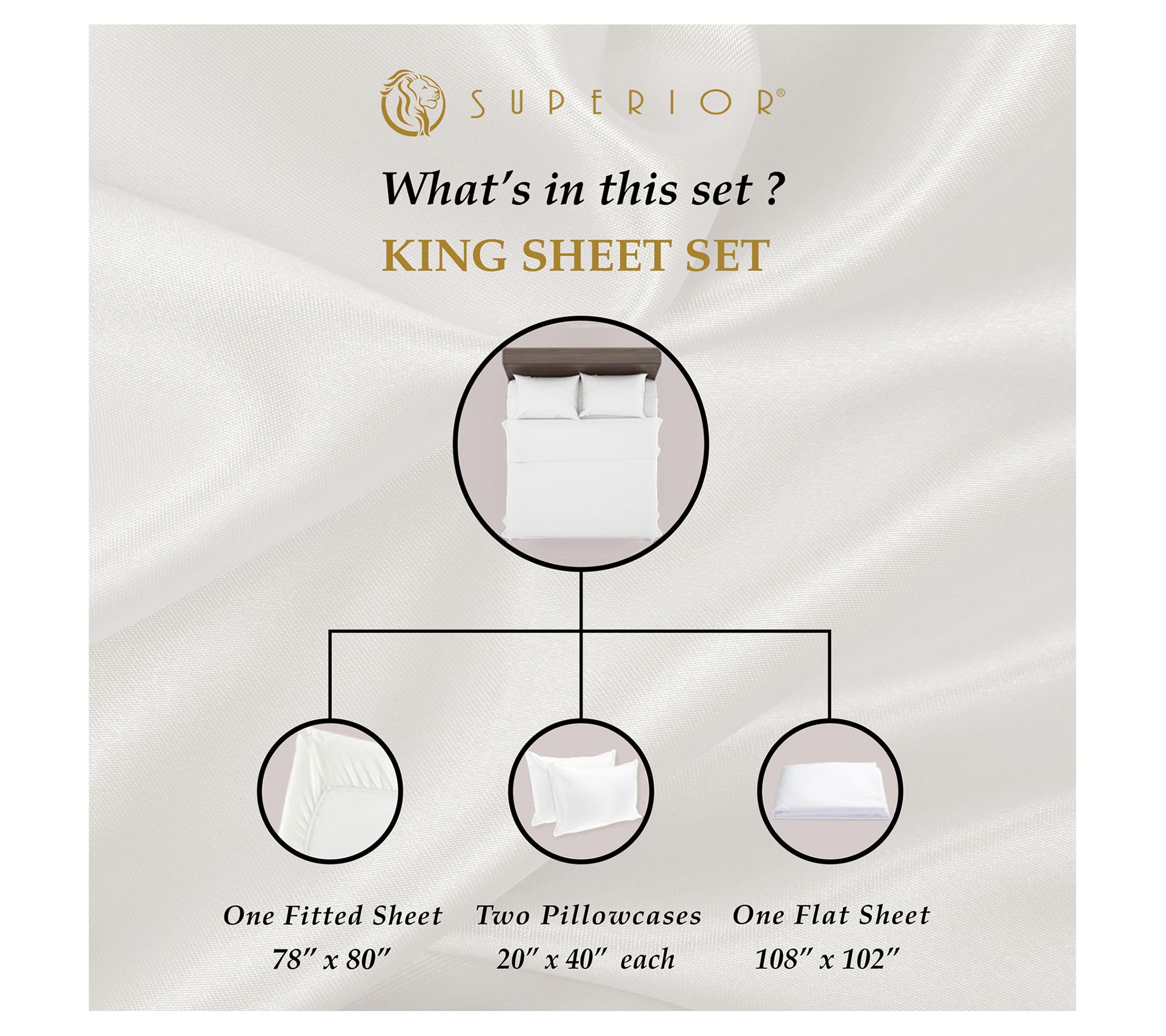 • King sized: Flat 108"W x 102"L; Fitted 78"W x 80"L x 18" pocket depth; Pillowcases 20"W x 40"L