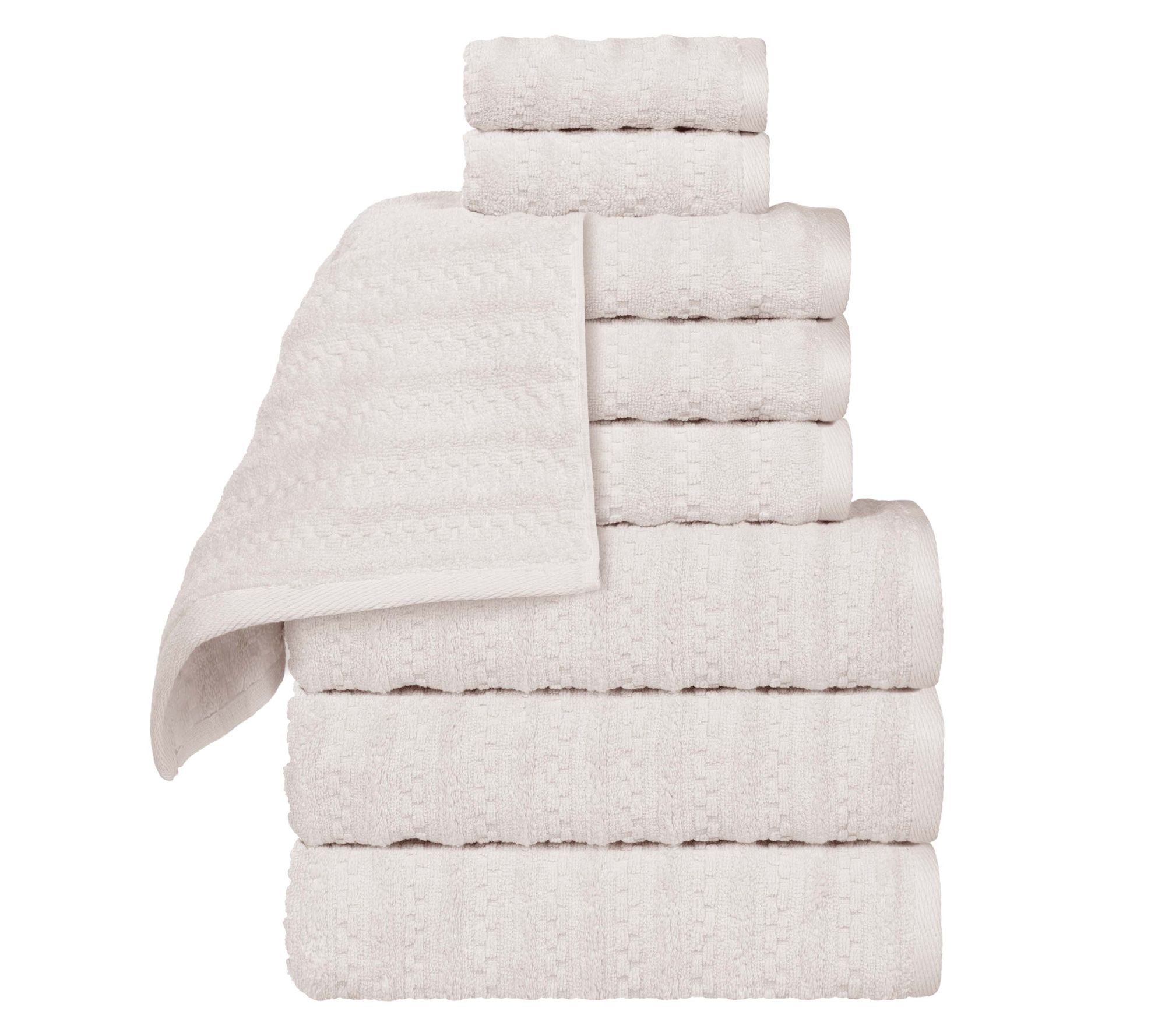 Wrap yourself in comfort with the Superior nine-piece Zuma Zero-Twist Cotton Soft Towel Set. Crafted from 100% cotton, these towels feature a waffle textured stripe, offering a spa-like elegance to any bathroom. Their zero-twist weave provides an incredibly absorbent and quick-drying experience. From Superior.