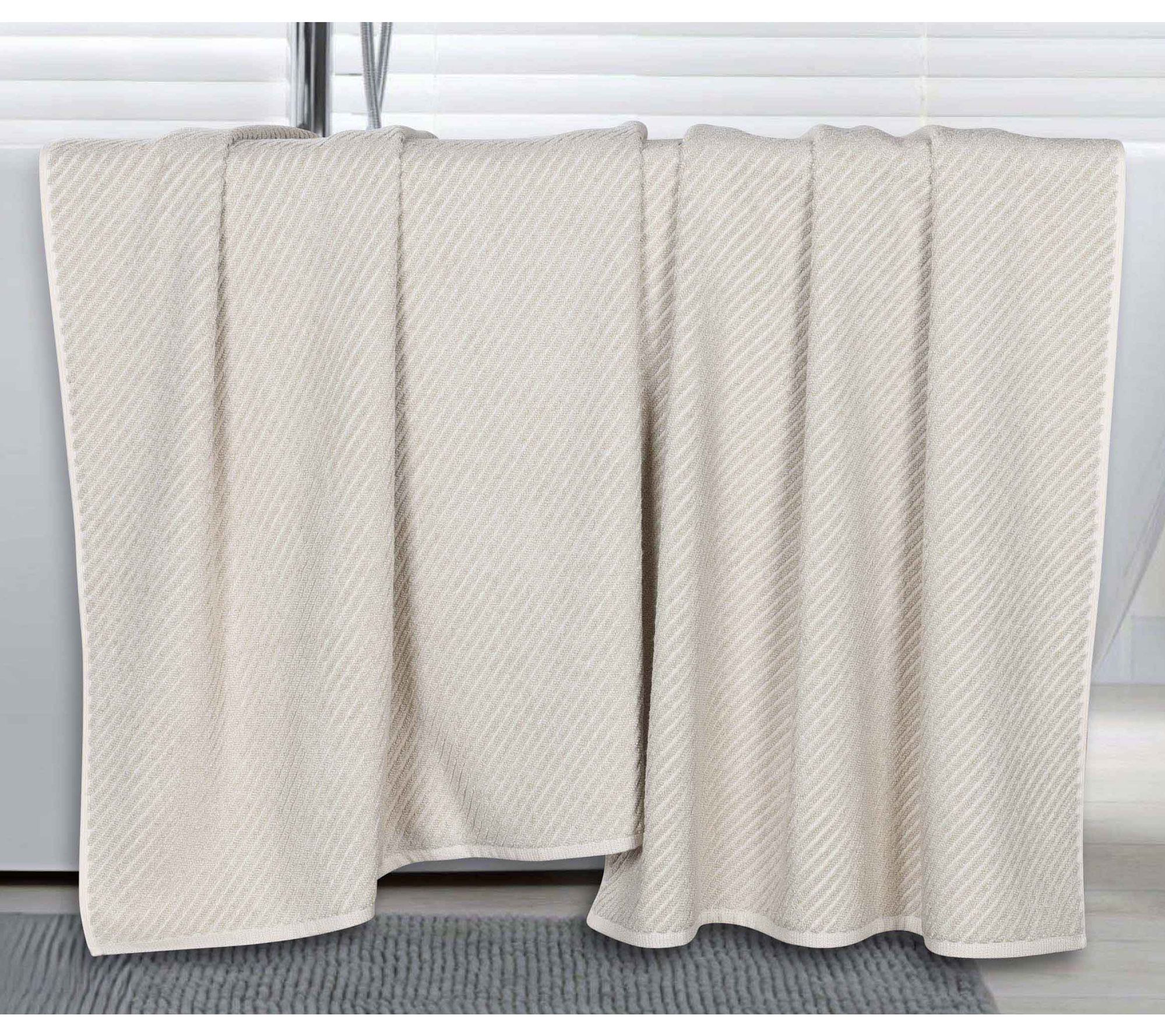 Bring soft comfort and a modern look to your bathroom with this set of two bath towels. Crafted from a cotton blend with a melange effect, these towels offer superior absorbency and a chic diagonal striped pattern. The attached hanging loop makes them easy to store, while the machine-washable design simplifies care -- just wash with like colors and tumble dry low to keep them looking vibrant.